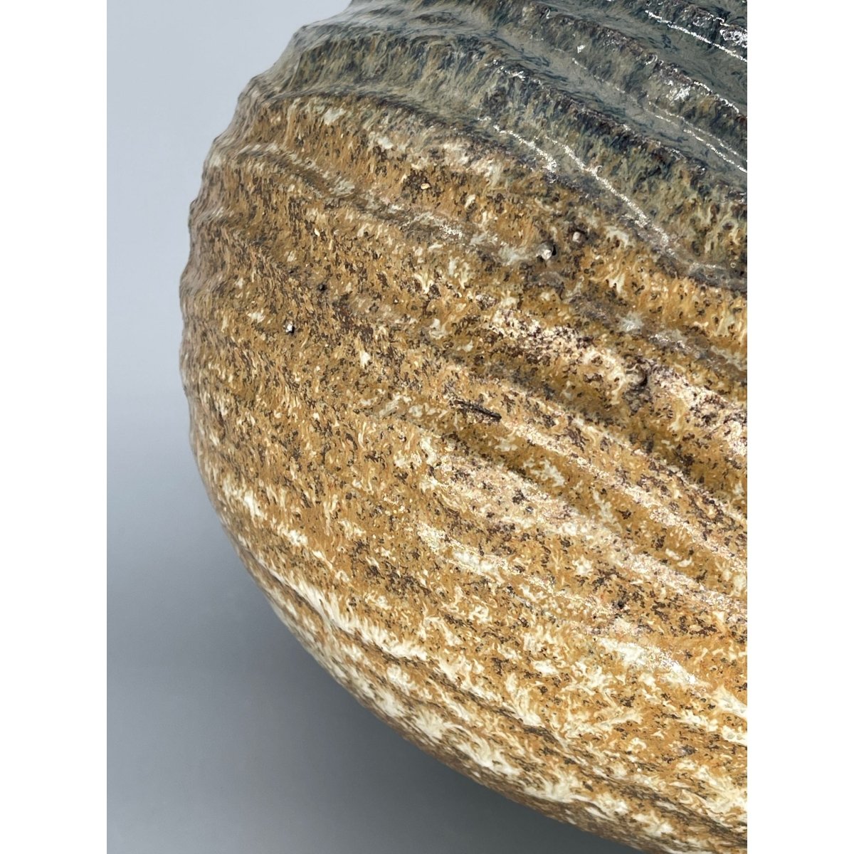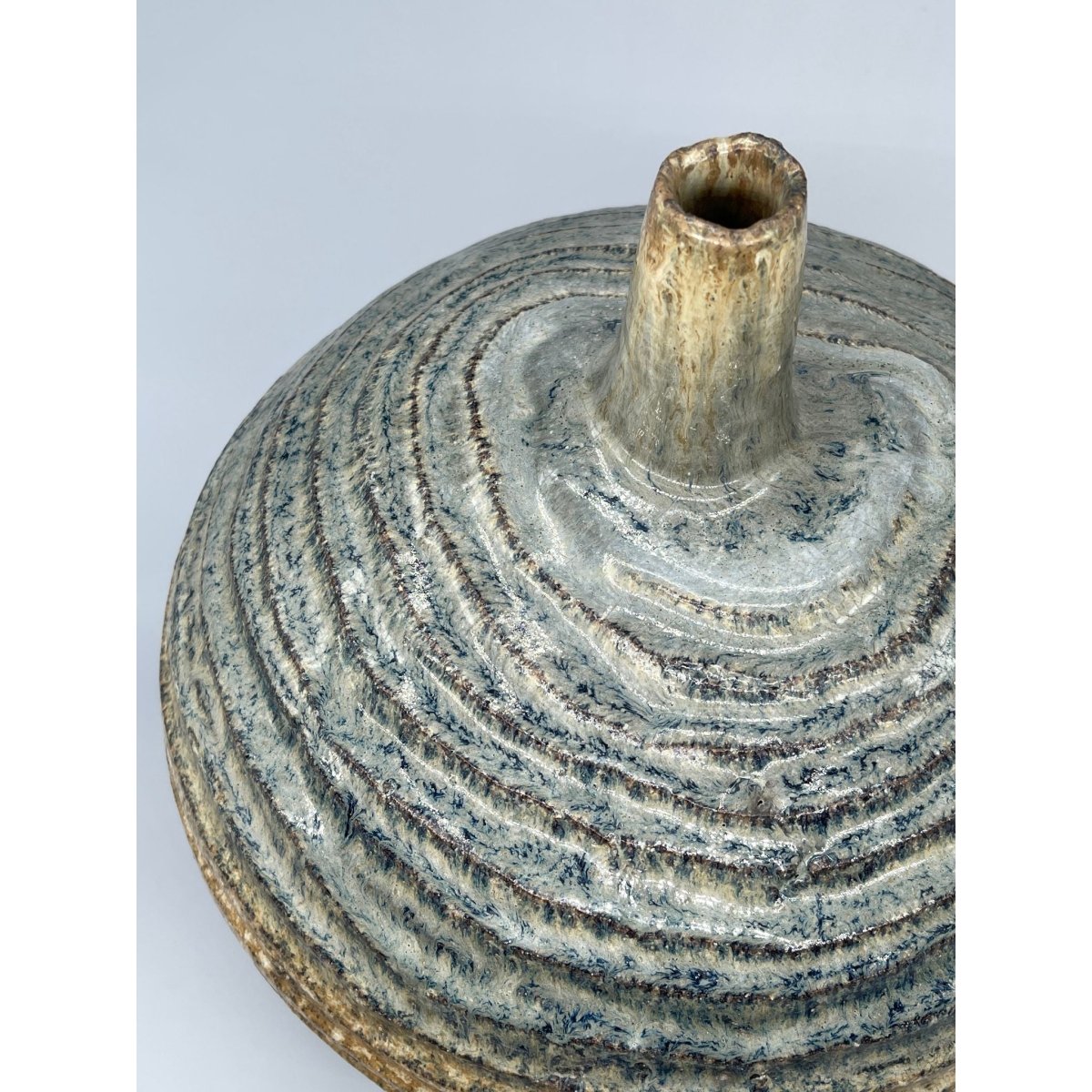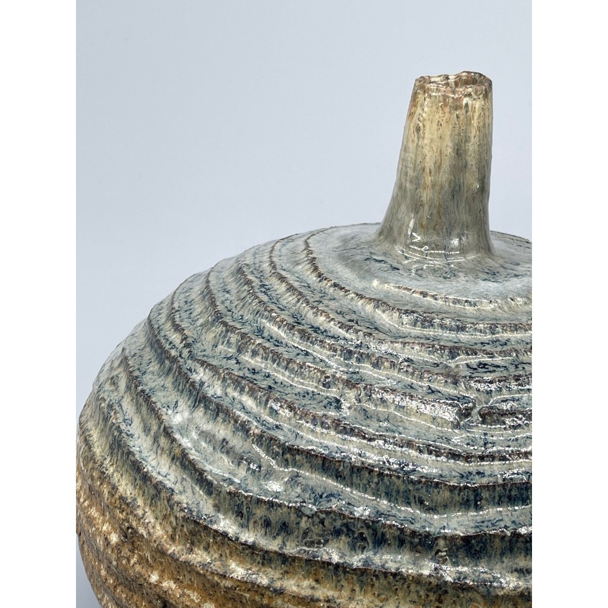 This piece features an earthy glaze of greens, blues, and browns, an interesting ridged shape, and a narrow opening.