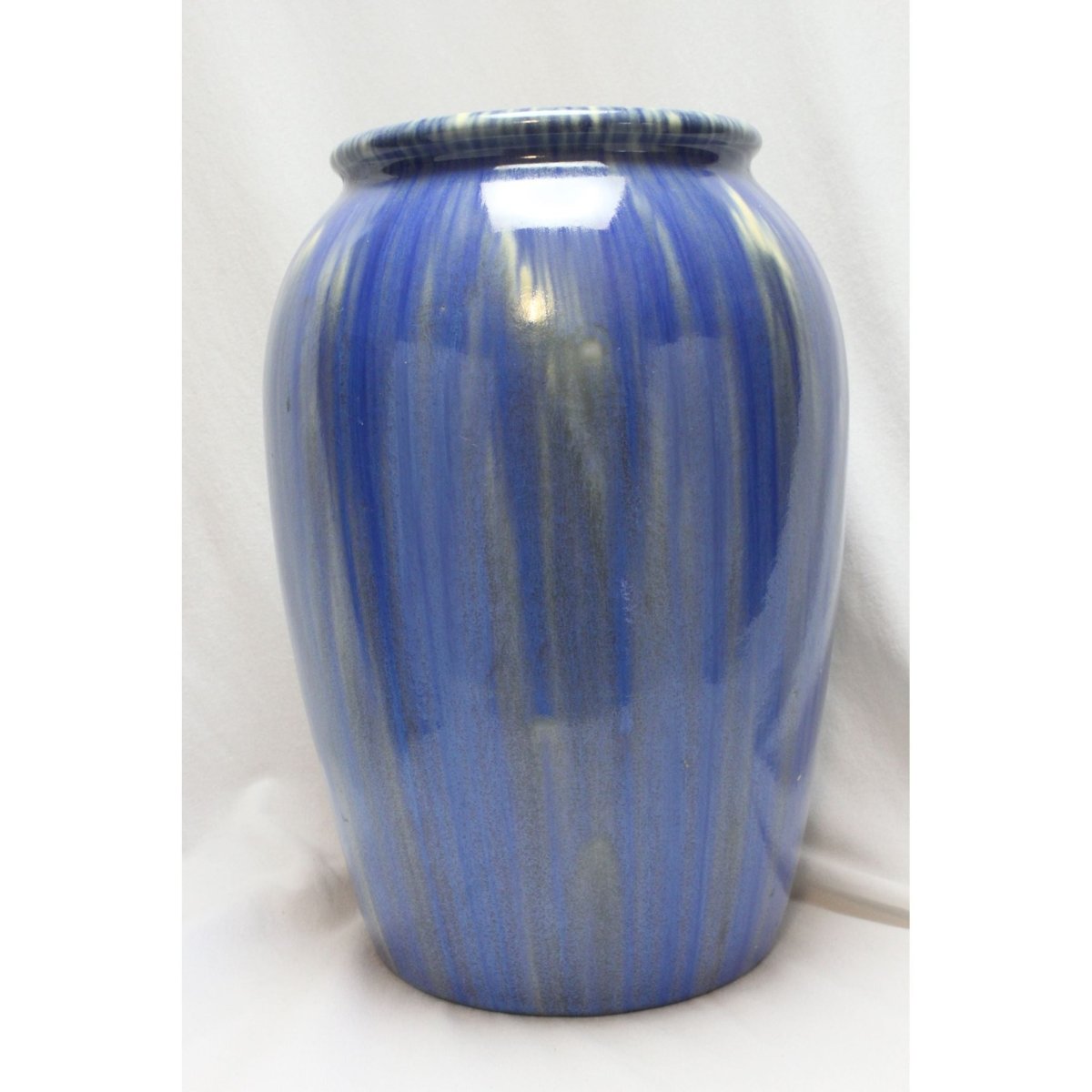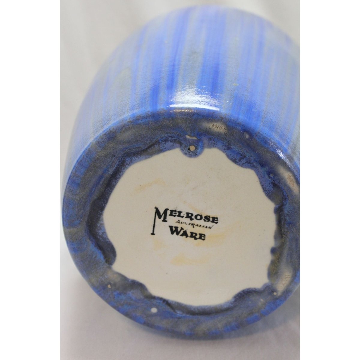 This tall Melrose vase stands 250 mm high and has a diameter at the shoulder of 180 mm. The decoration is done with a medium blue colour smooth glaze above a dark tan colour glaze that has a textured finish which provides a nice contrast. These have been put on sparingly at the top allowing streaks of the yellow colour of the clay to be seen on the shoulder under the final clear glaze. It has one very small, shallow chip to the shoulder-approximately 2 mm x 1 mm. It dates from the period 1931-40.