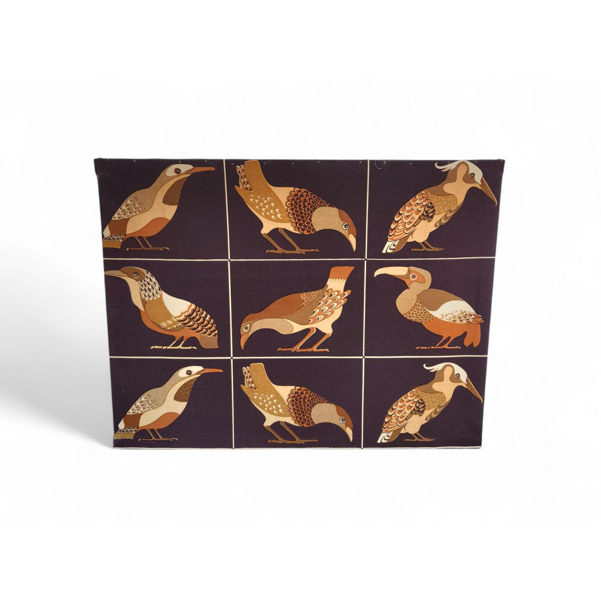 Full of personality, this mid-century ready-to-hang fabric wall panel showcases nine charming stylised birds in a bold grid format.