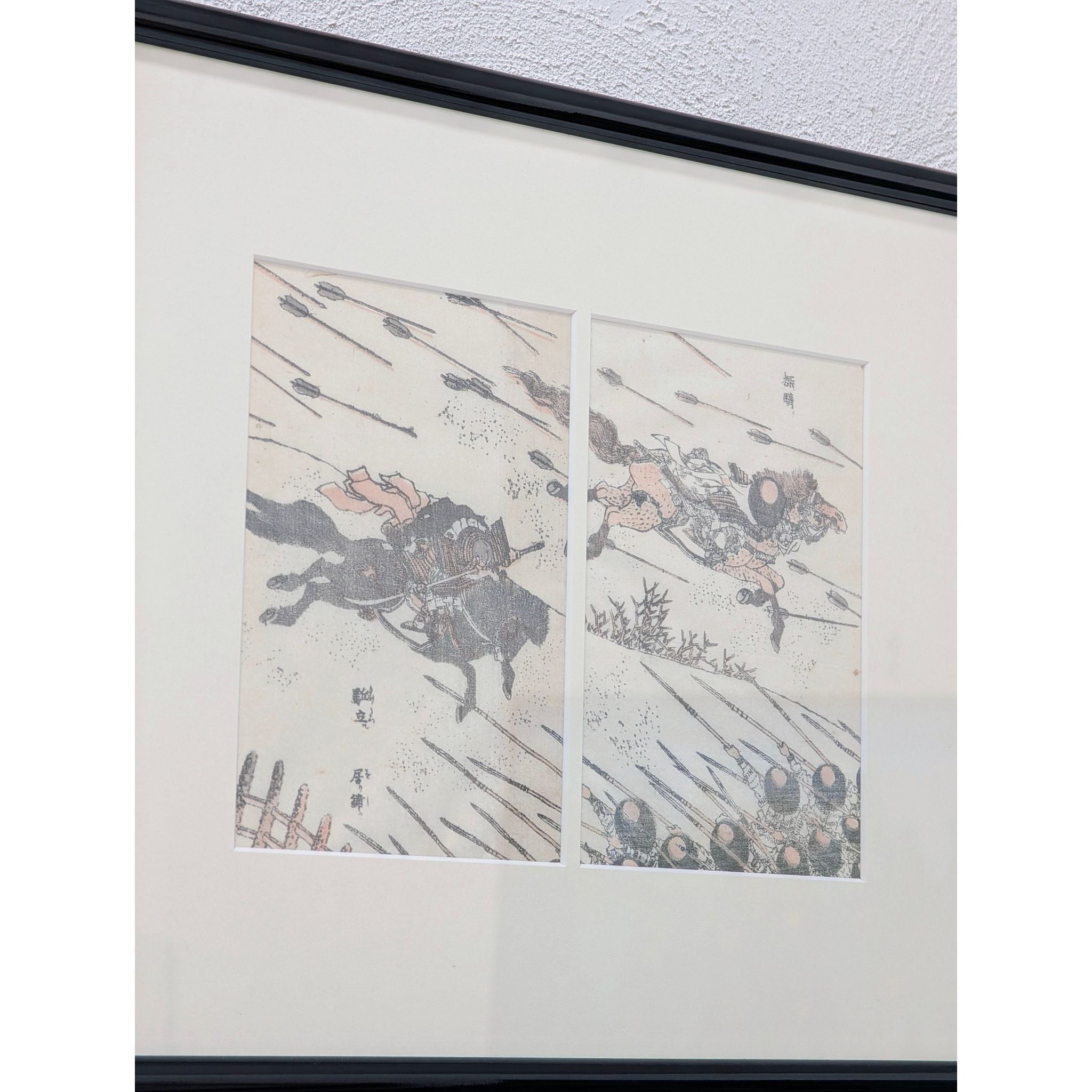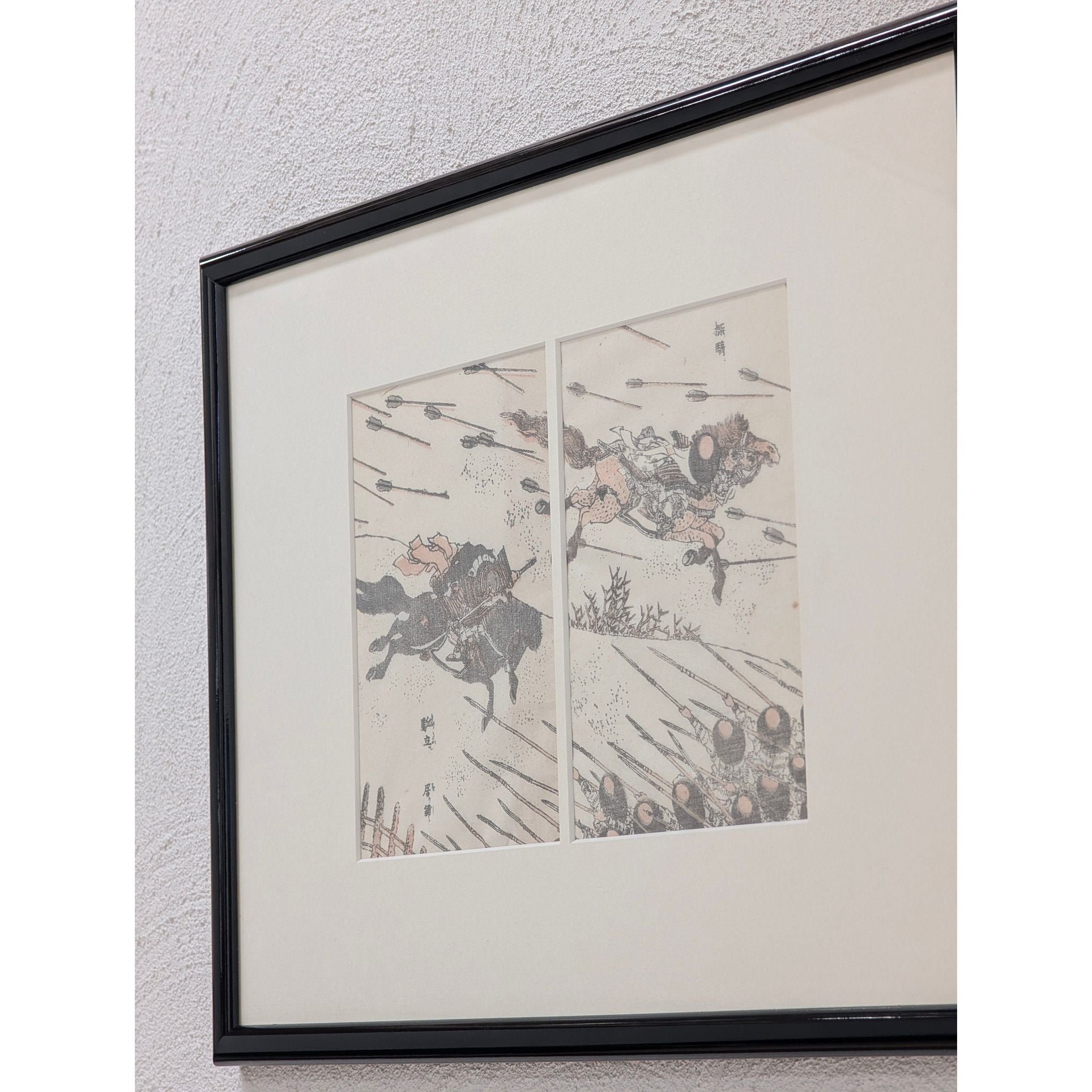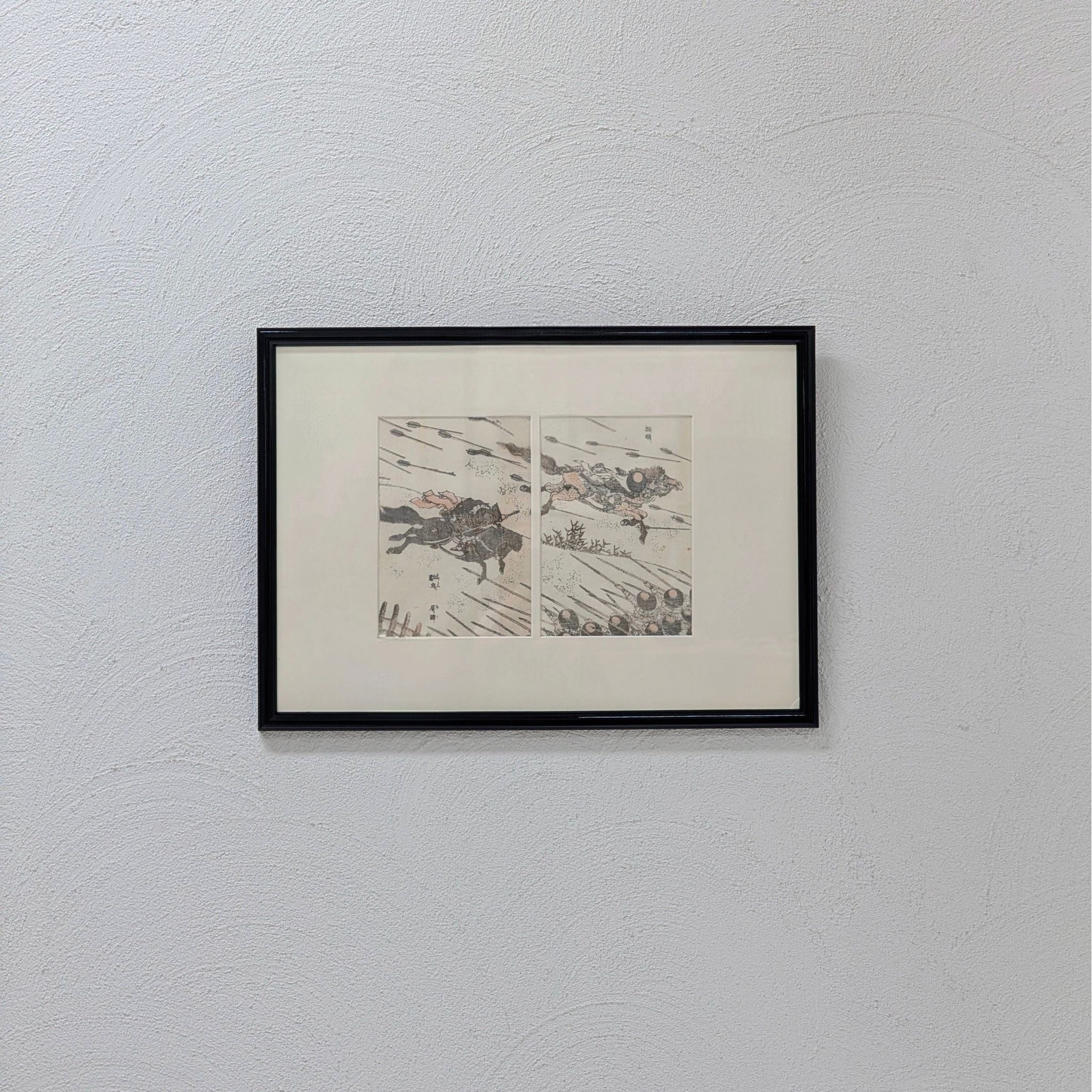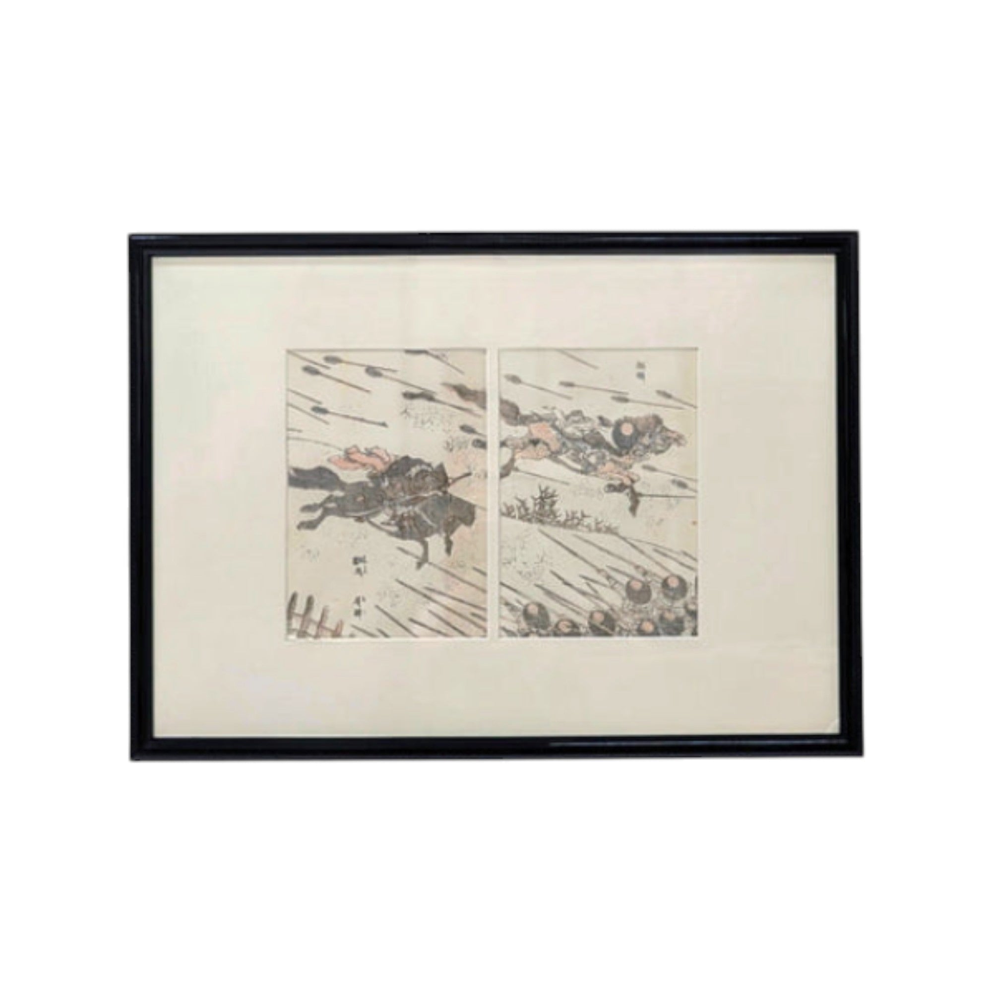 Drawn from Volume 9 of the famous Hokusai Manga (Kyu-hen), this piece captures a chaotic and thrilling moment of samurai warfare. The scene depicts two mounted warriors galloping through a hail of falling arrows, while foot soldiers with pikes swarm in the foreground. It perfectly exemplifies Hokusai’s genius for capturing motion and kinetic energy in a static medium.