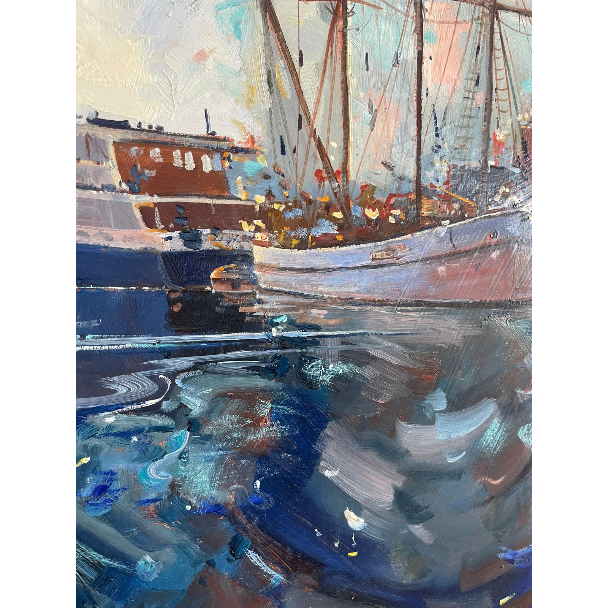 This piece captures a moody coastal harbour scene with tall ships and layered reflections in expressive palette knife strokes. The texture throughout the water and sky is rich and dimensional a true statement artwork that elevates any space.