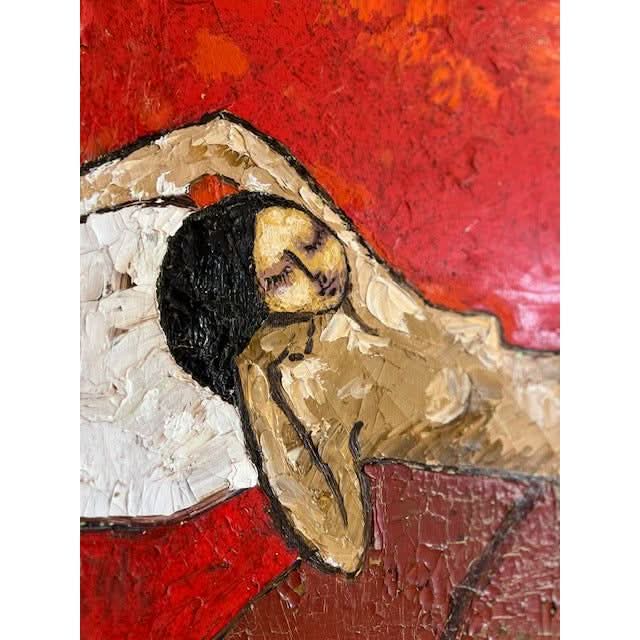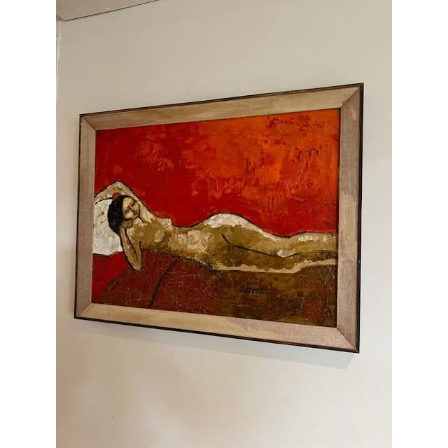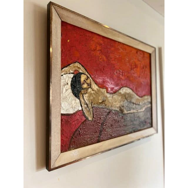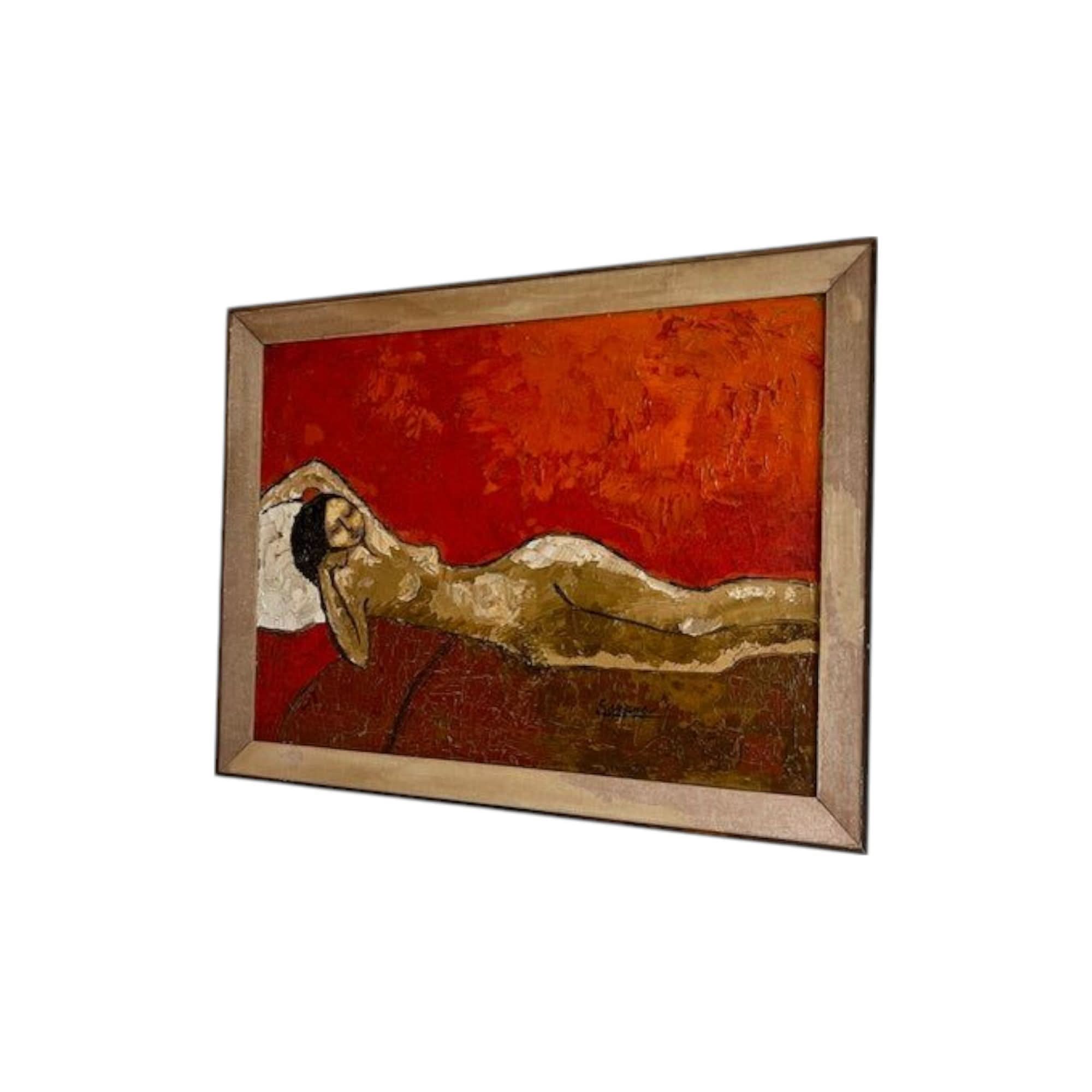 Original oil painting of nude. Gorgeous vintage tones. Very textured with visible crazing. Signed Sarena. 1972.