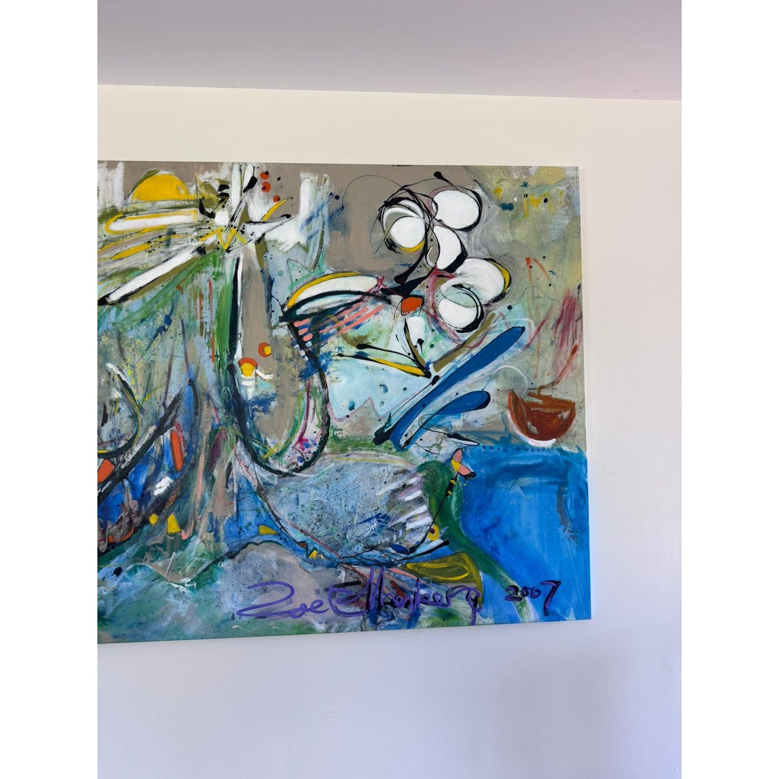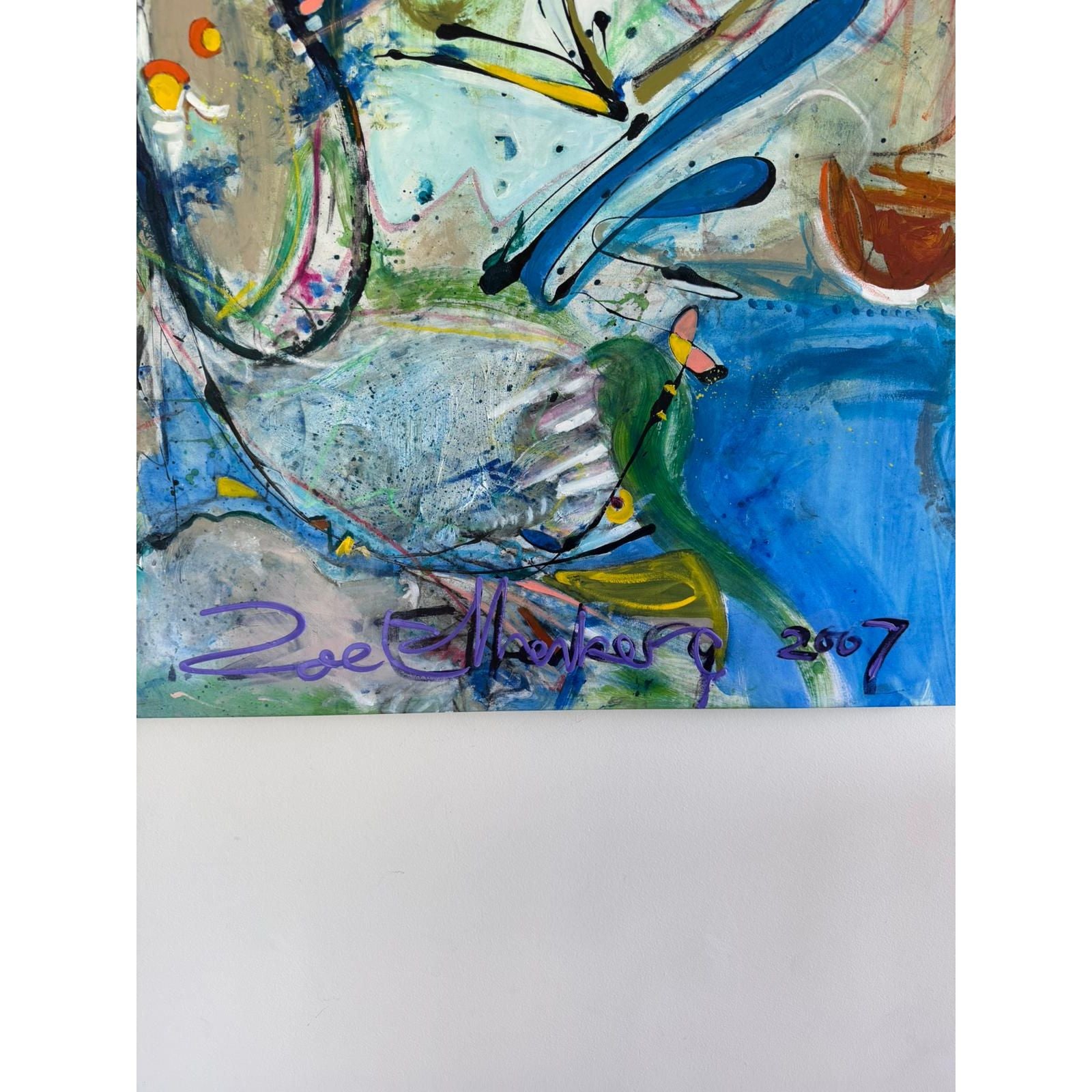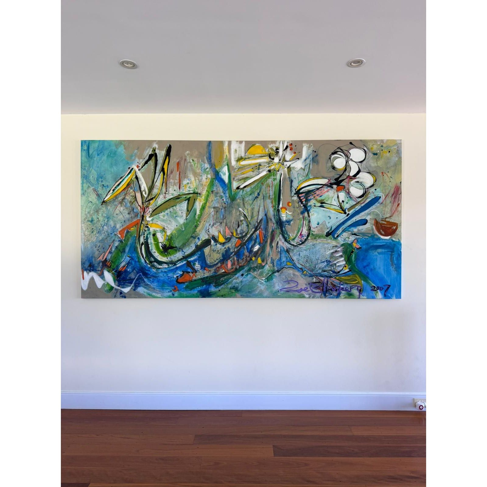 Striking large-scale original abstract painting by Melbourne artist Zoe Ellenberg, signed and dated 2007. This is a statement artwork with powerful movement, layered brushwork, and a rich palette of blues, greens, neutrals, and energetic accents.