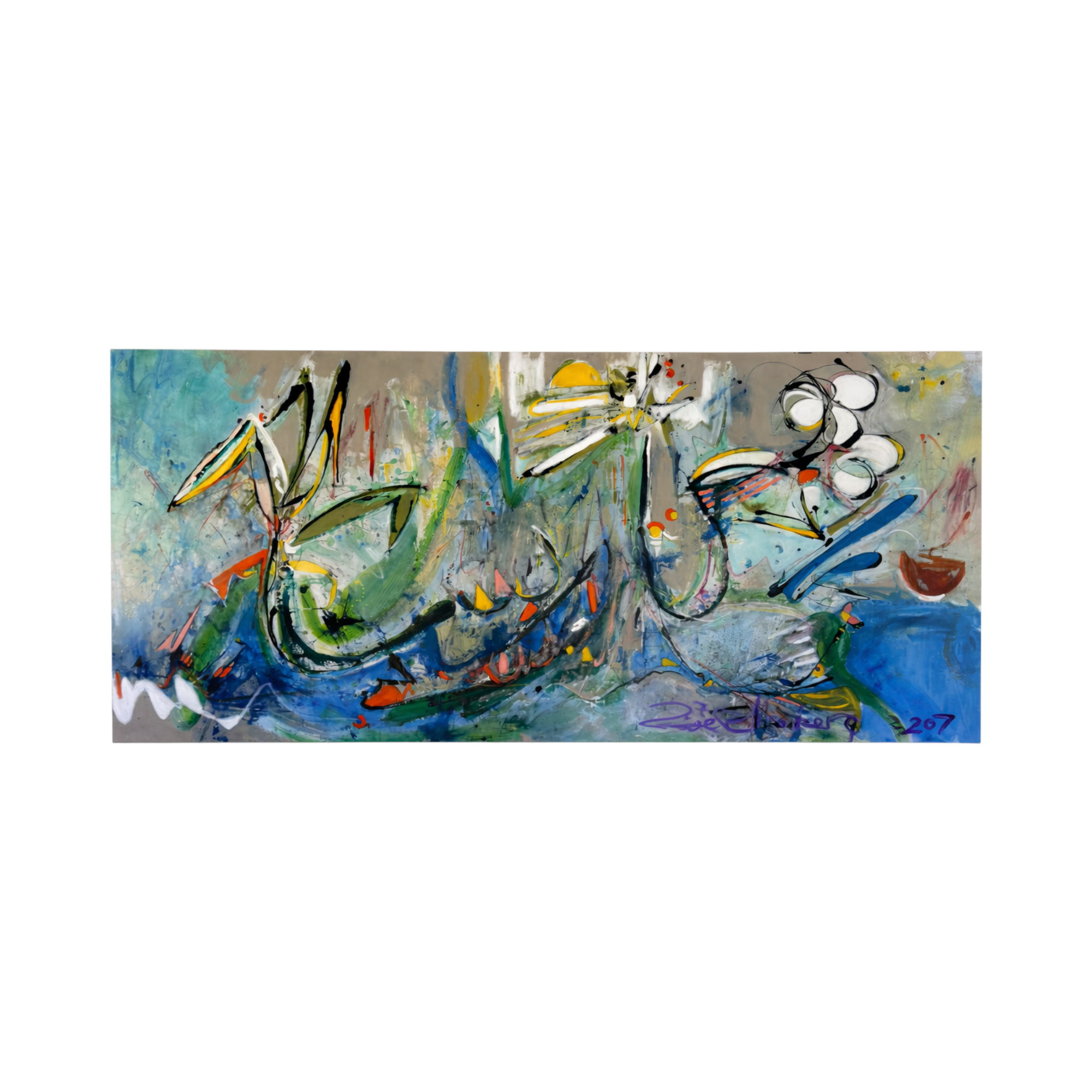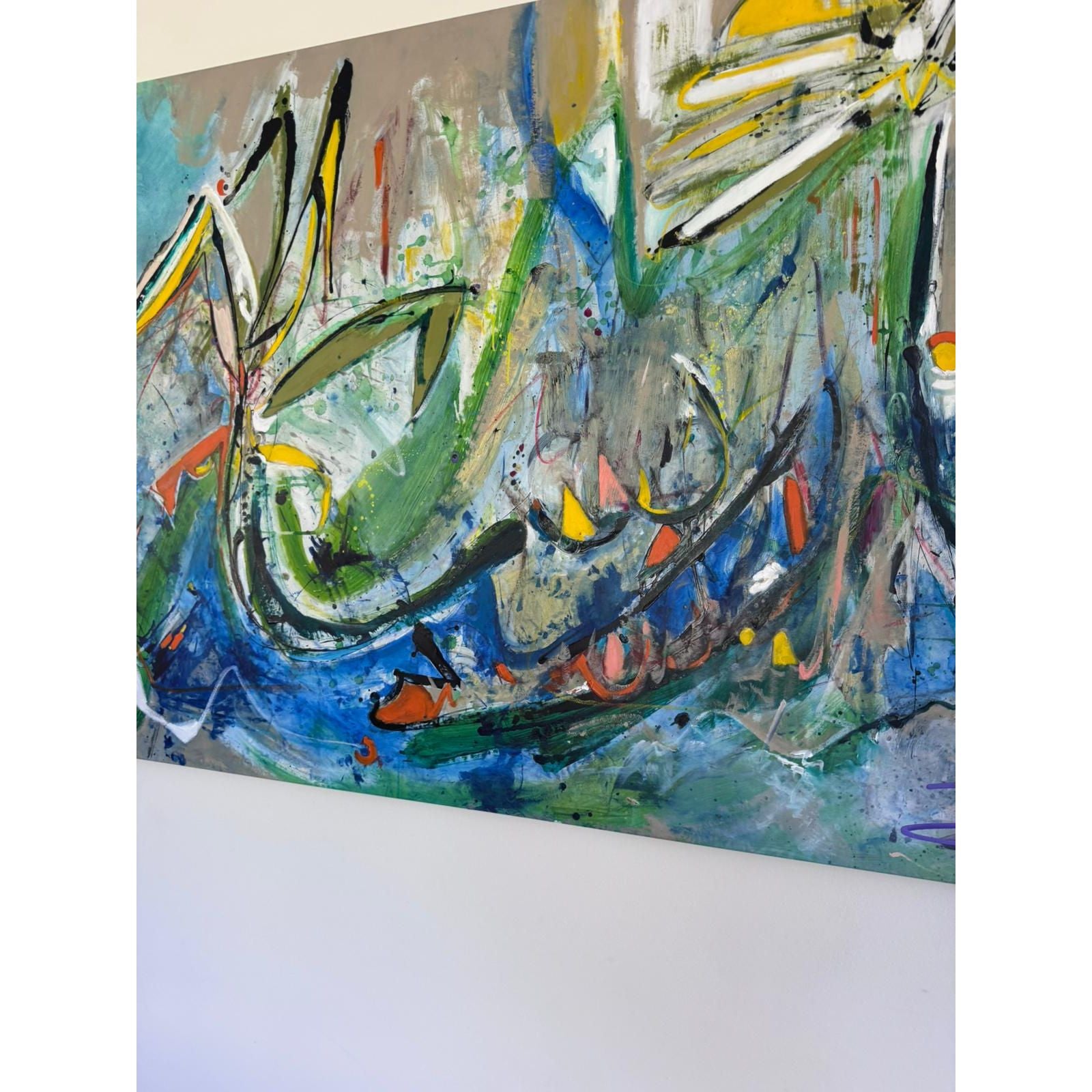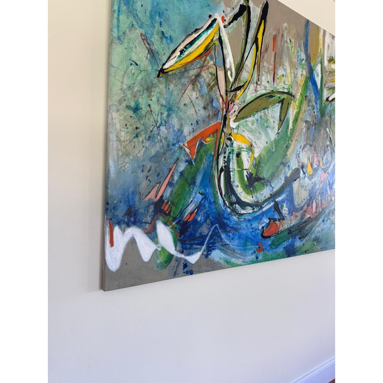 Striking large-scale original abstract painting by Melbourne artist Zoe Ellenberg, signed and dated 2007. This is a statement artwork with powerful movement, layered brushwork, and a rich palette of blues, greens, neutrals, and energetic accents.