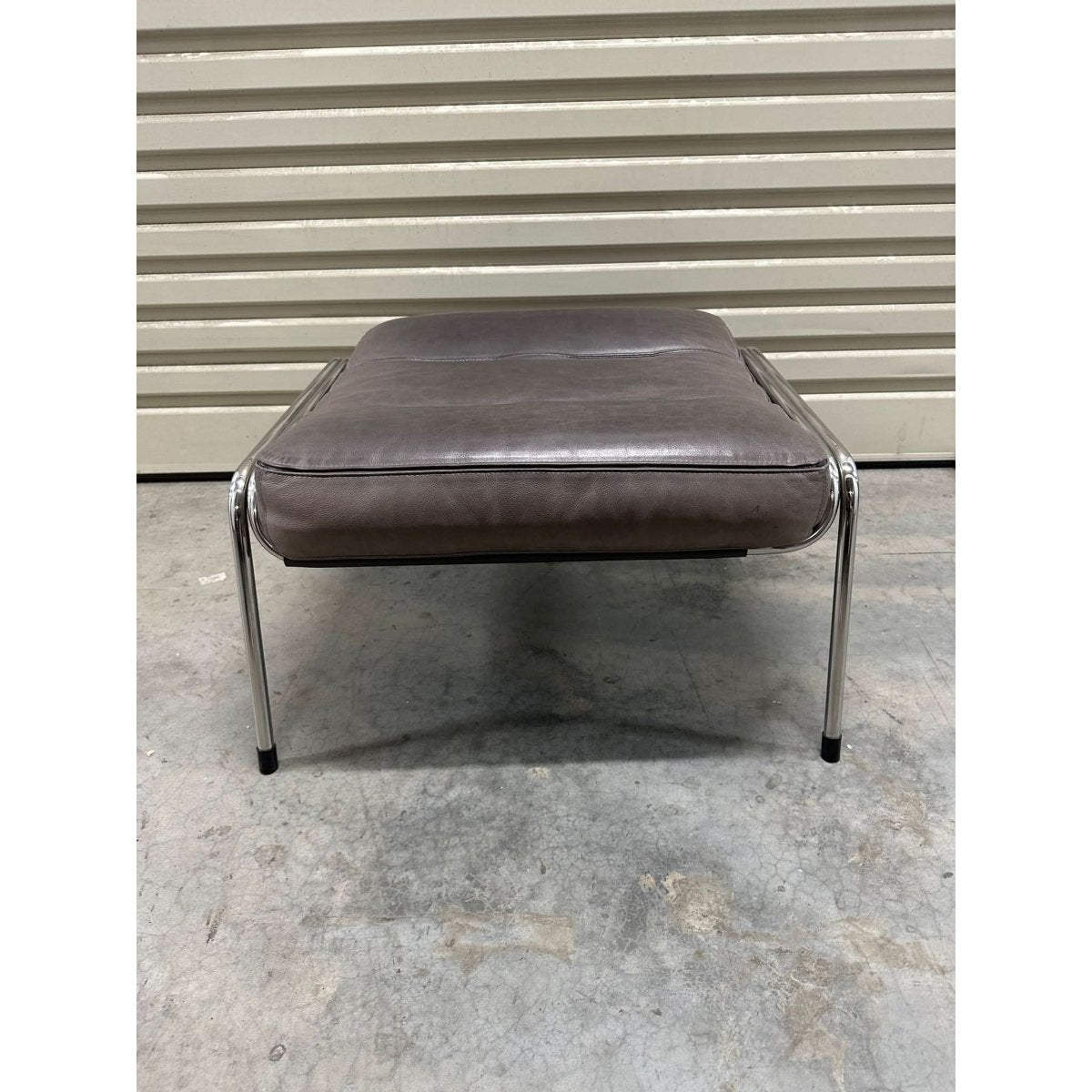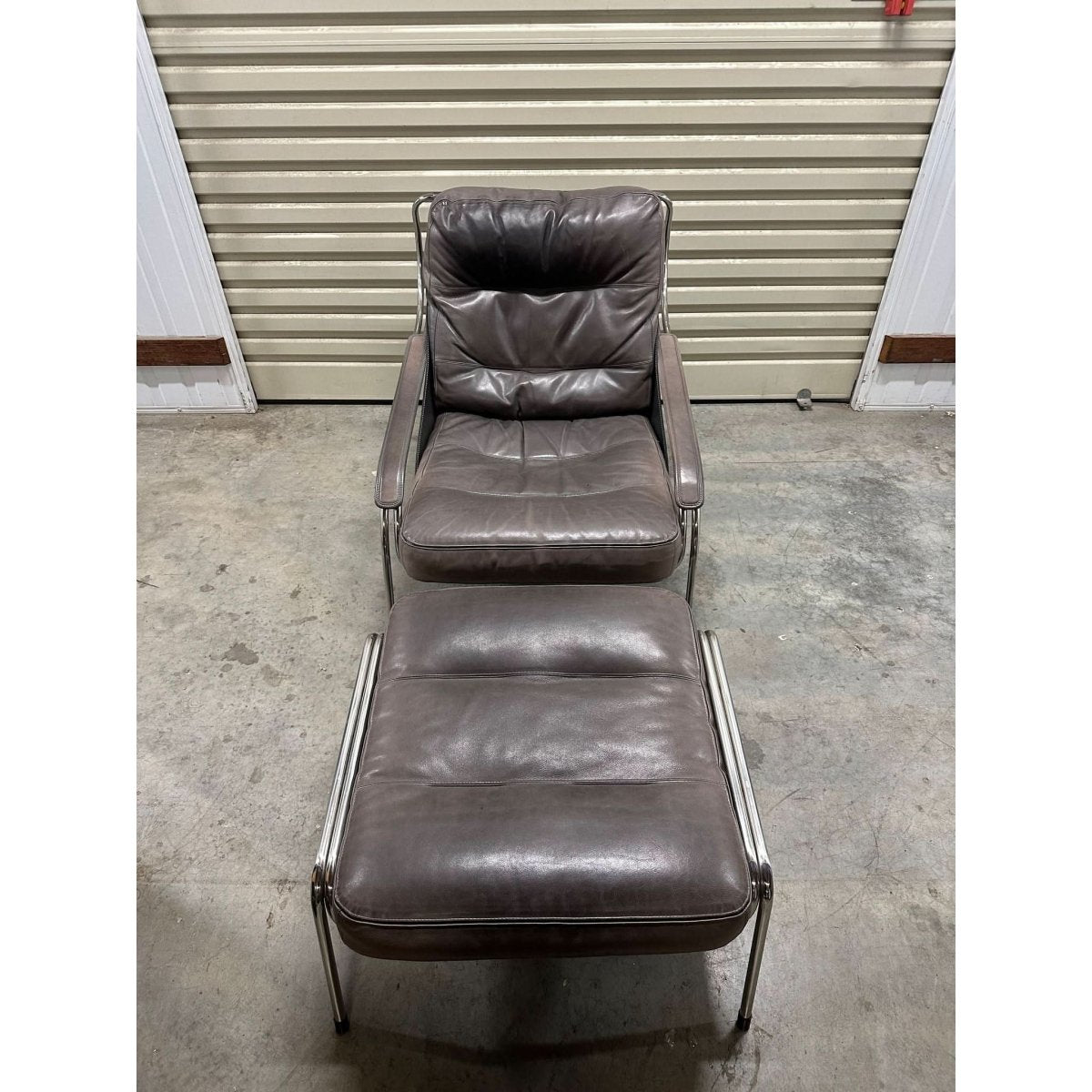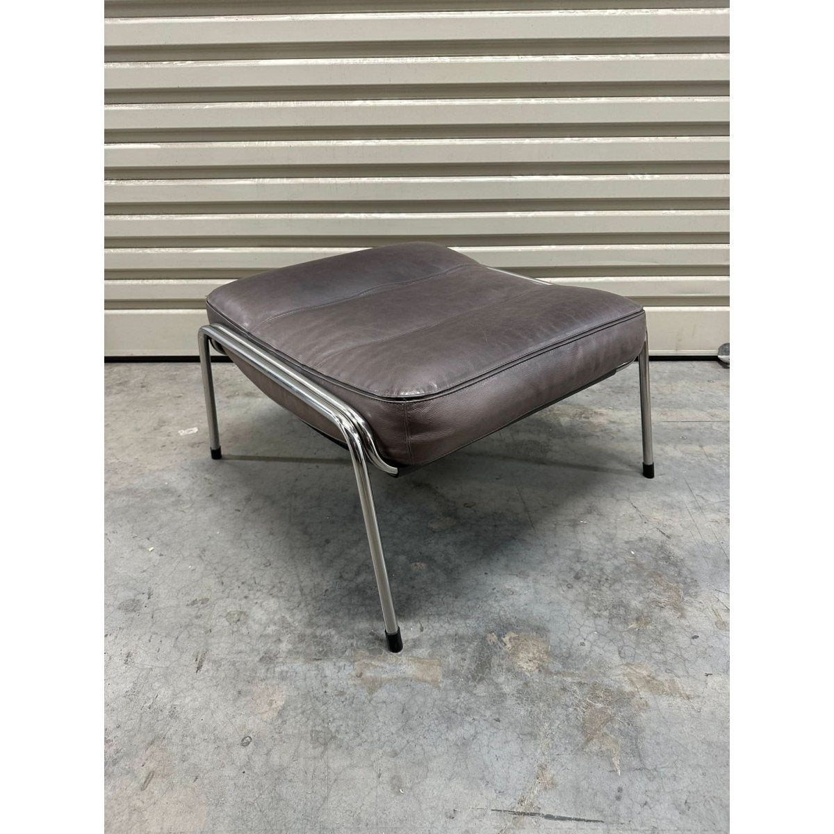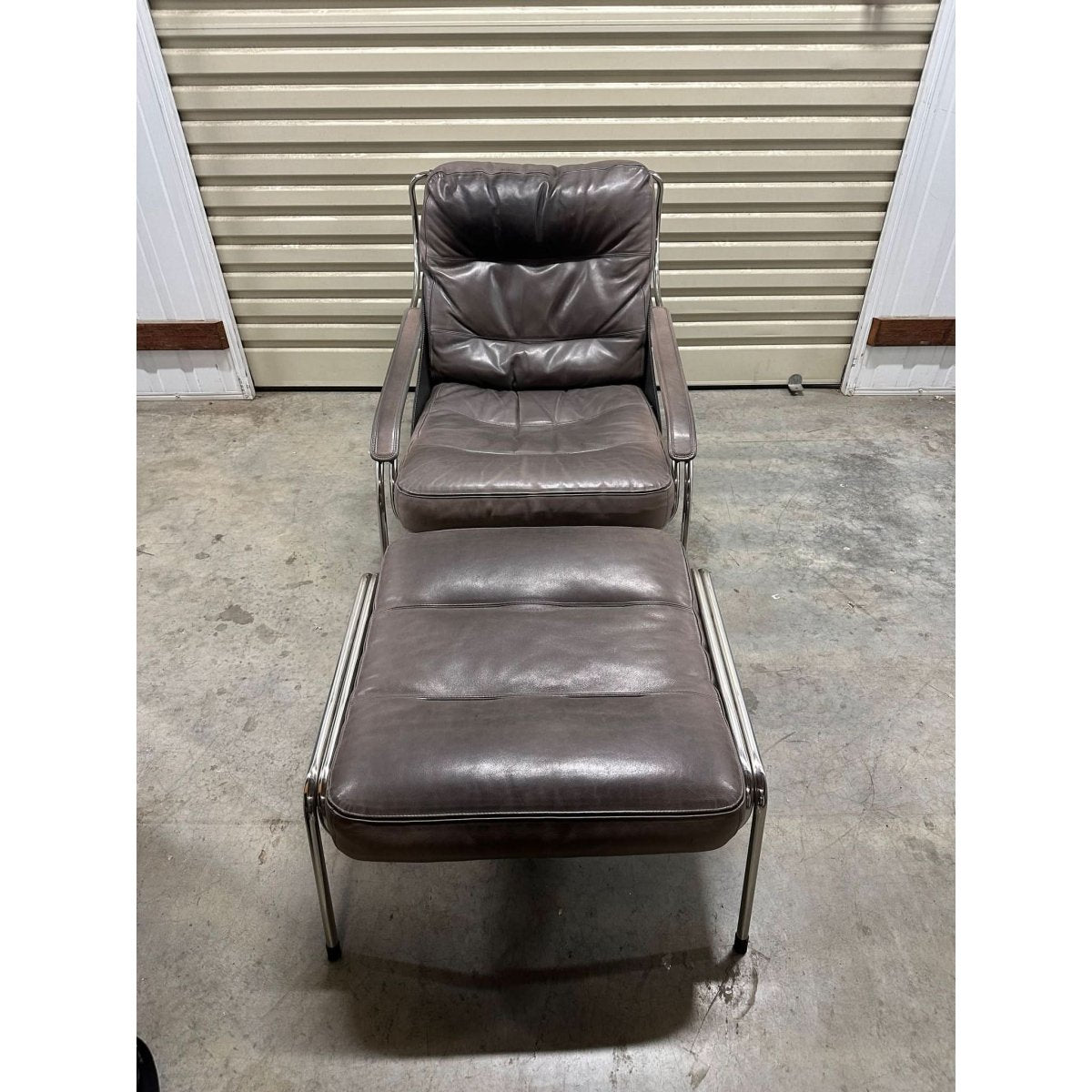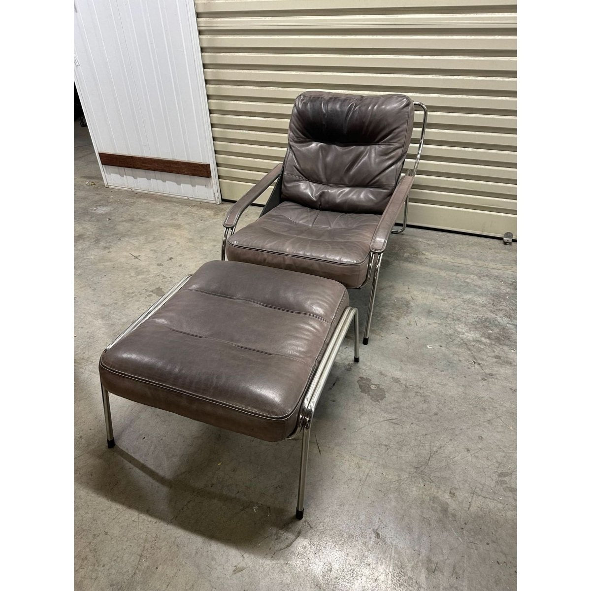 Awarded the gold medal at the Milan Triennale in 1948, the chair features a slim, polished tubular steel frame and a sophisticated black leather sling, supporting plush brown leather cushions. The leather-wrapped armrests complement the chair’s sleek design, while the matching footstool, upholstered in black leather, completes the modern aesthetic.