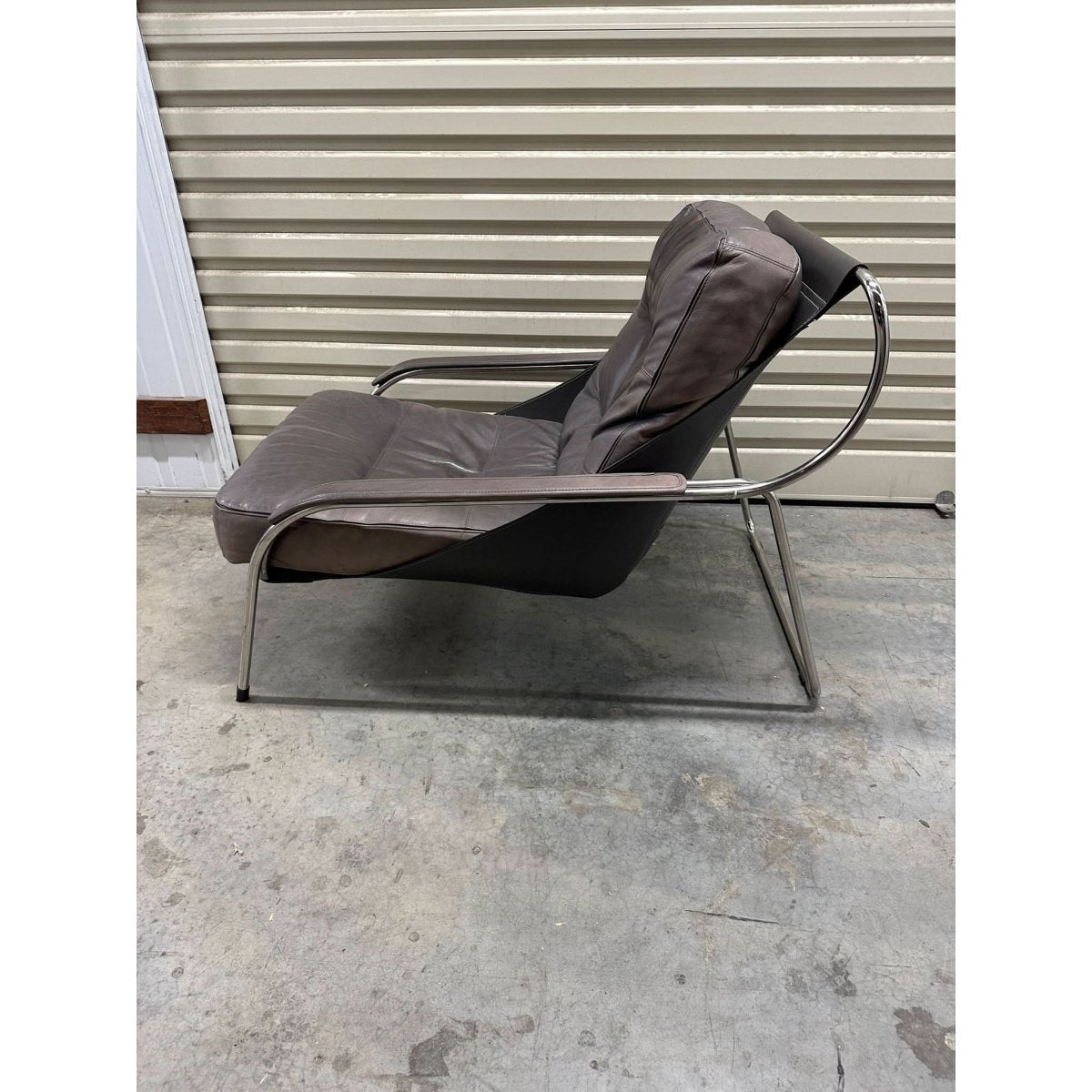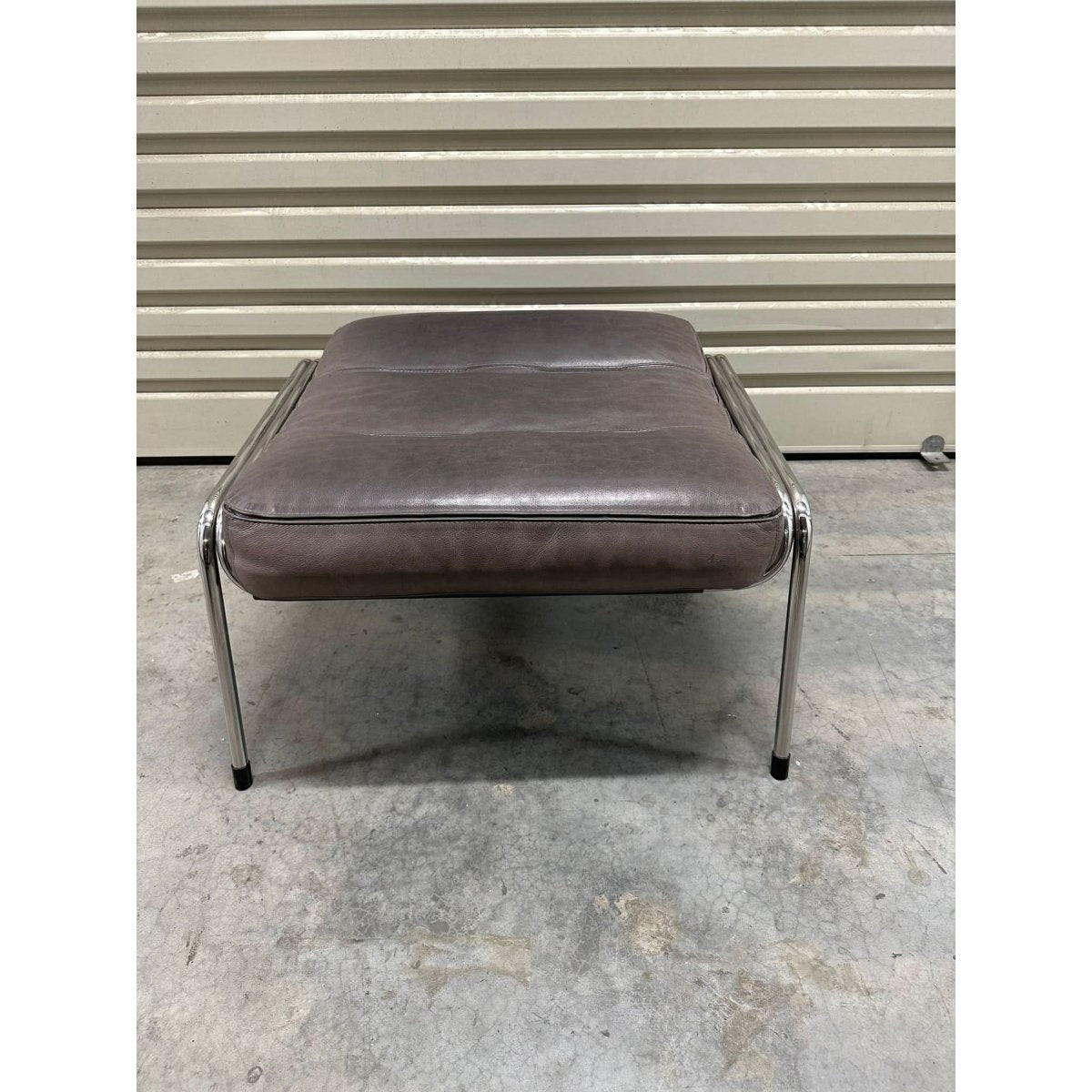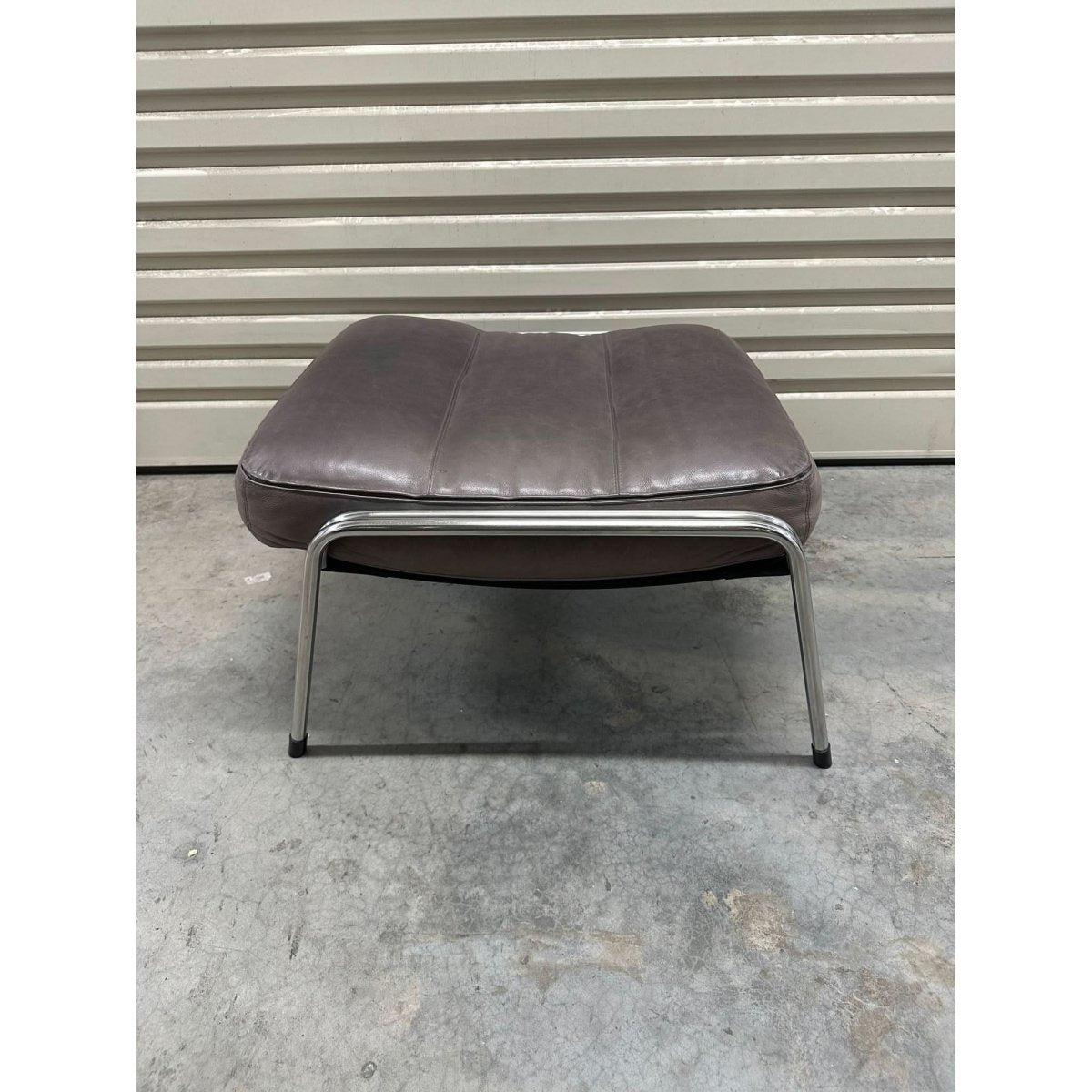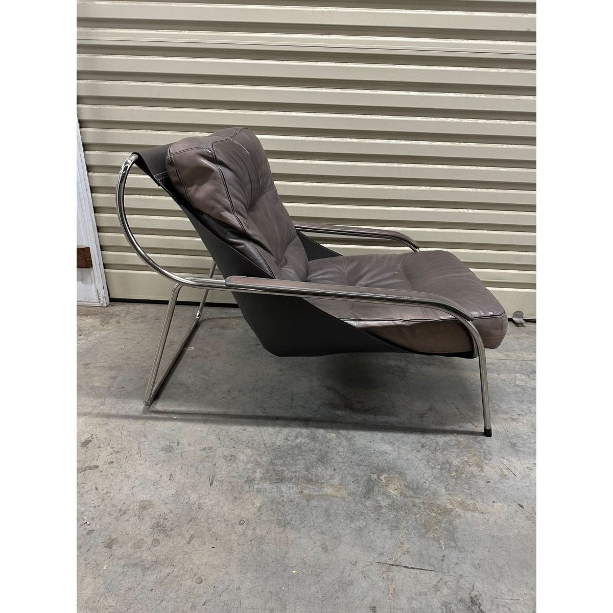 Awarded the gold medal at the Milan Triennale in 1948, the chair features a slim, polished tubular steel frame and a sophisticated black leather sling, supporting plush brown leather cushions. The leather-wrapped armrests complement the chair’s sleek design, while the matching footstool, upholstered in black leather, completes the modern aesthetic.