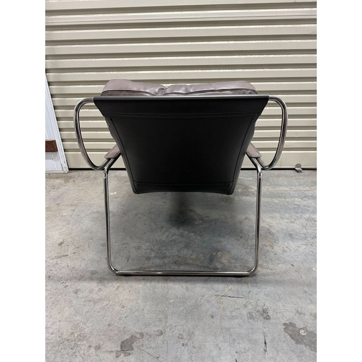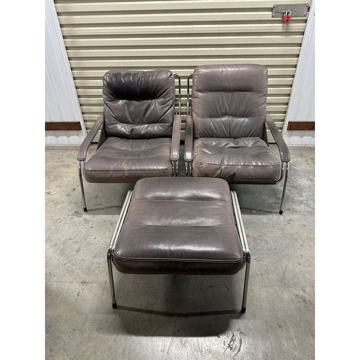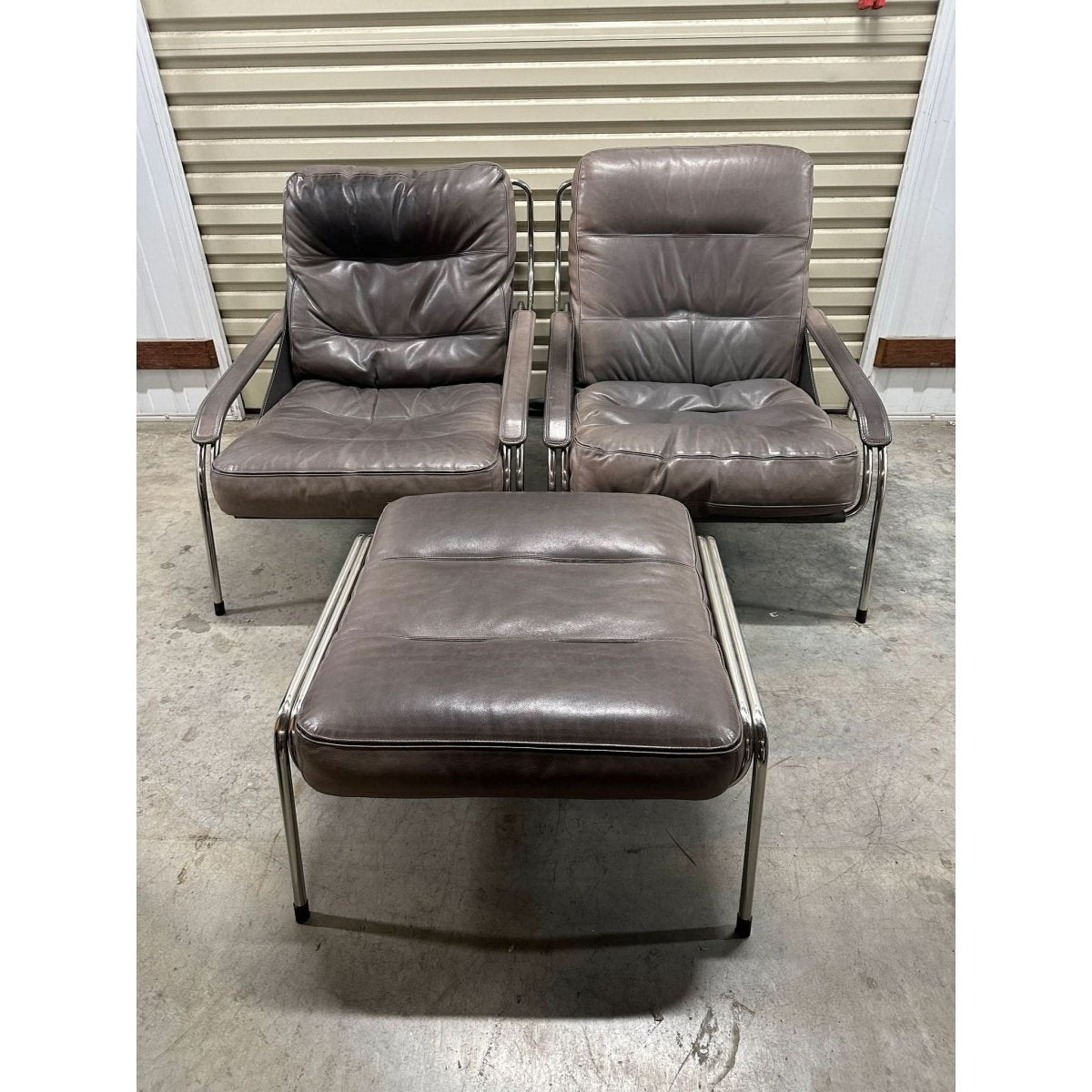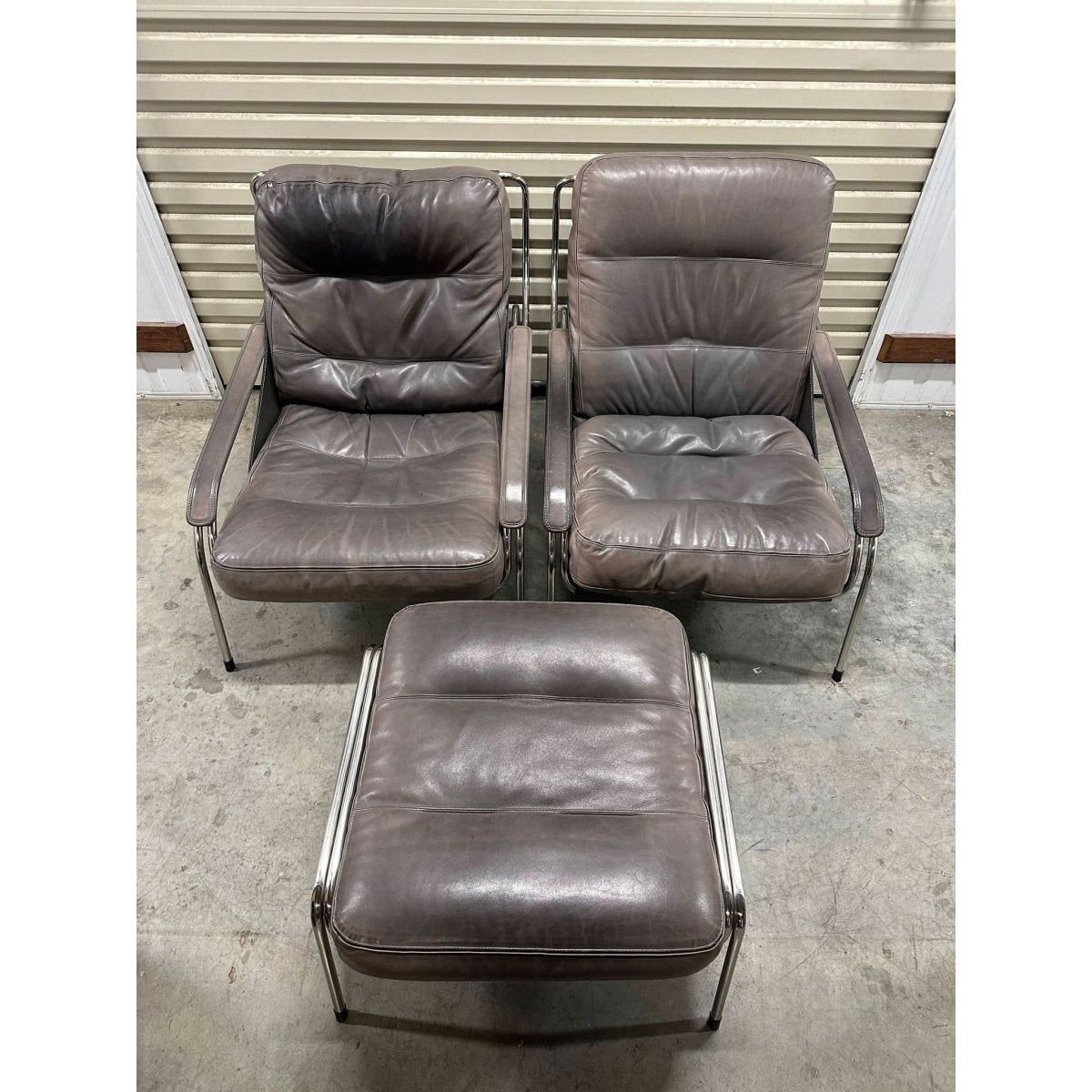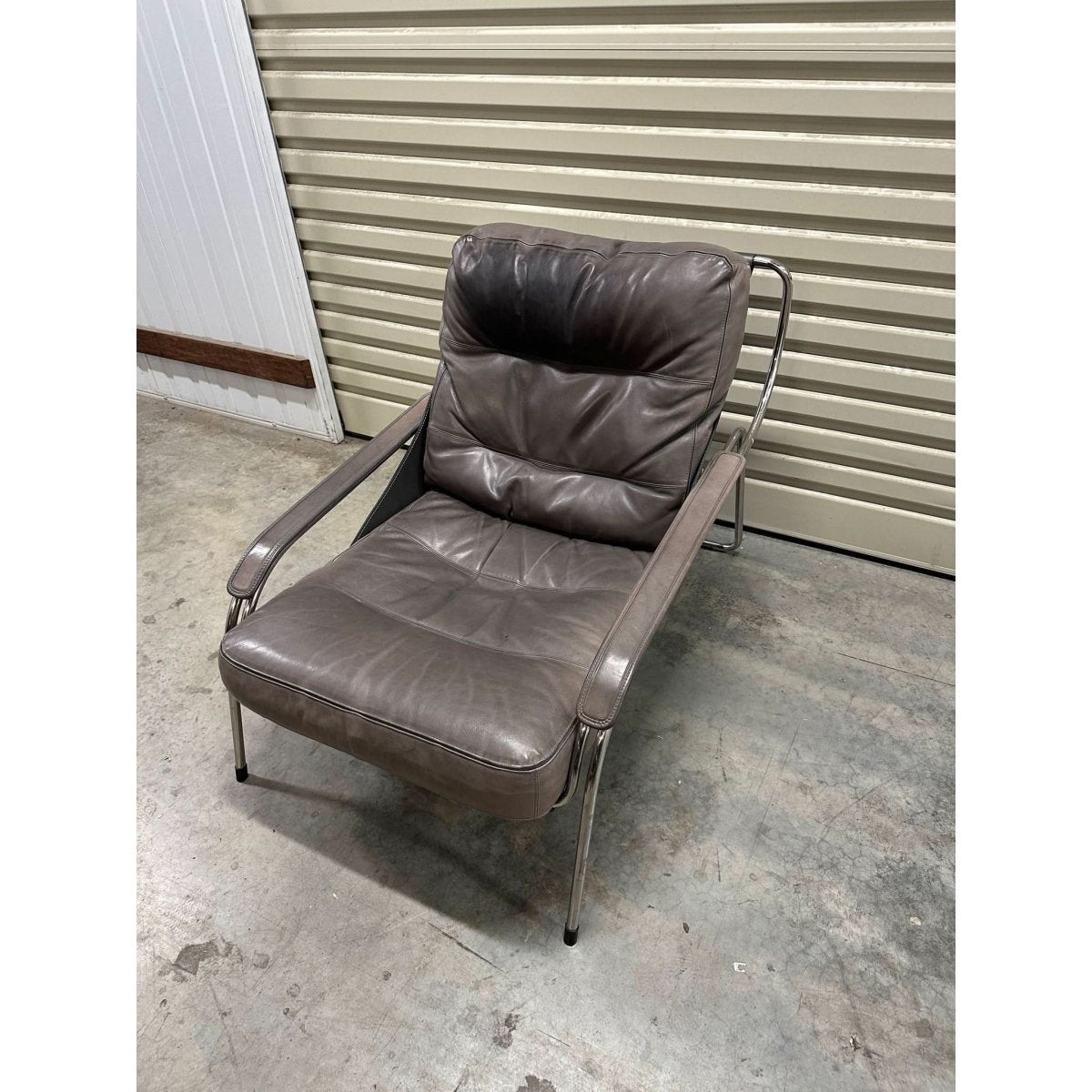 Awarded the gold medal at the Milan Triennale in 1948, the chair features a slim, polished tubular steel frame and a sophisticated black leather sling, supporting plush brown leather cushions. The leather-wrapped armrests complement the chair’s sleek design, while the matching footstool, upholstered in black leather, completes the modern aesthetic.
