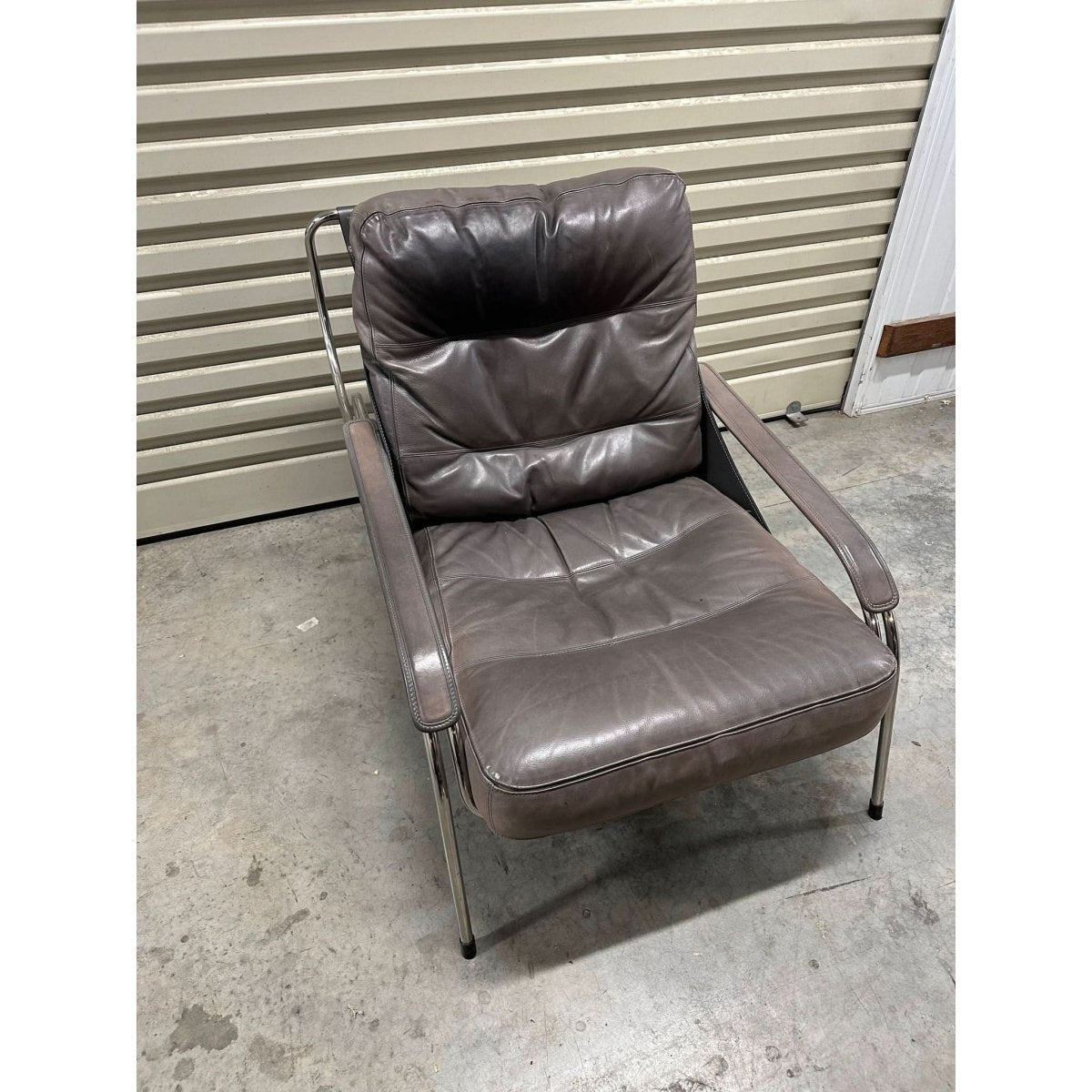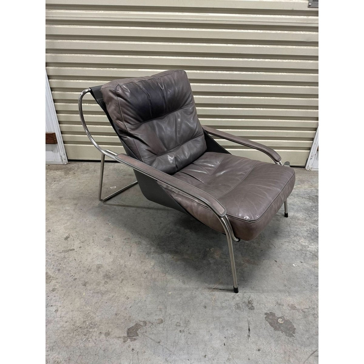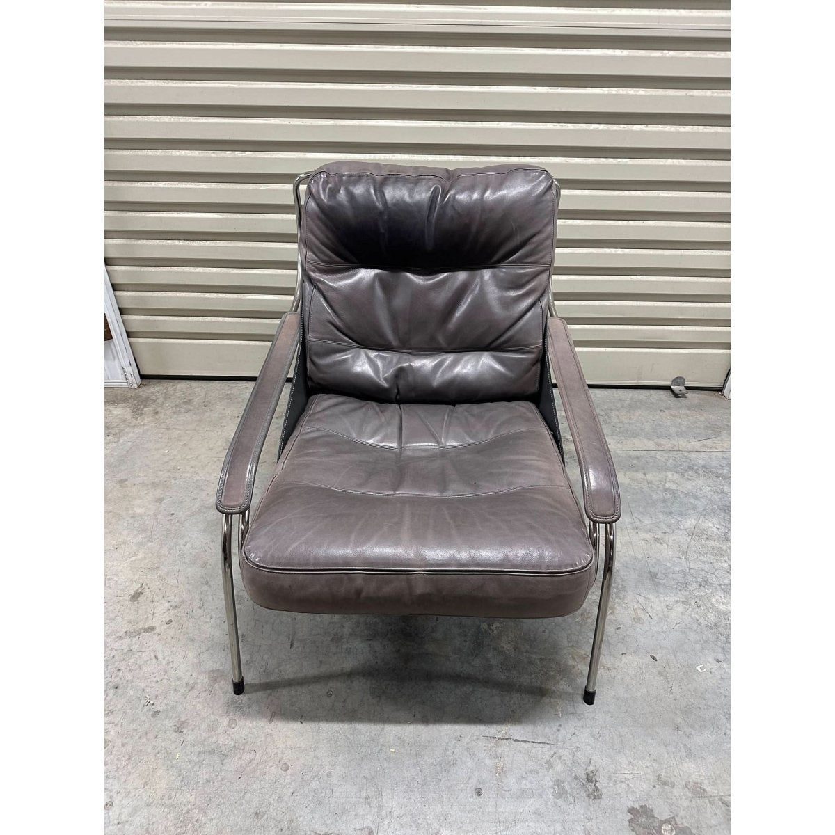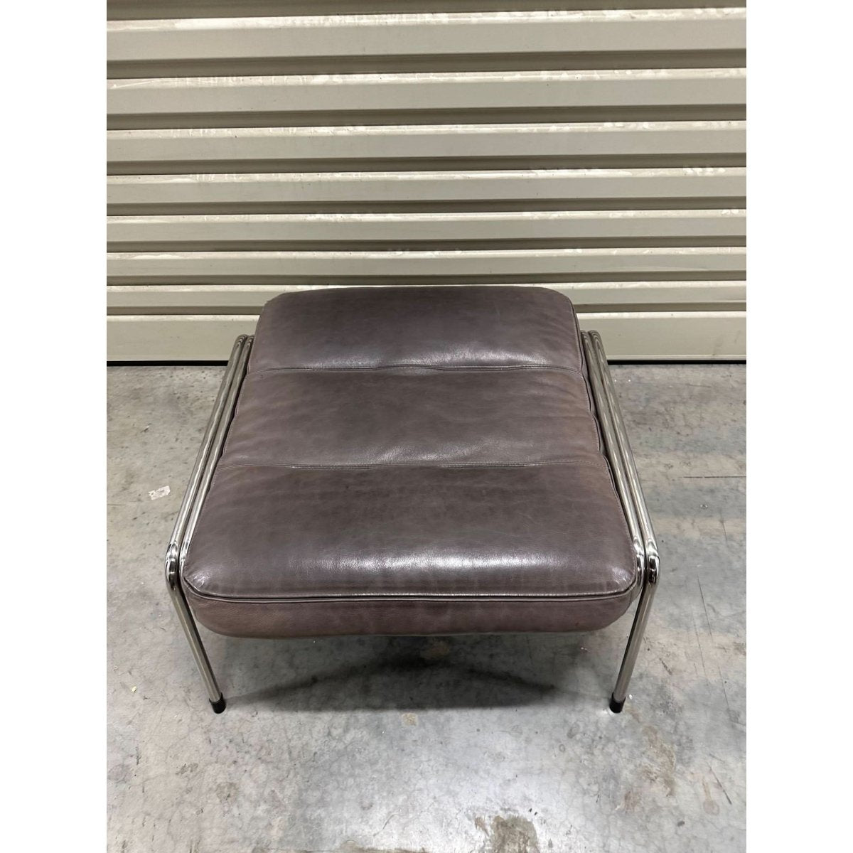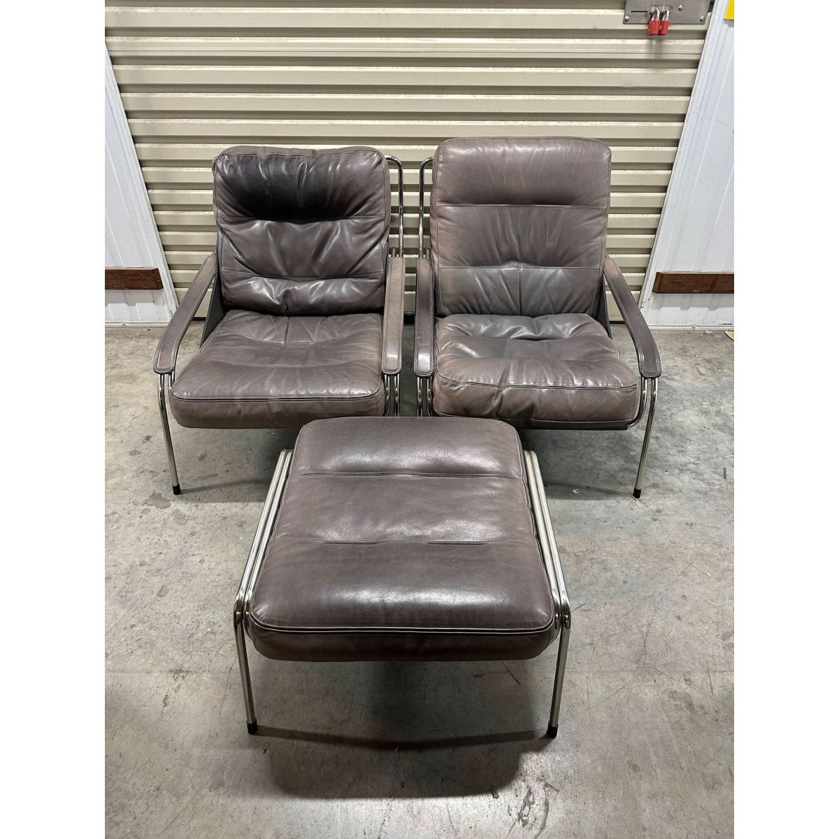 Awarded the gold medal at the Milan Triennale in 1948, the chair features a slim, polished tubular steel frame and a sophisticated black leather sling, supporting plush brown leather cushions. The leather-wrapped armrests complement the chair’s sleek design, while the matching footstool, upholstered in black leather, completes the modern aesthetic.