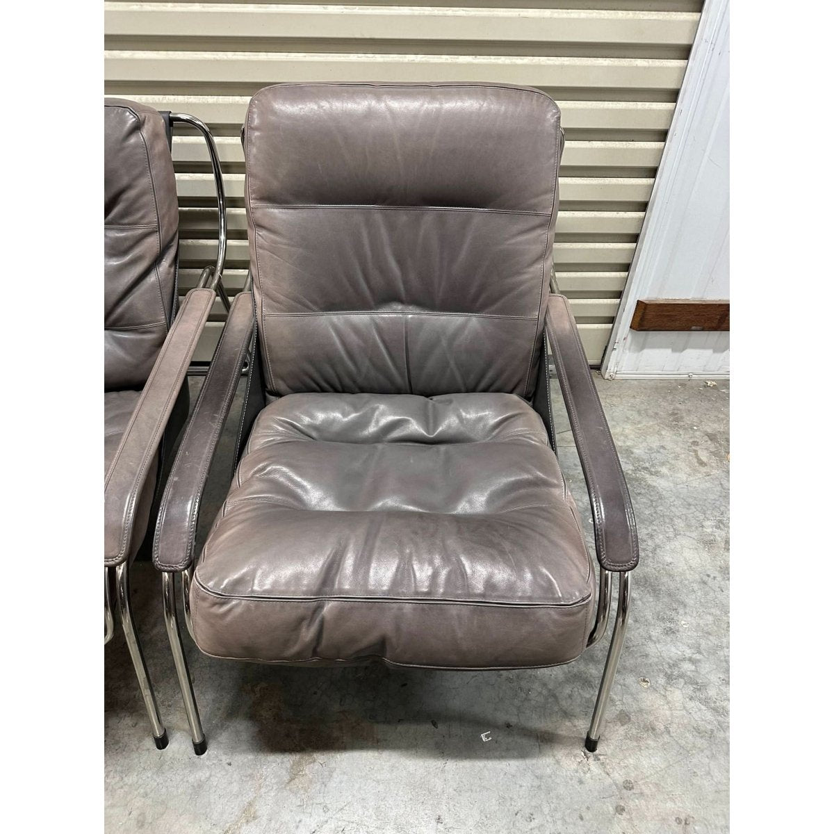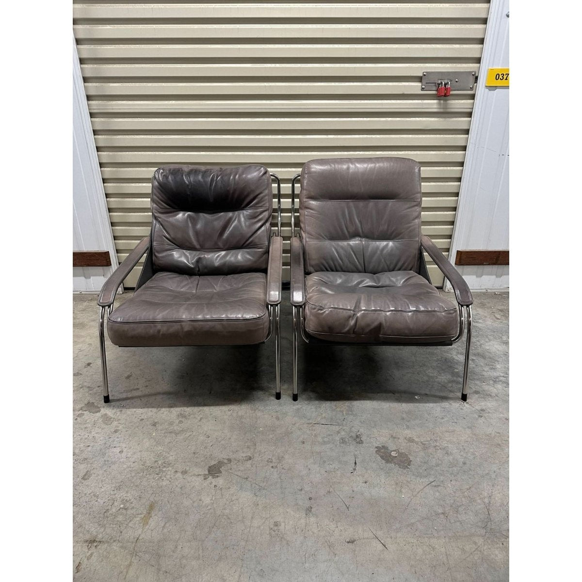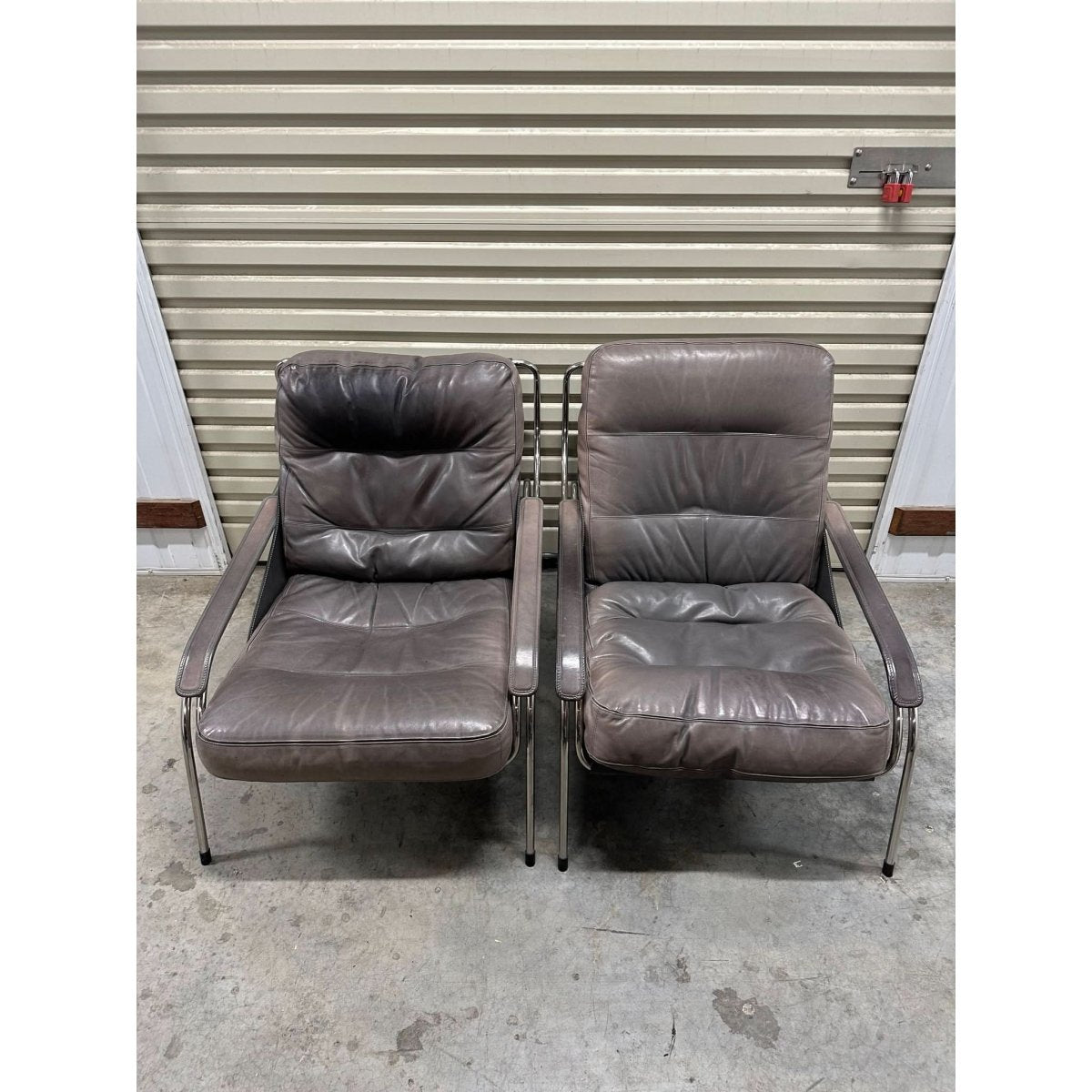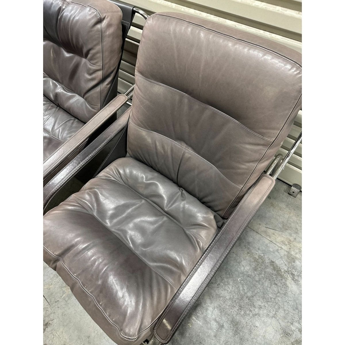 Awarded the gold medal at the Milan Triennale in 1948, the chair features a slim, polished tubular steel frame and a sophisticated black leather sling, supporting plush brown leather cushions. The leather-wrapped armrests complement the chair’s sleek design, while the matching footstool, upholstered in black leather, completes the modern aesthetic.