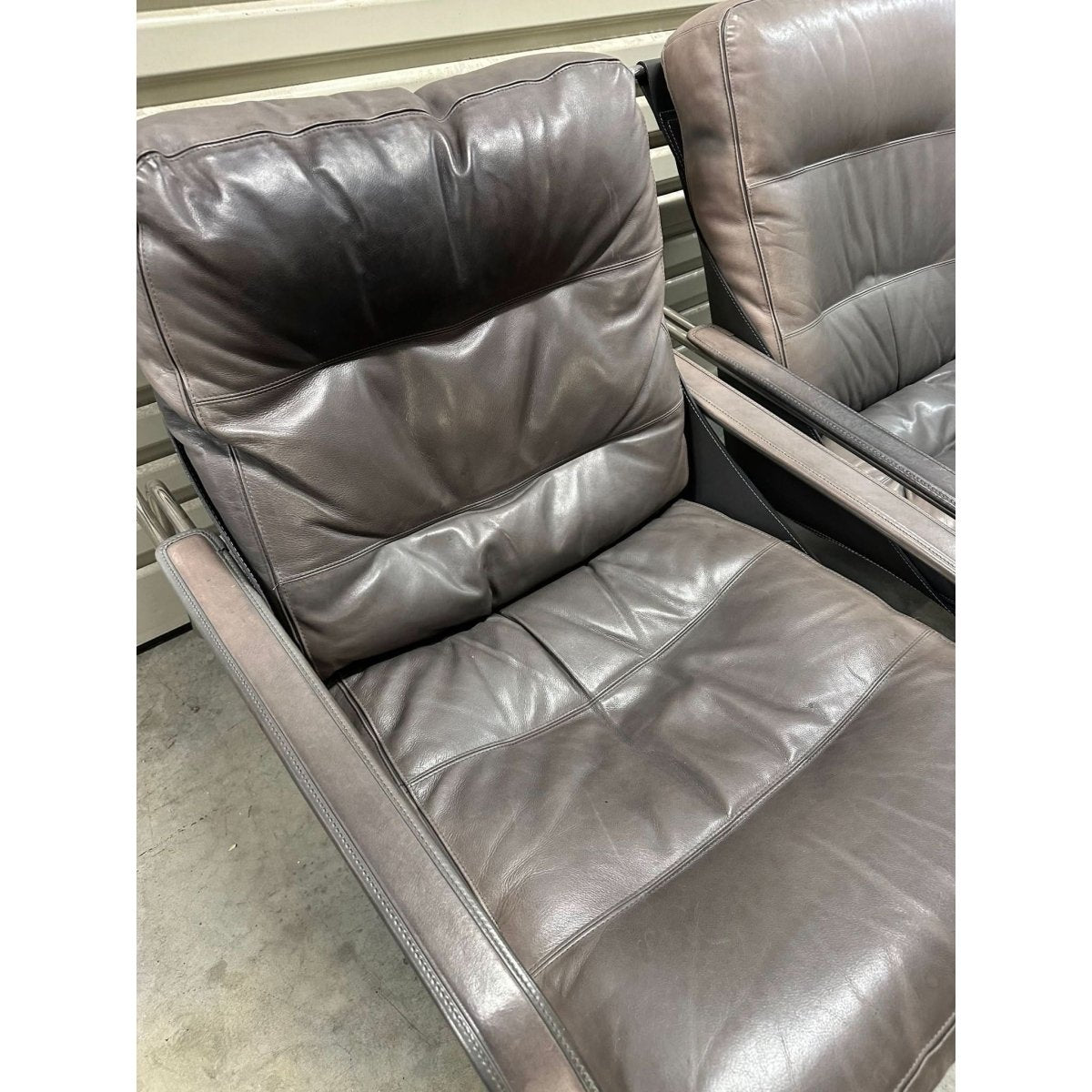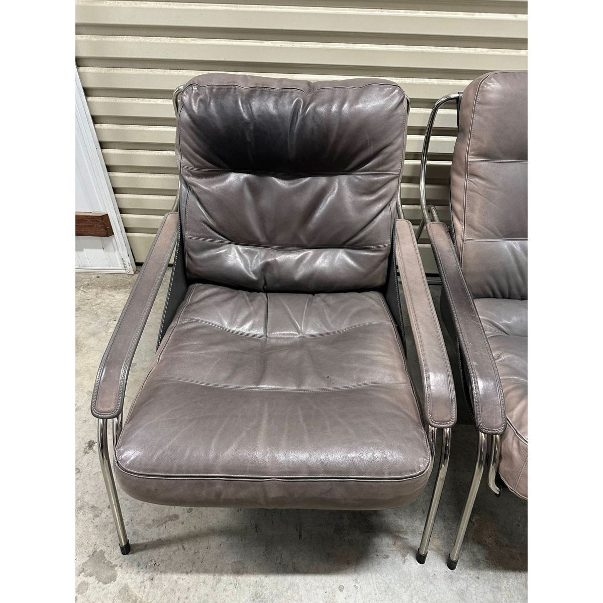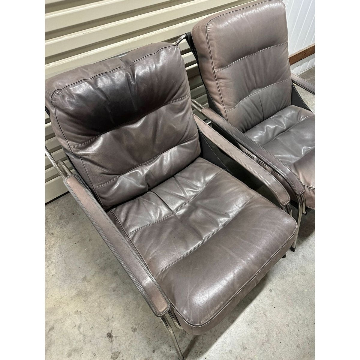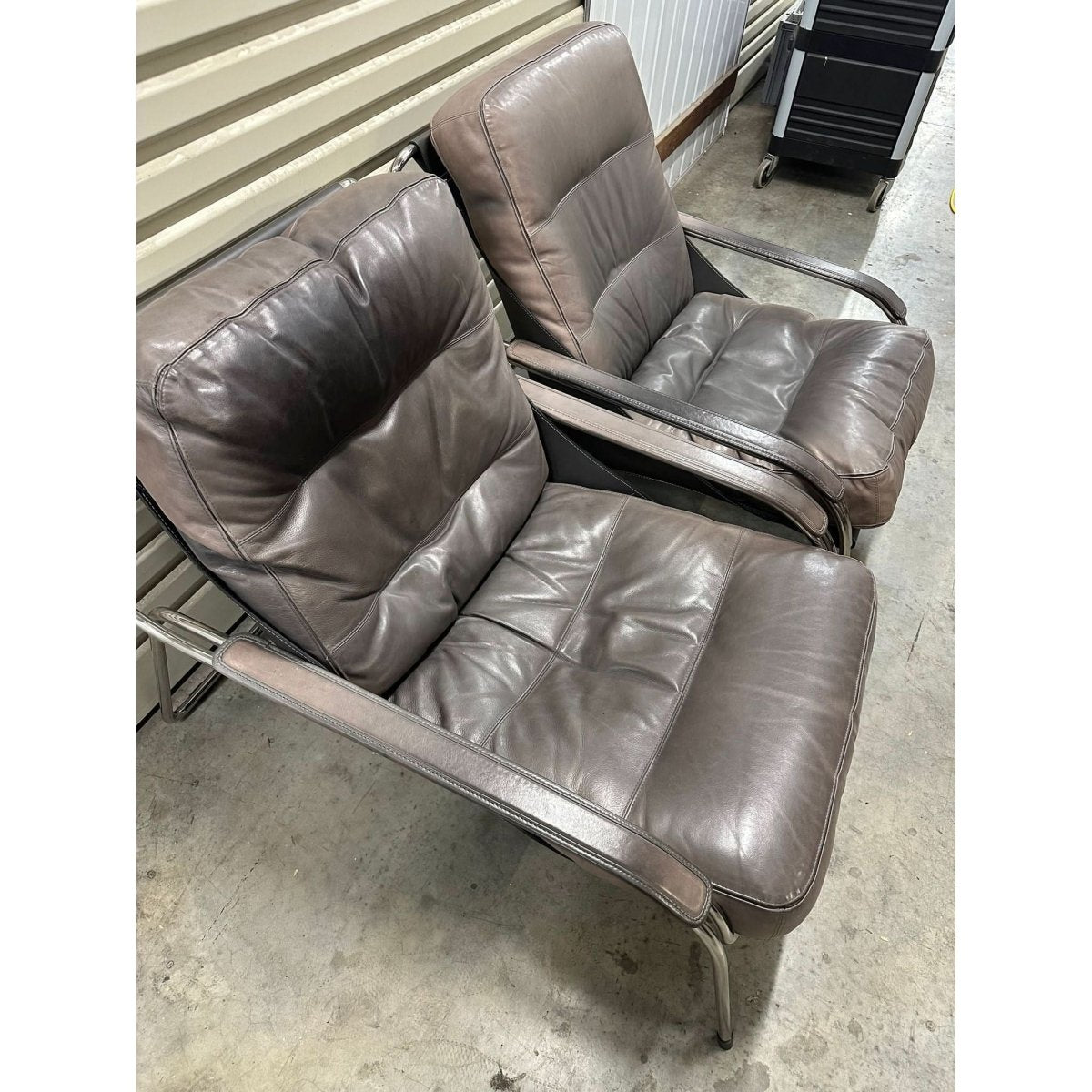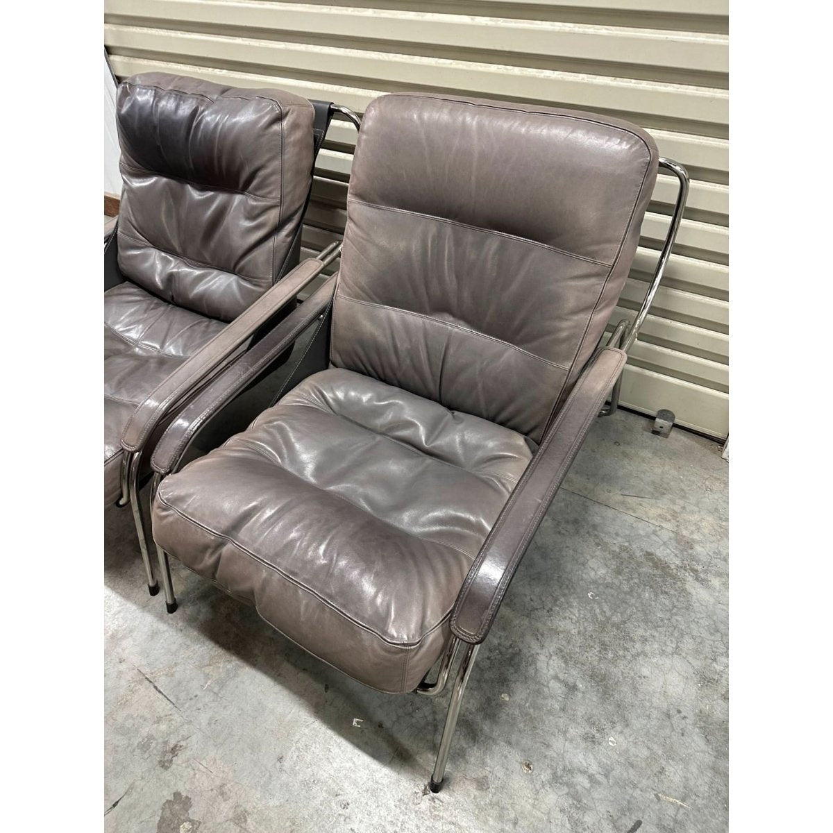 Awarded the gold medal at the Milan Triennale in 1948, the chair features a slim, polished tubular steel frame and a sophisticated black leather sling, supporting plush brown leather cushions. The leather-wrapped armrests complement the chair’s sleek design, while the matching footstool, upholstered in black leather, completes the modern aesthetic.