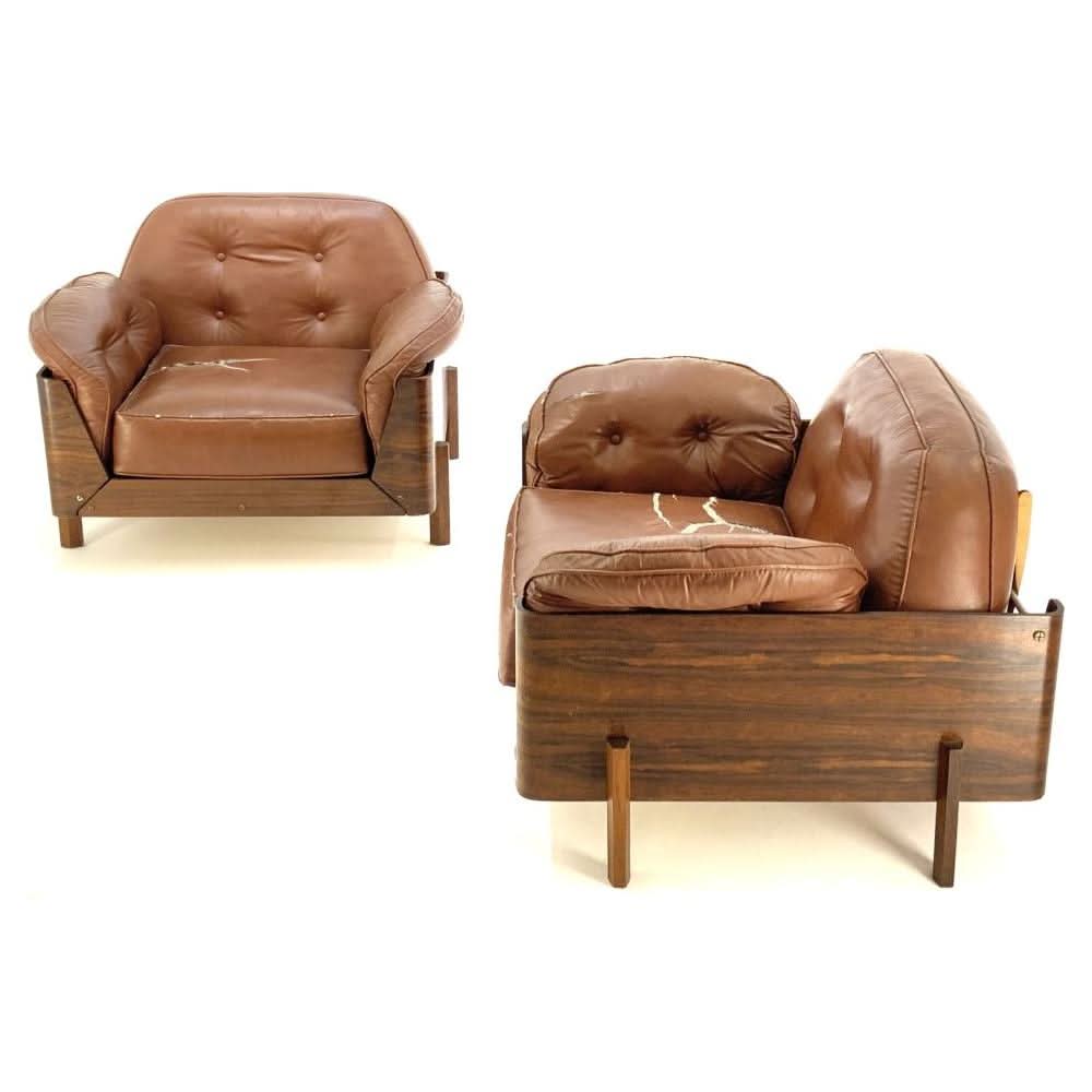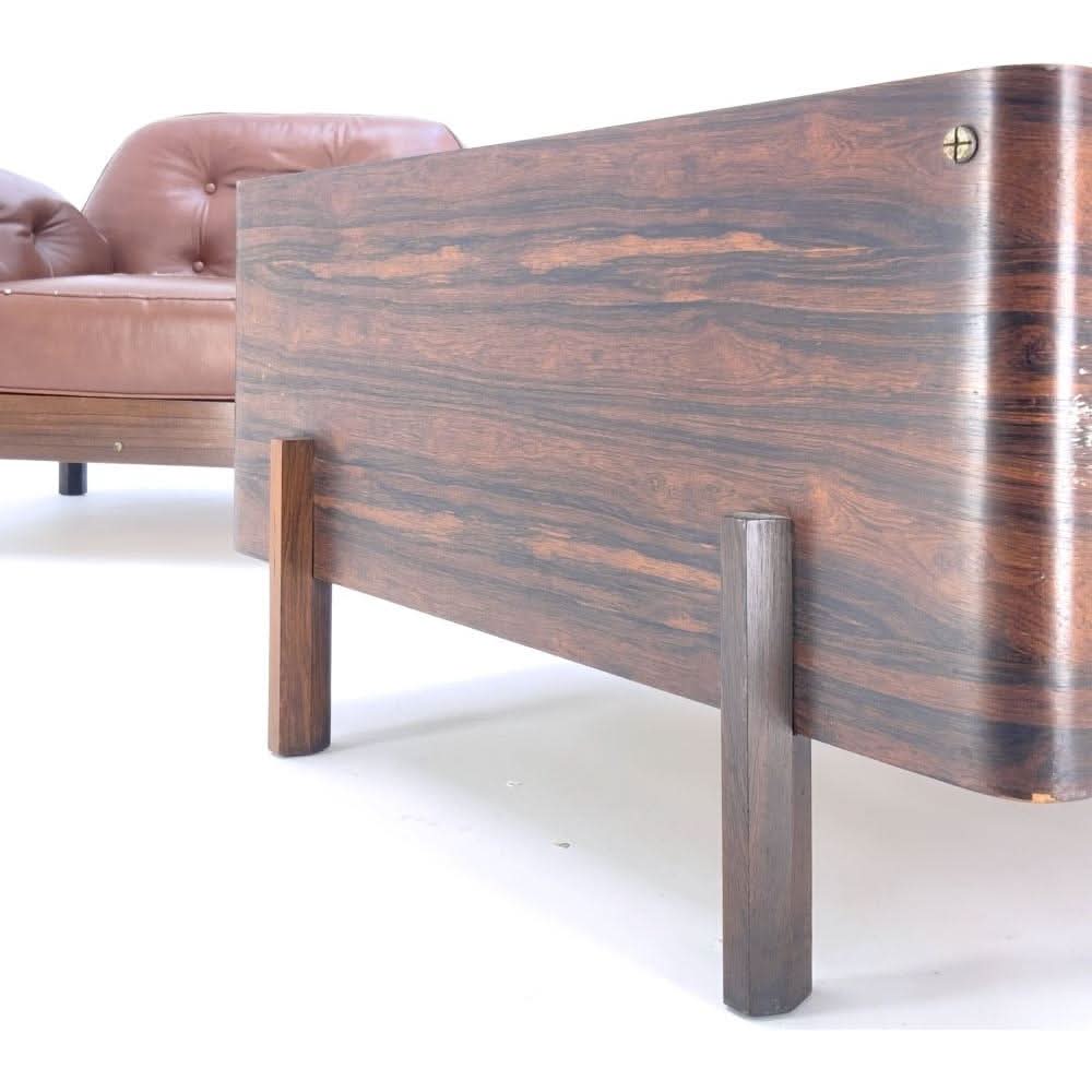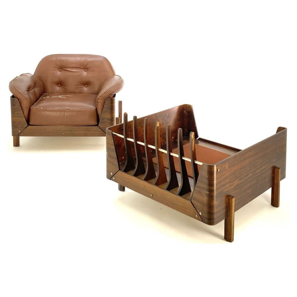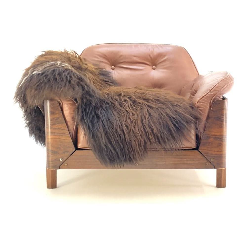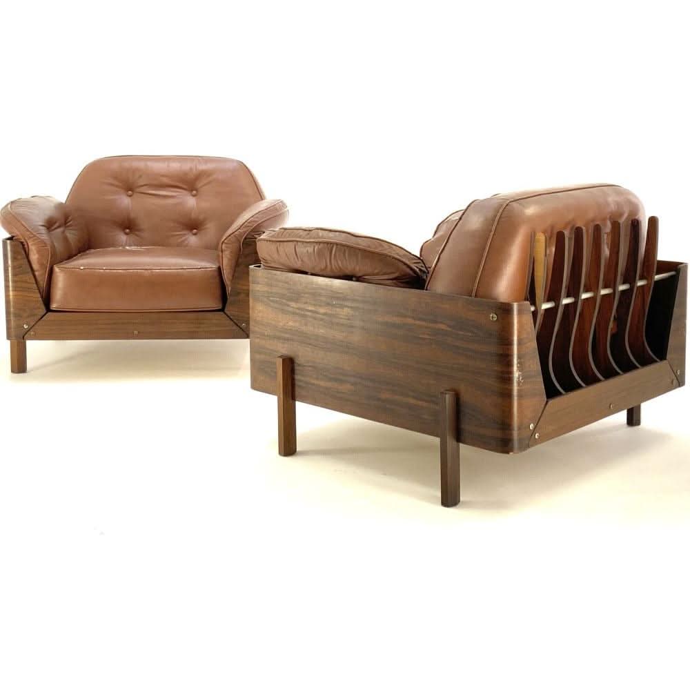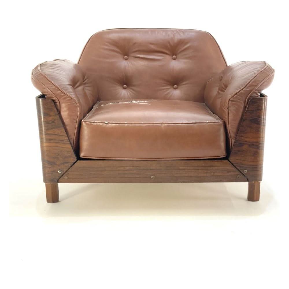J.D. Moveis e Decoracoes Brazilian Rosewood and Leather Lounge Chairs. Newly restored frames. Priced individually with a pair being available – a matching sofa is also available under restoration P.O.A