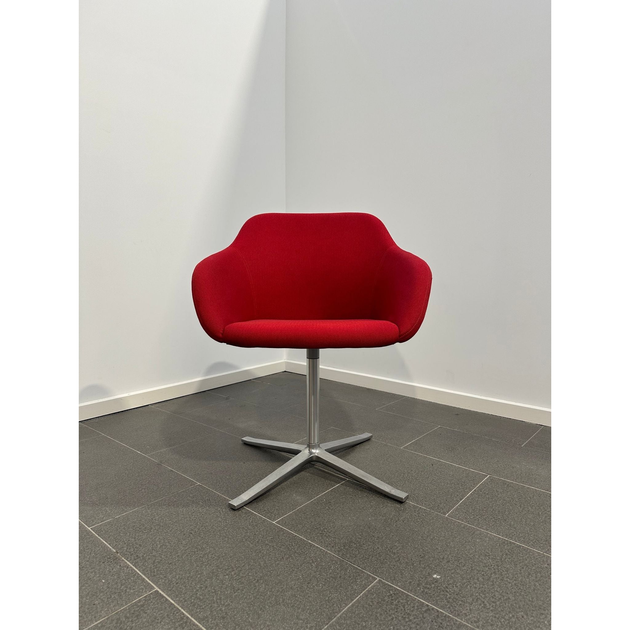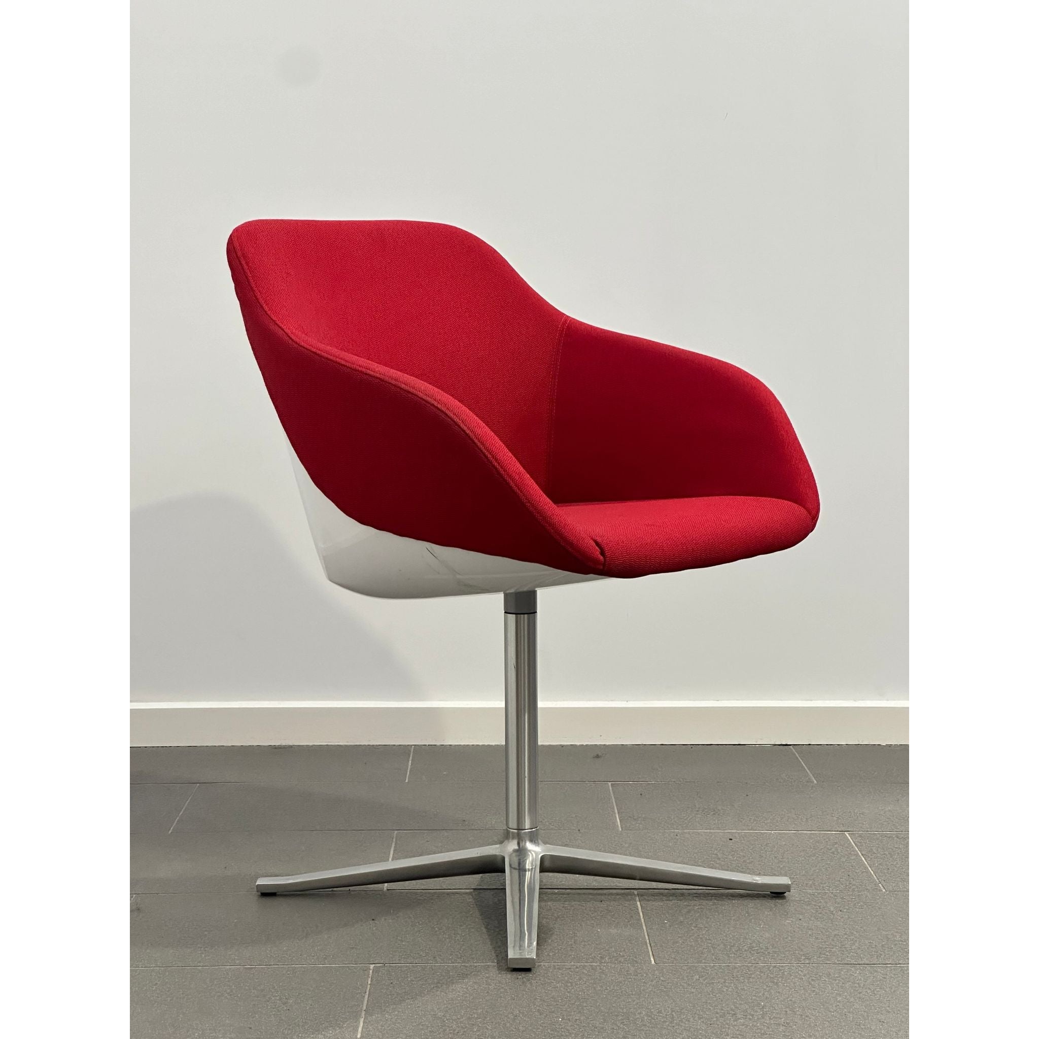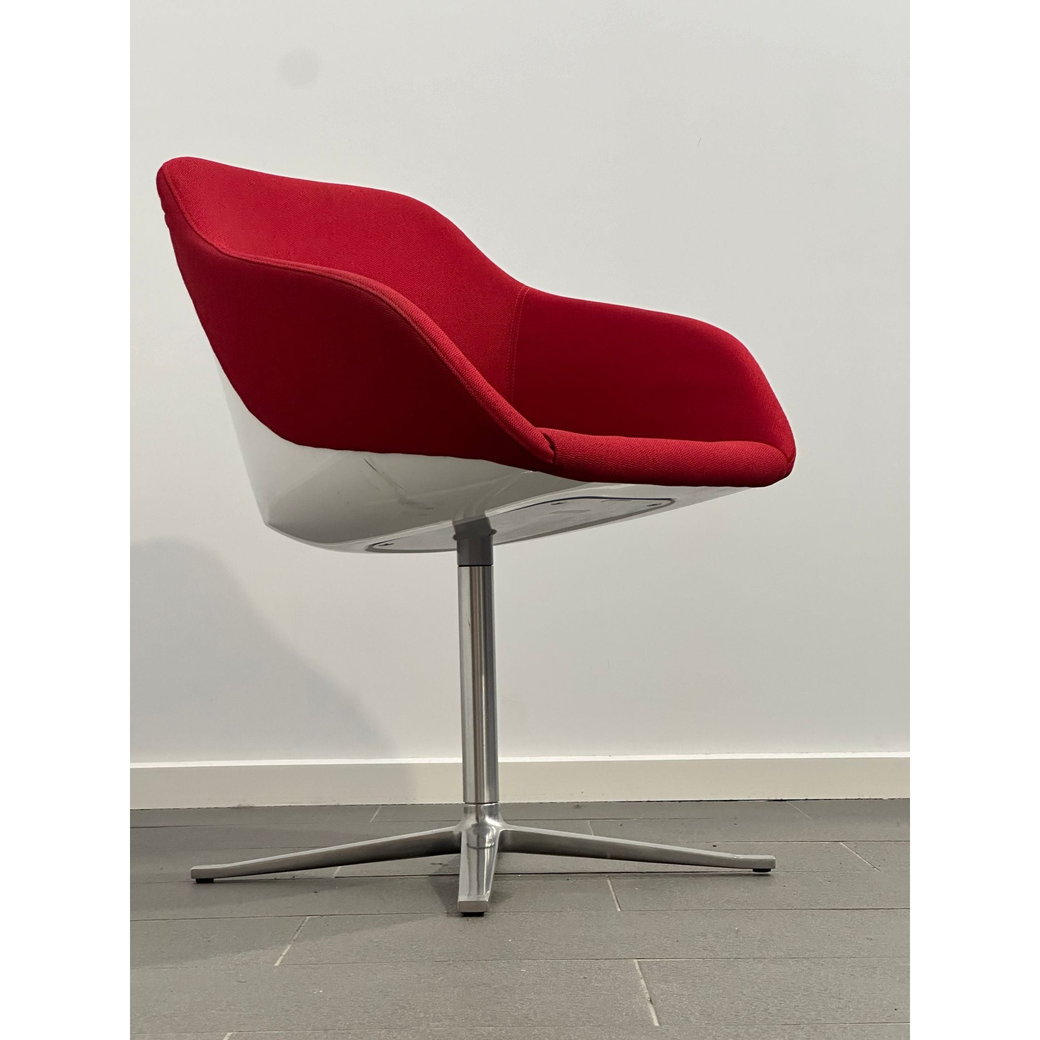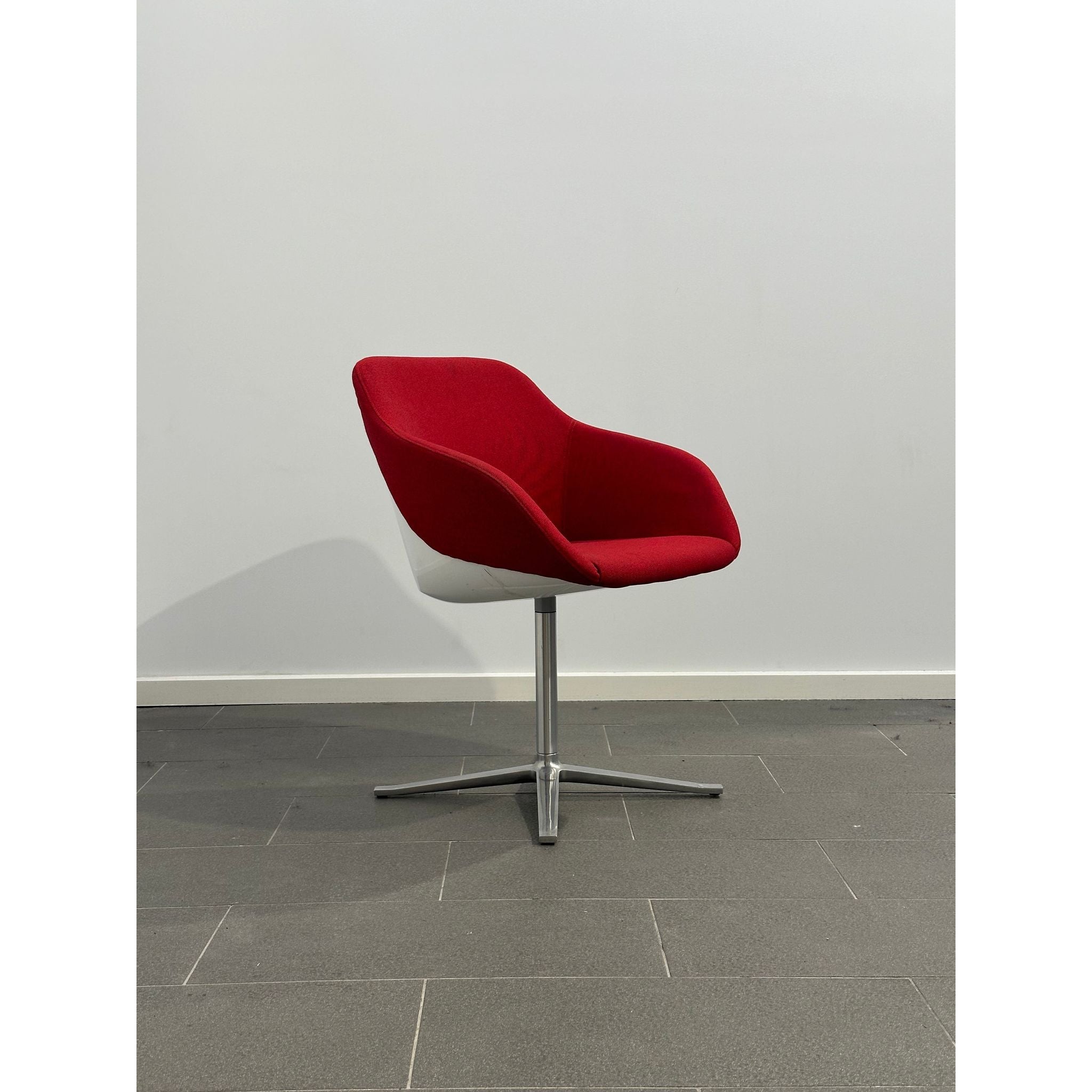Outside a supportive shell, inside an invitingly comfortable seat. Easy to swivel on a base plate or star base, with black or white back shell and individual cover. This shell chair makes a special statement in a private or public space. Optionally with auto-return mechanism and castors.