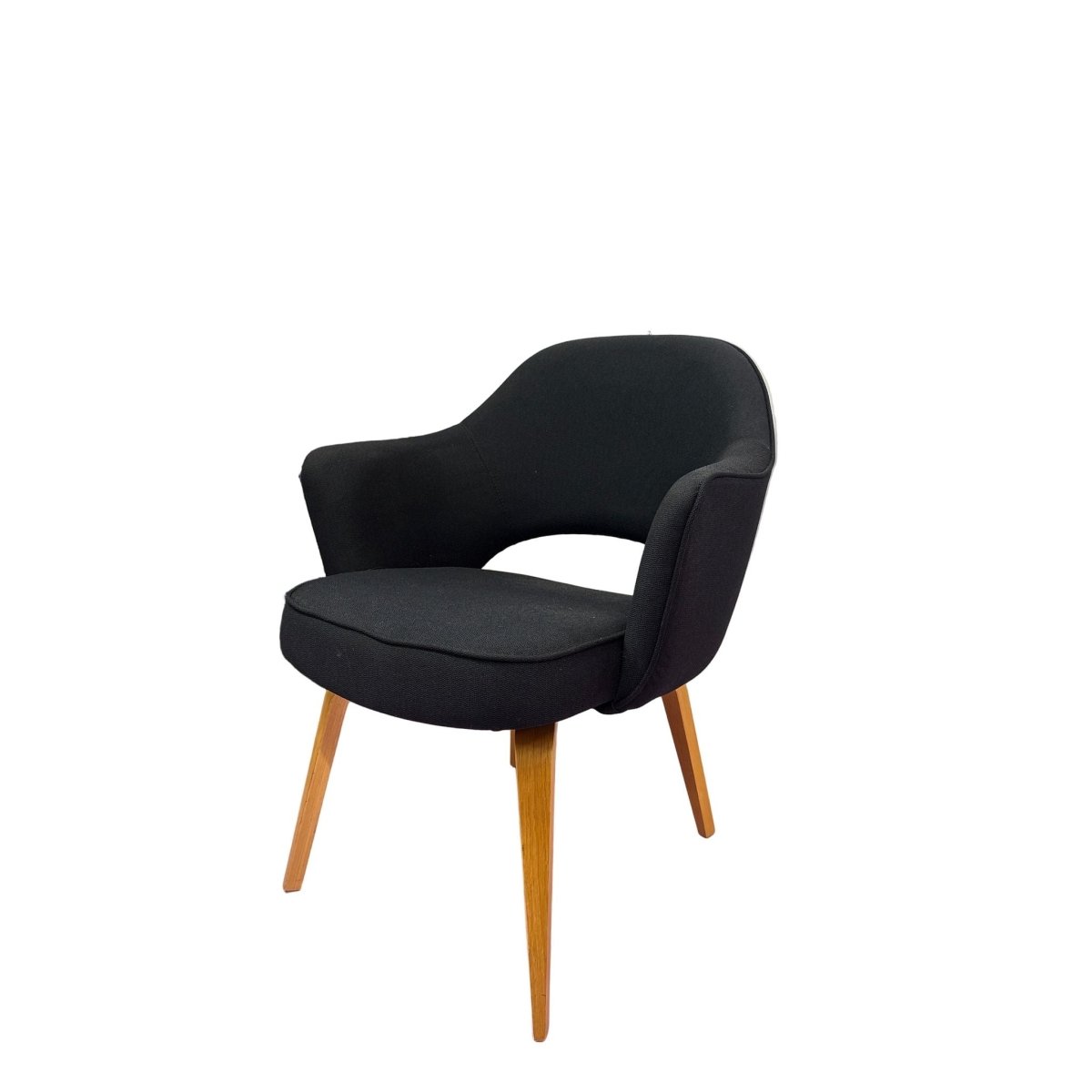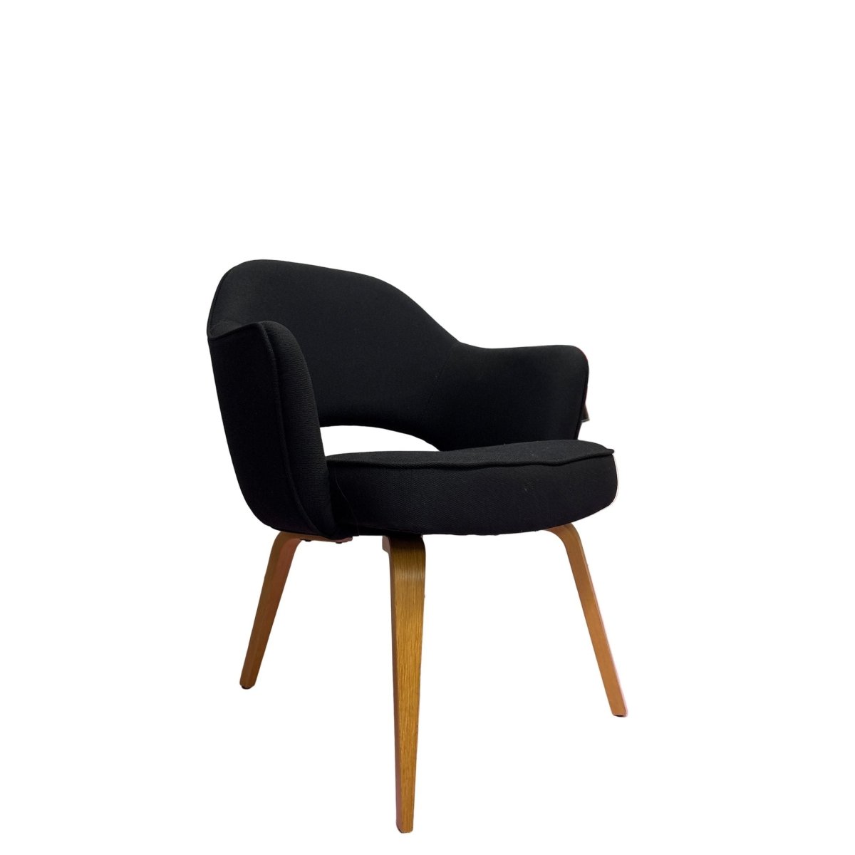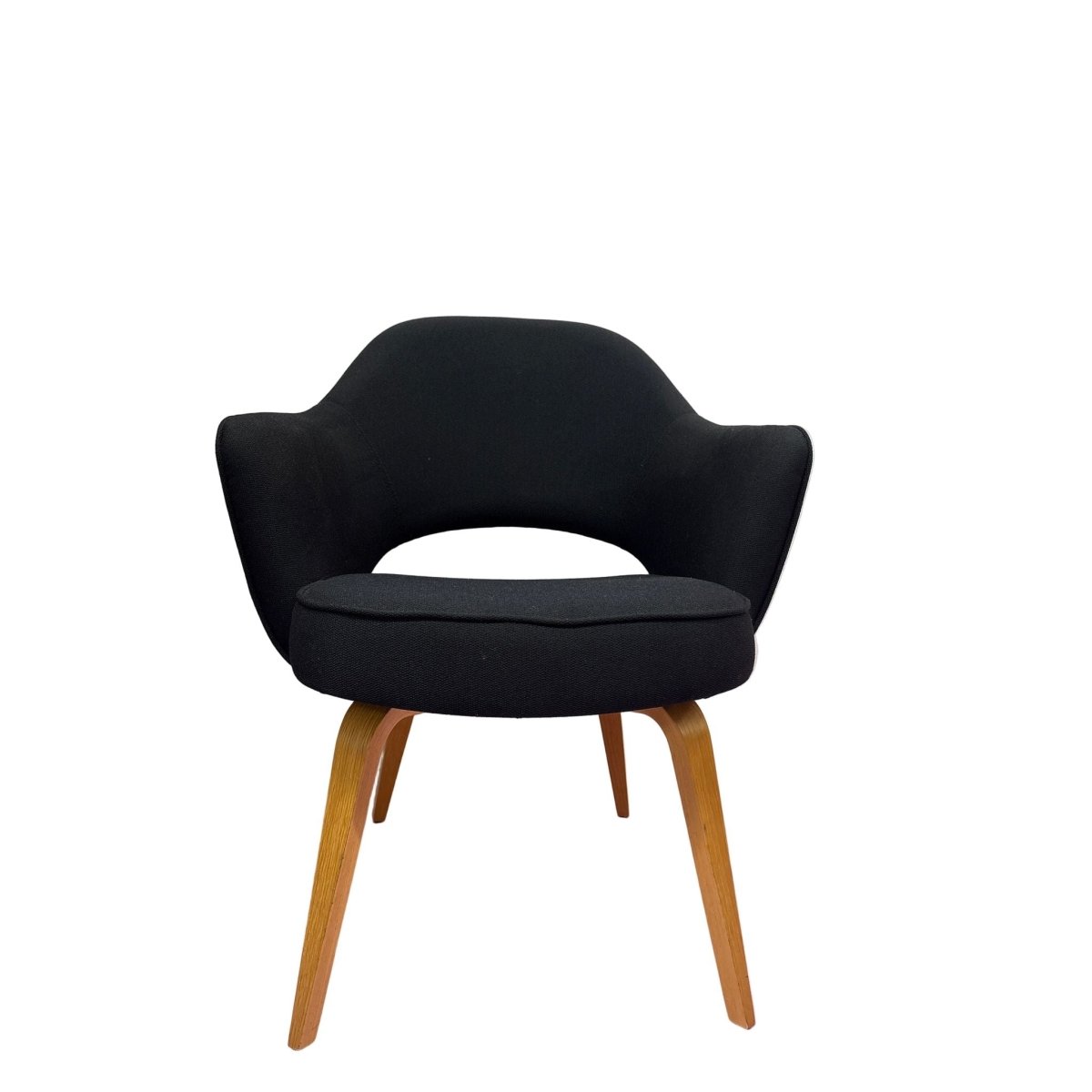 The Knoll Saarinen Executive Armchair, designed by Eero Saarinen, showcases sleek black timber legs that add a touch of sophistication to any office space. With a stylish and ergonomic design, this chair provides both comfort and style for long work days. Bring a modern touch to your workspace with this iconic piece.