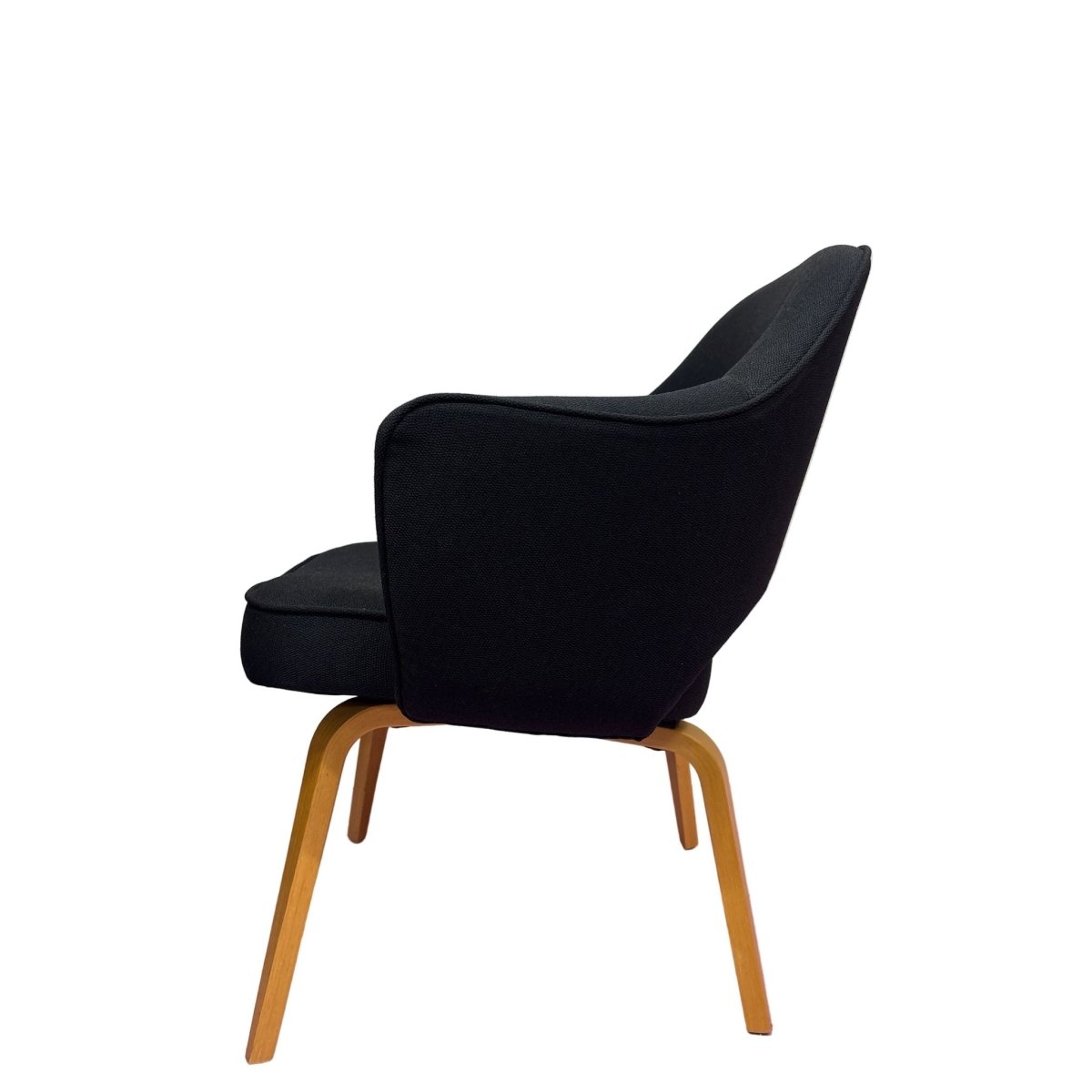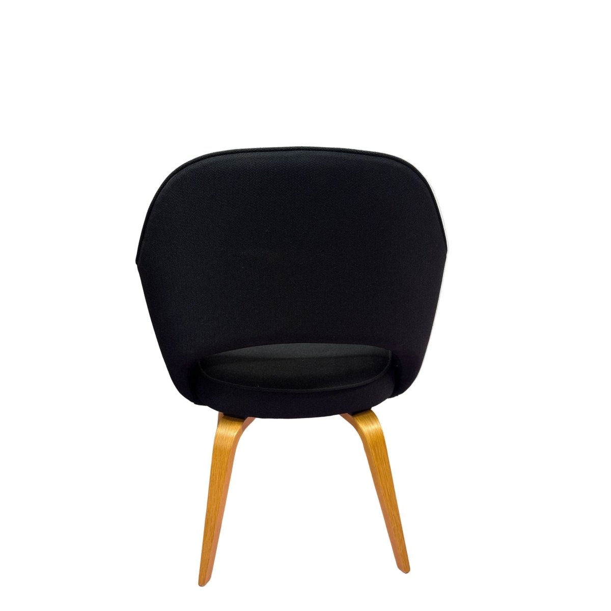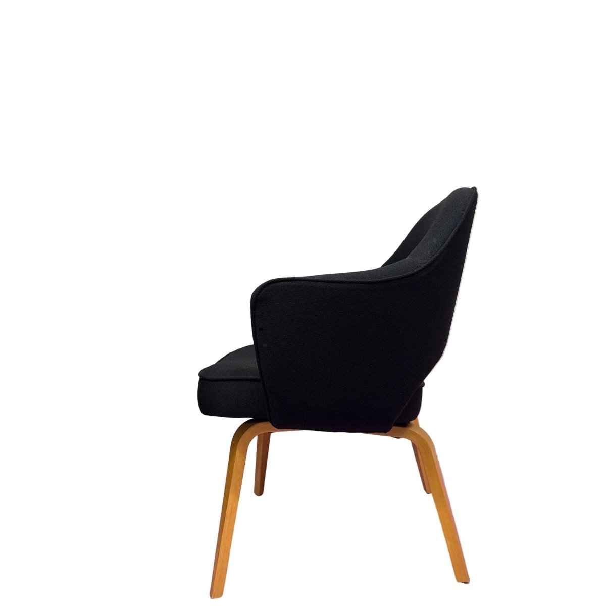 The Knoll Saarinen Executive Armchair, designed by Eero Saarinen, showcases sleek black timber legs that add a touch of sophistication to any office space. With a stylish and ergonomic design, this chair provides both comfort and style for long work days. Bring a modern touch to your workspace with this iconic piece.