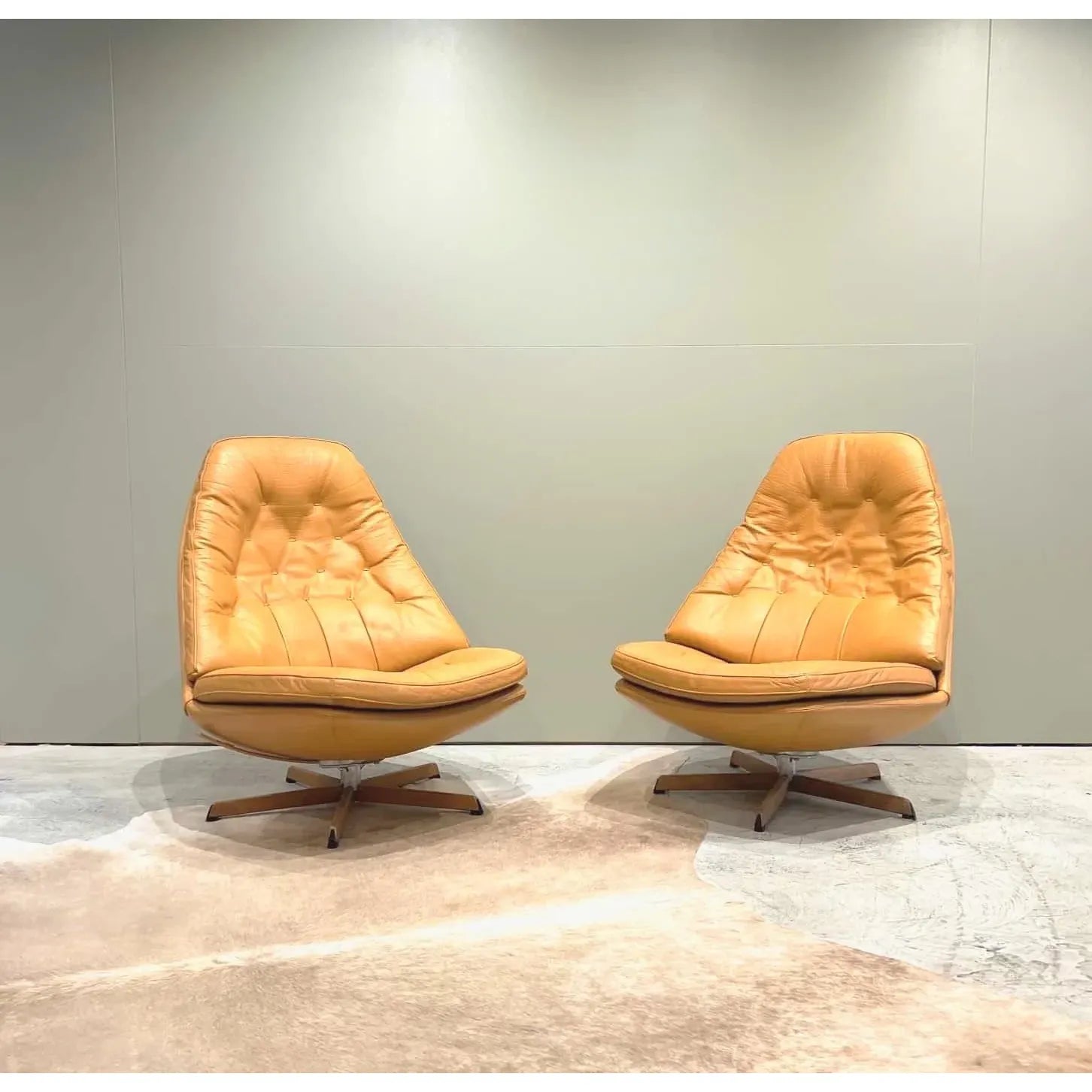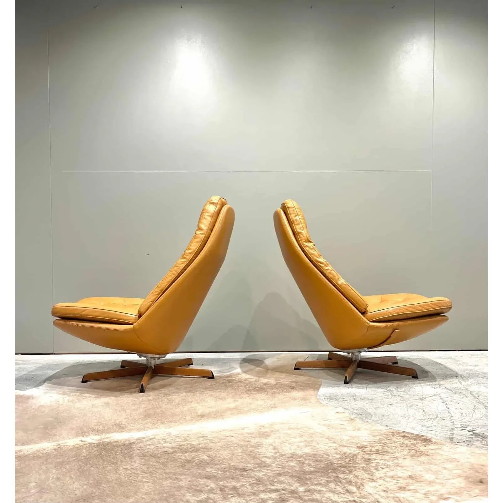These Vintage Danish leather swivel chairs are upholstered in honey-coloured leather, on a five-leg, star-shaped base of metal and oak. These chairs swivel and tilt and are as comfortable as they are stylish.