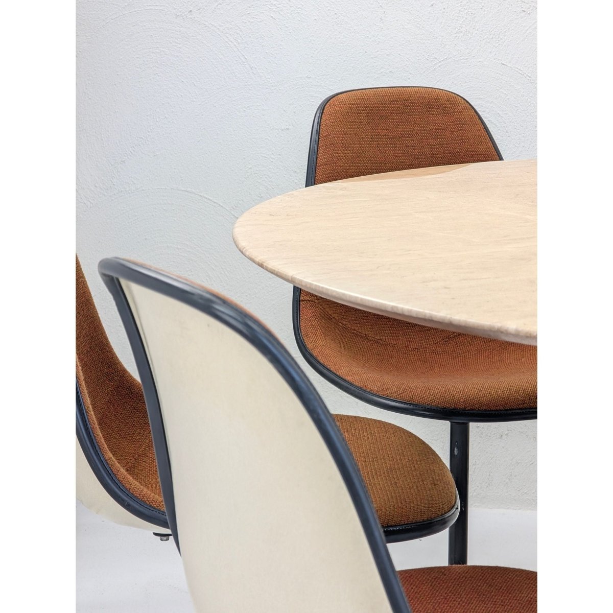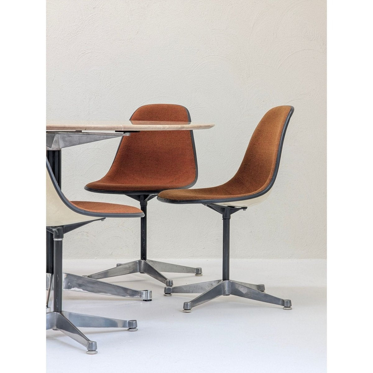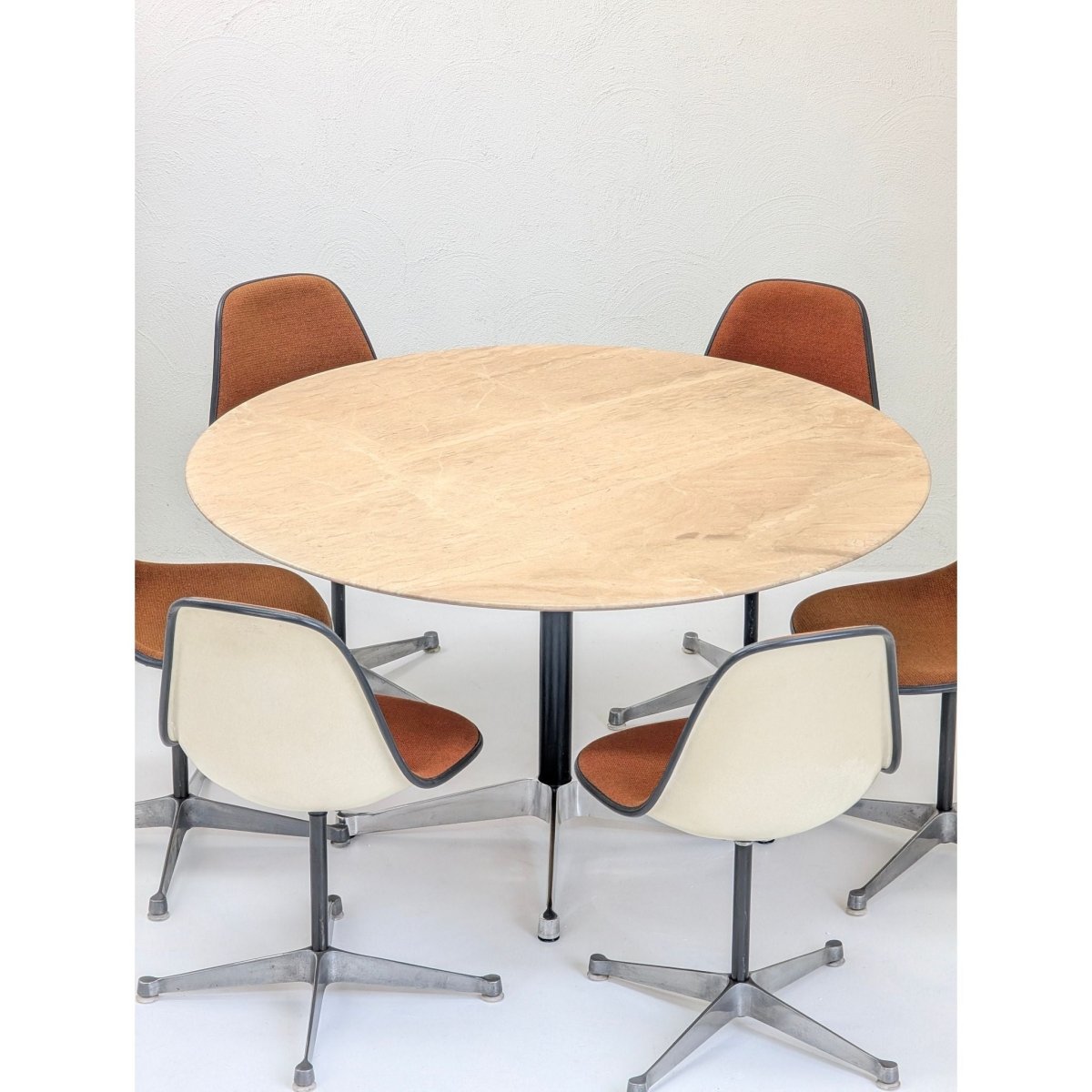 Showcasing an exceptional and unique dining suite, pairing the iconic 1960s designs of Charles and Ray Eames for Herman Miller with a magnificent custom Italian stone top. This set was imported from a Los Angeles collection in 2004 and represents a beautiful fusion of authentic vintage character and bespoke luxury.