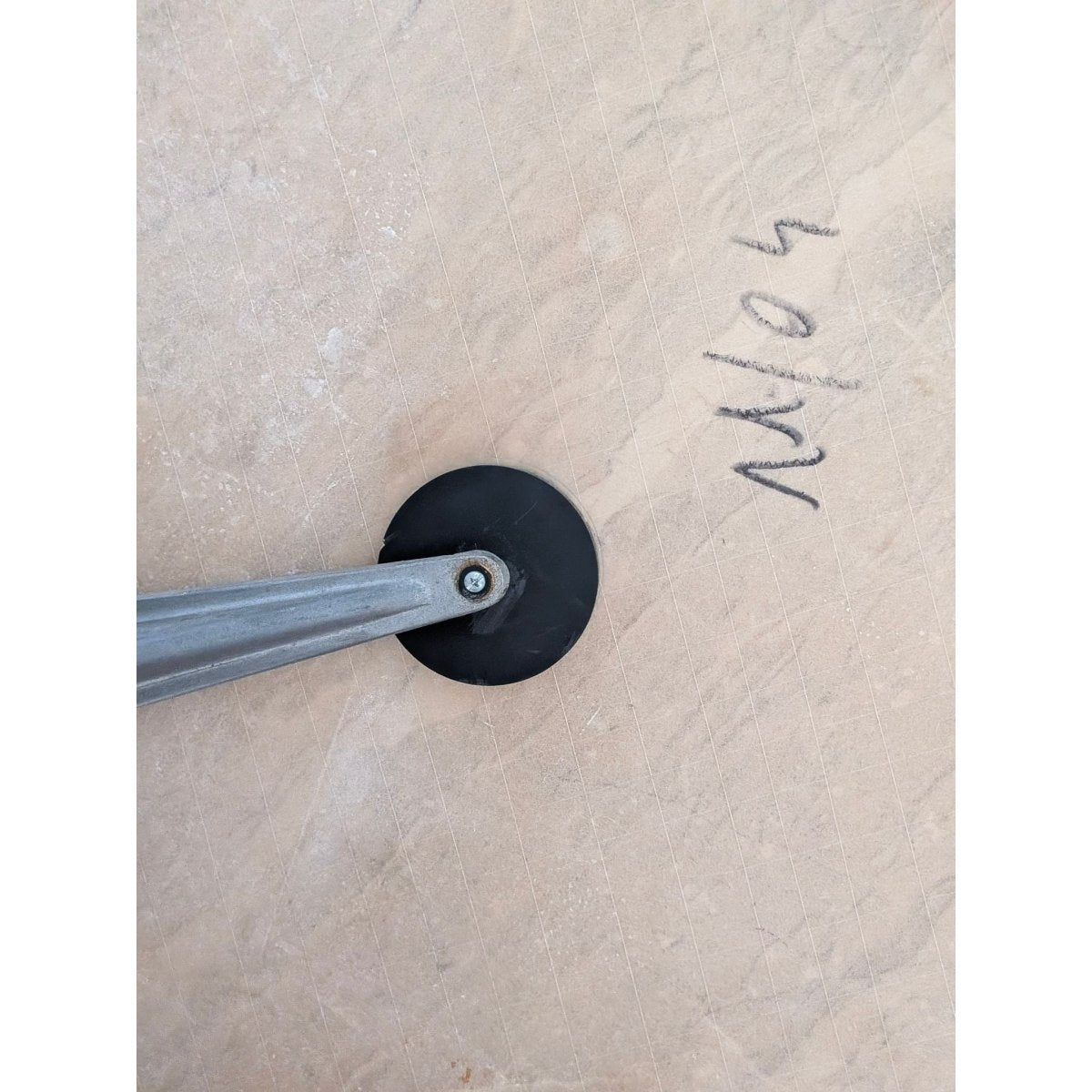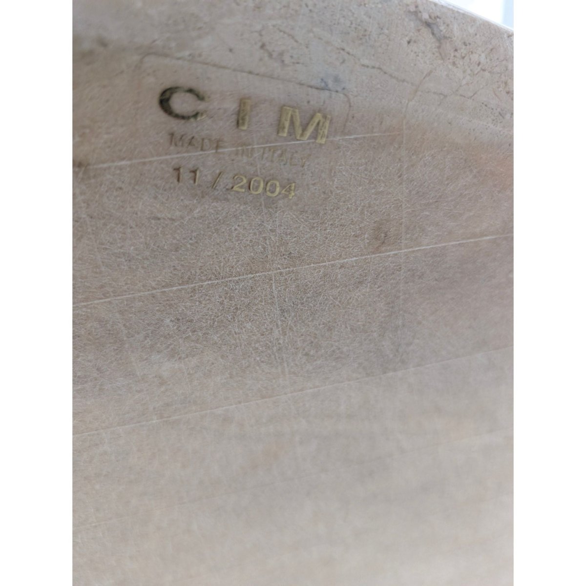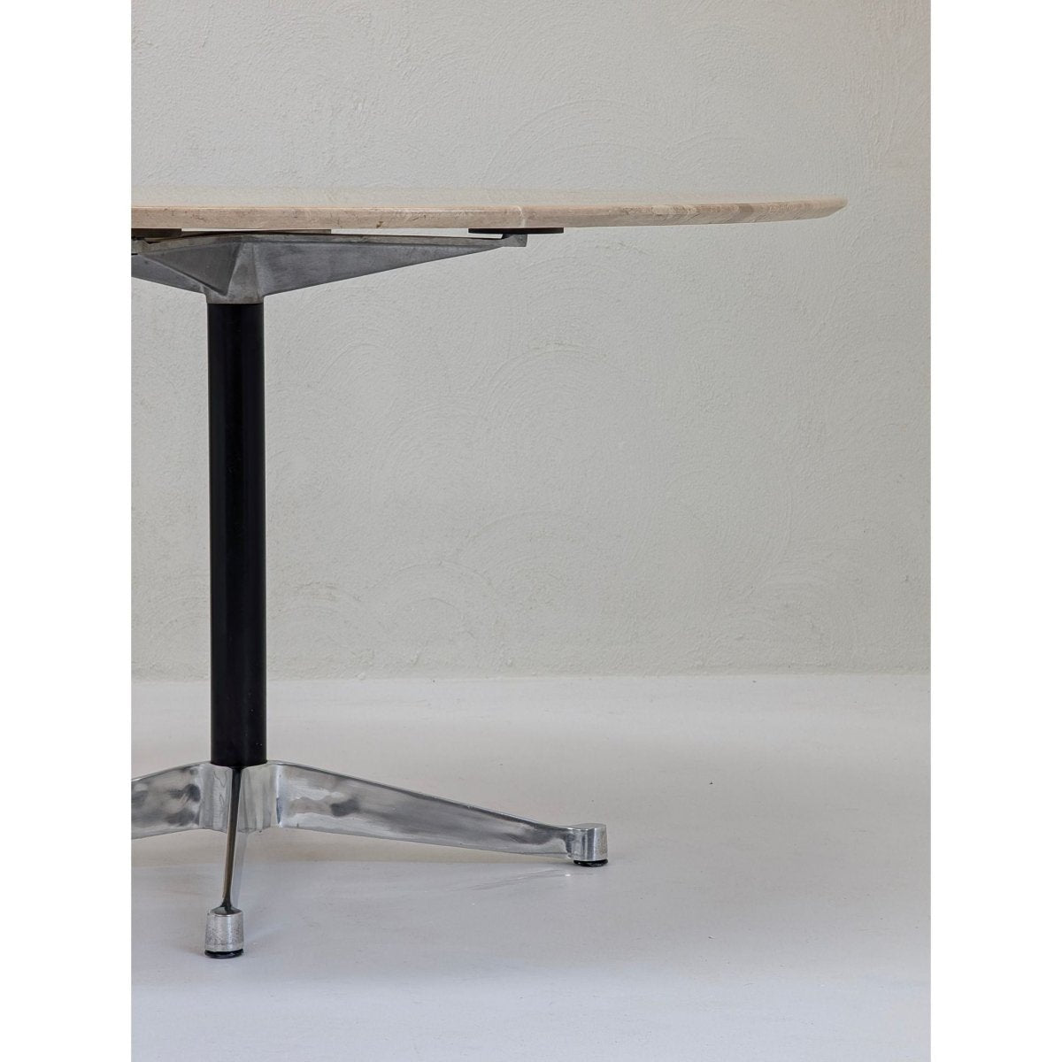 The foundation is the timeless Eames ET610 contract table base from the 1960s, with its classic black steel column and four-star polished aluminium legs. This supports a substantial, custom-made Italian Travertine tabletop, crafted by the renowned stonemasons at C.I.M. Italy in November 2004.