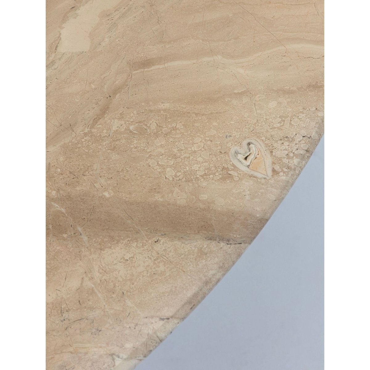 The tabletop is distinguished by a sophisticated, bevelled Platner-style edge, a detail synonymous with the highest level of mid-century design. This premium finish is complemented by an extraordinary feature: embedded within the travertine is the fossil of an ancient bivalve mollusc. By a remarkable feat of chance, the stone was perfectly sliced during its preparation, revealing a flawless and captivating heart-shaped cross-section. This beautiful accident of geology and craftsmanship elevates the piece from furniture to a work of natural art.