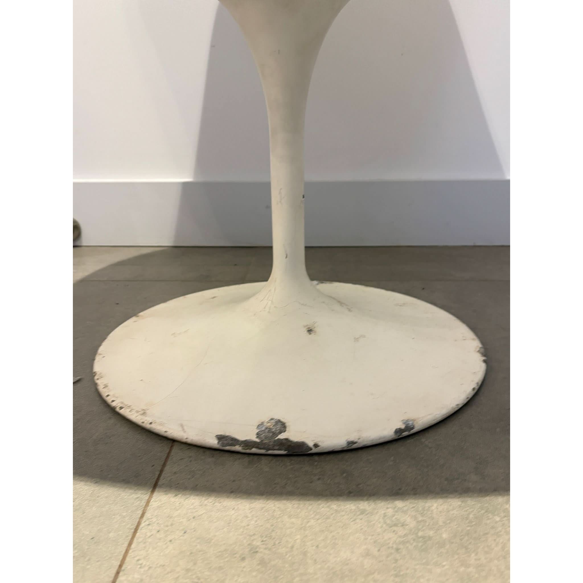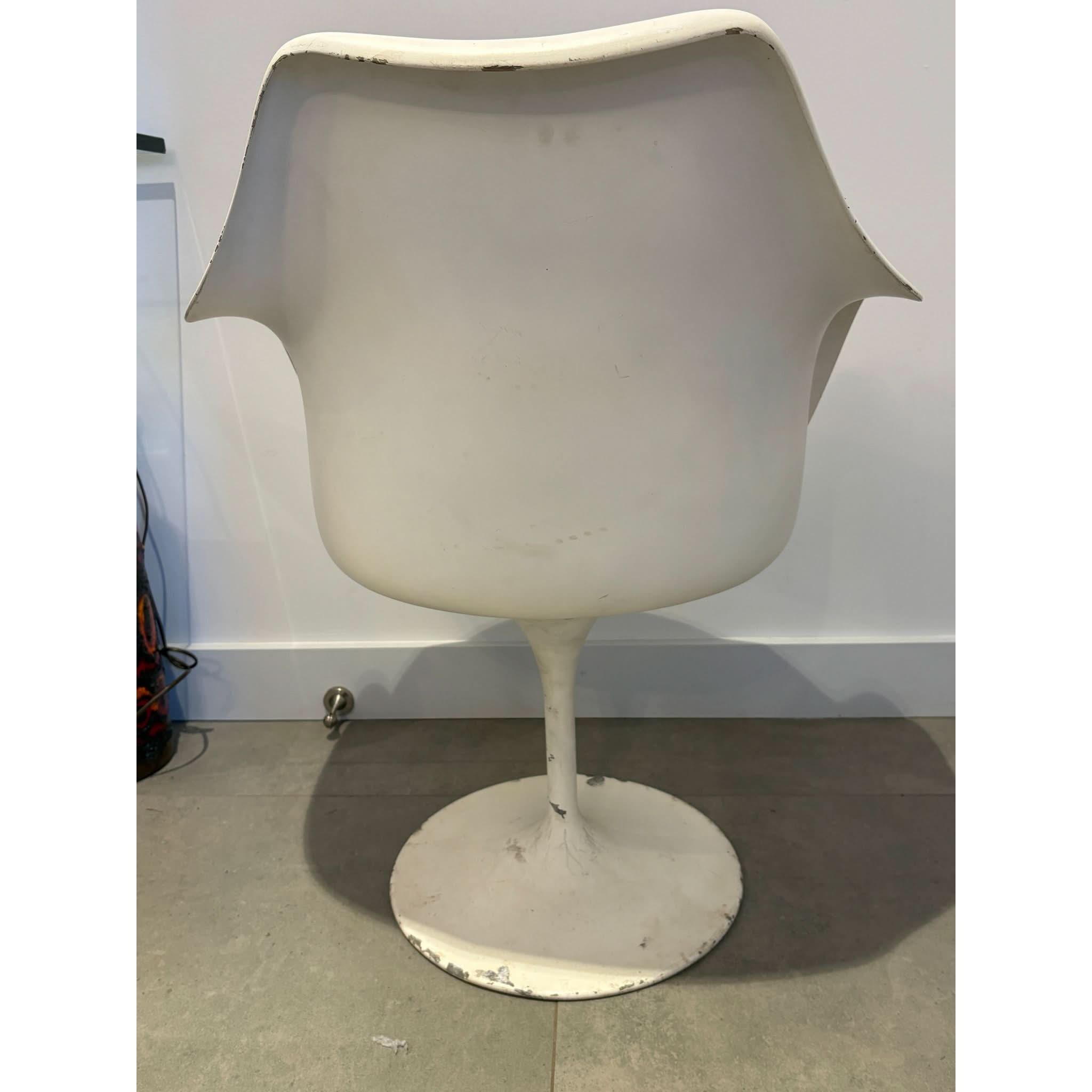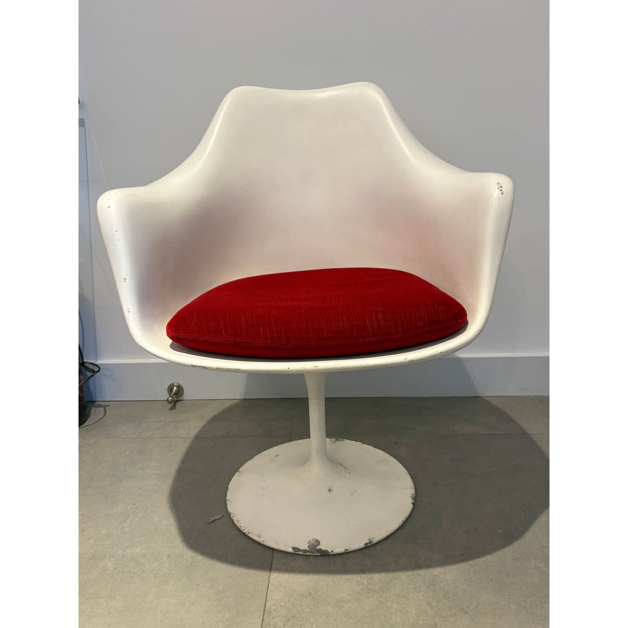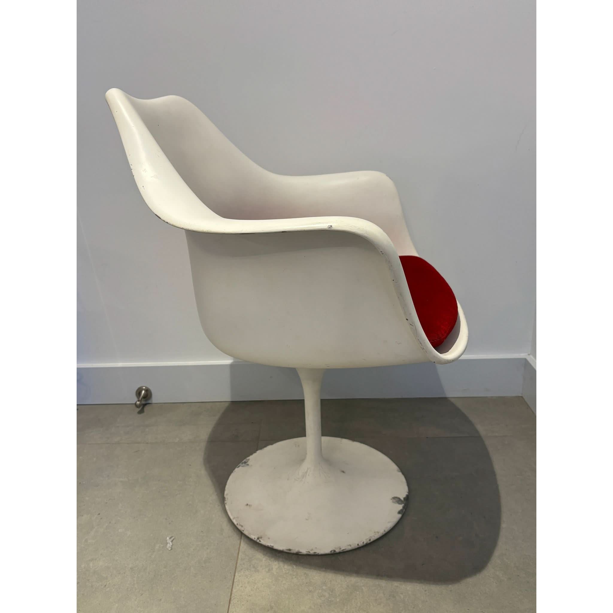 Eero Saarinen Tulip Arm Chair, circa 1960s. A mid-century modern classic by Knoll. Features the iconic pedestal base, moulded fibre glass shell and original red seat cushion. Authentic vintage with wear consistent with age, adding to its timeless character.