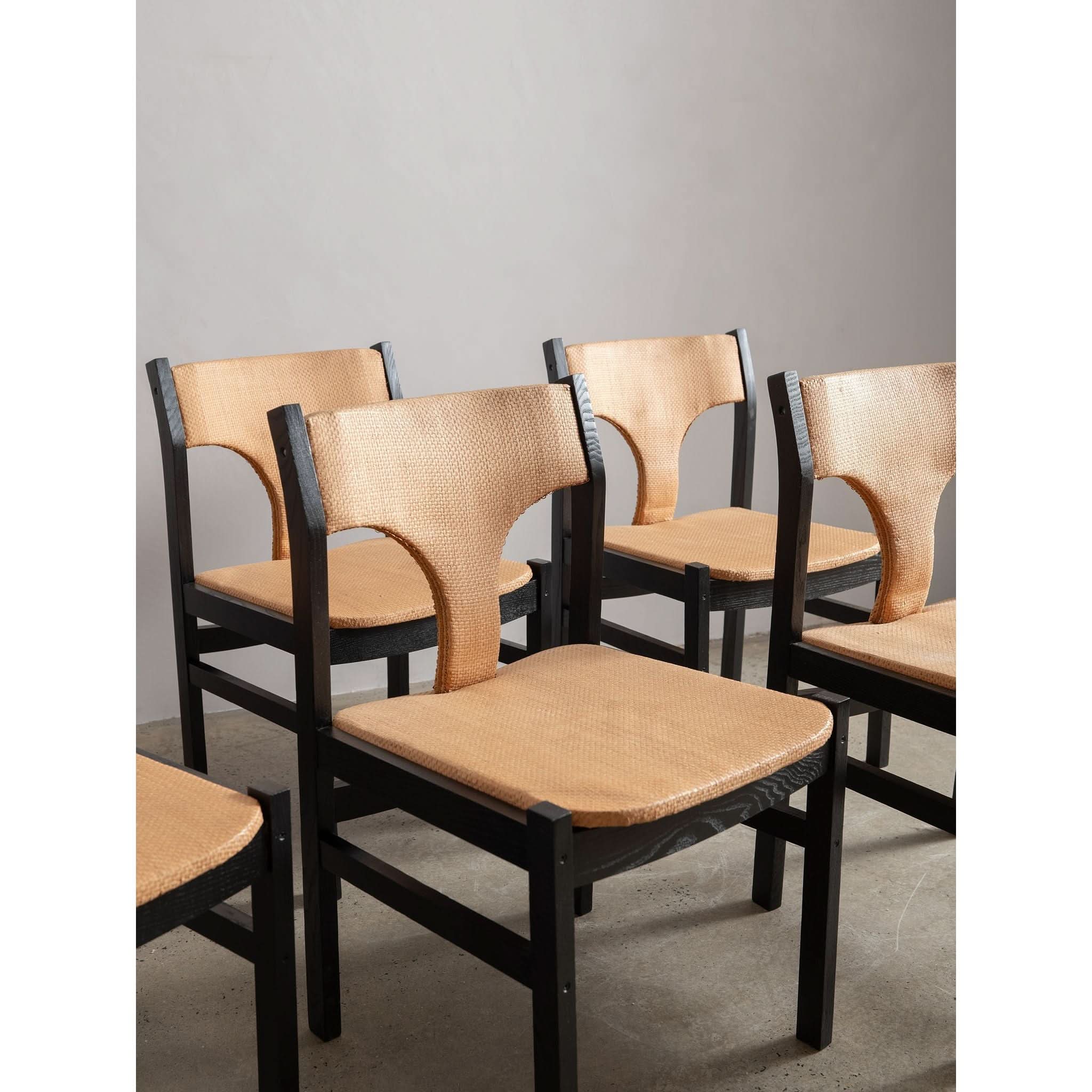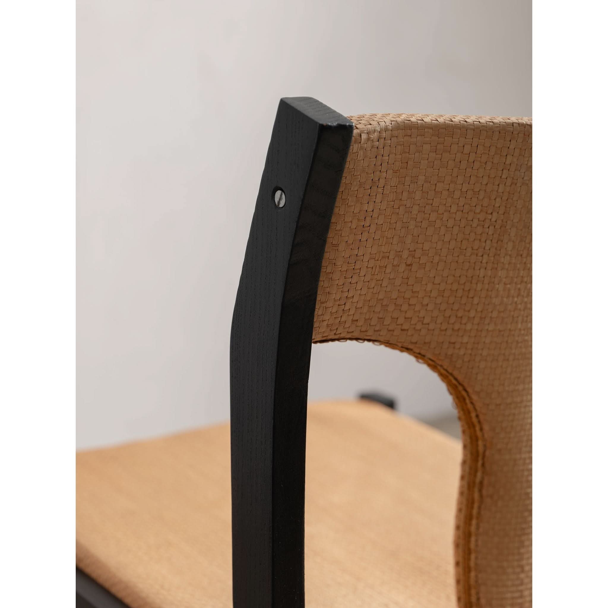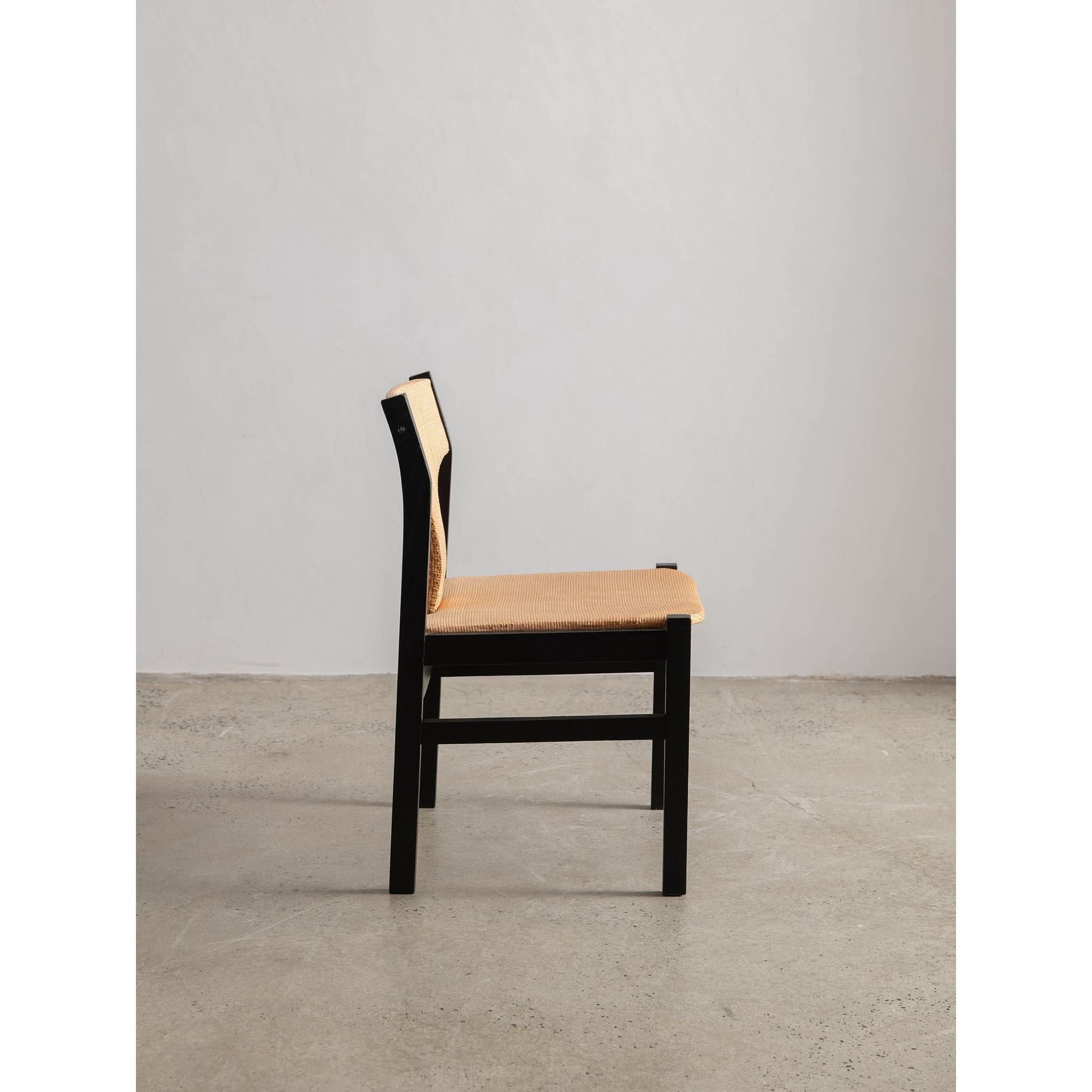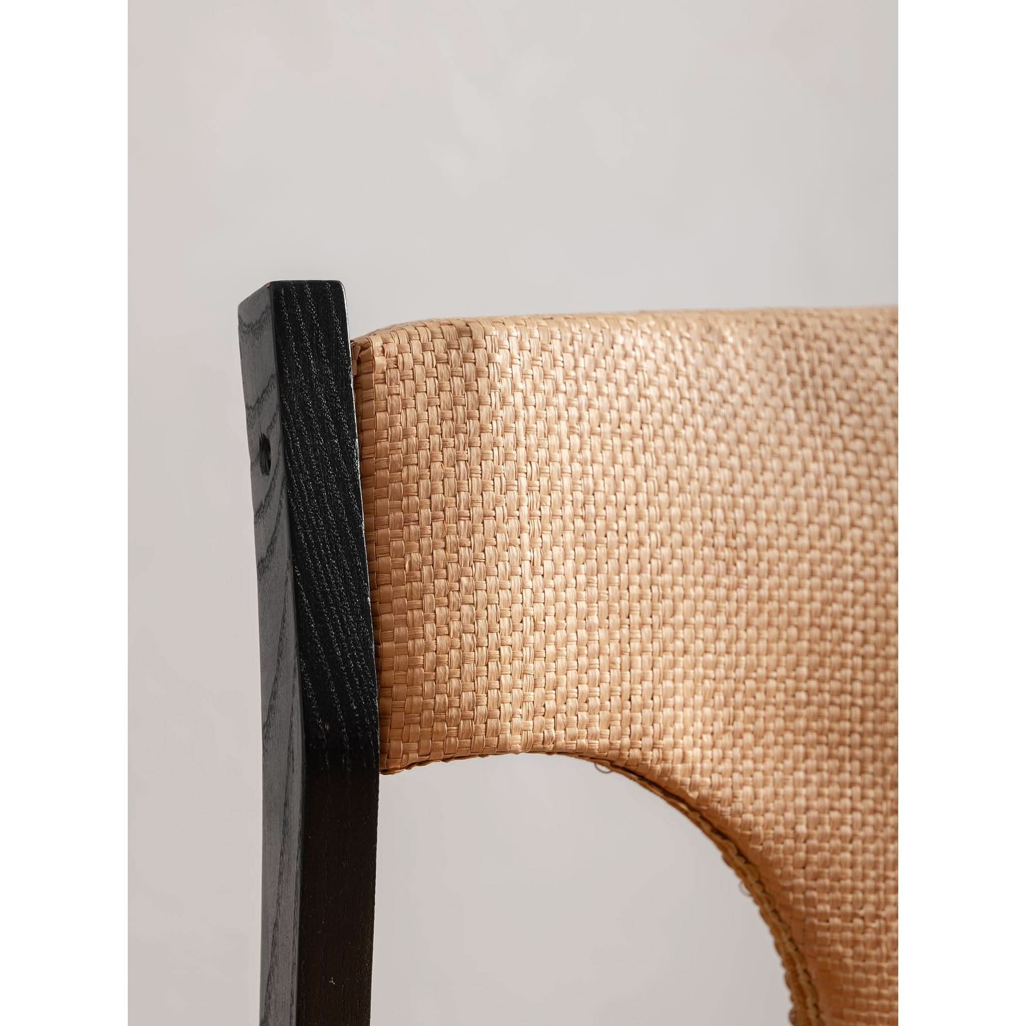 These mid-century dining chairs are a study in contrast and craftsmanship. The ebonized wooden frames provide a sleek, architectural foundation, beautifully offset by the natural warmth of rattan. Both the seat and the uniquely shaped backrest are finished in finely woven rattan, offering a tactile, organic elegance against the bold black finish.