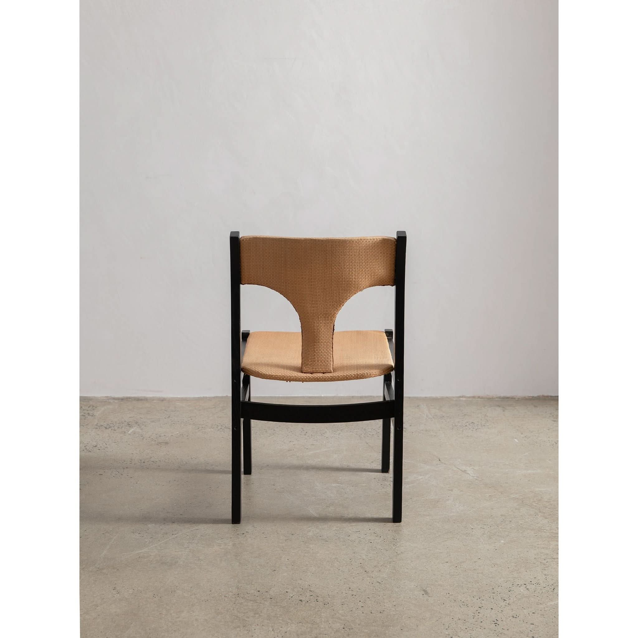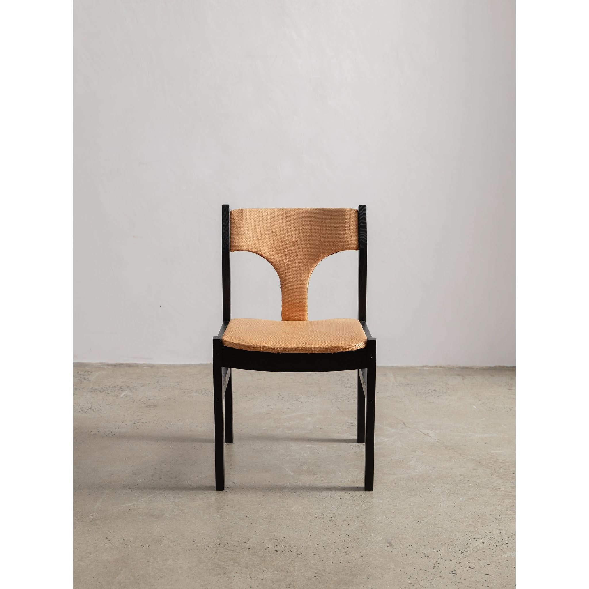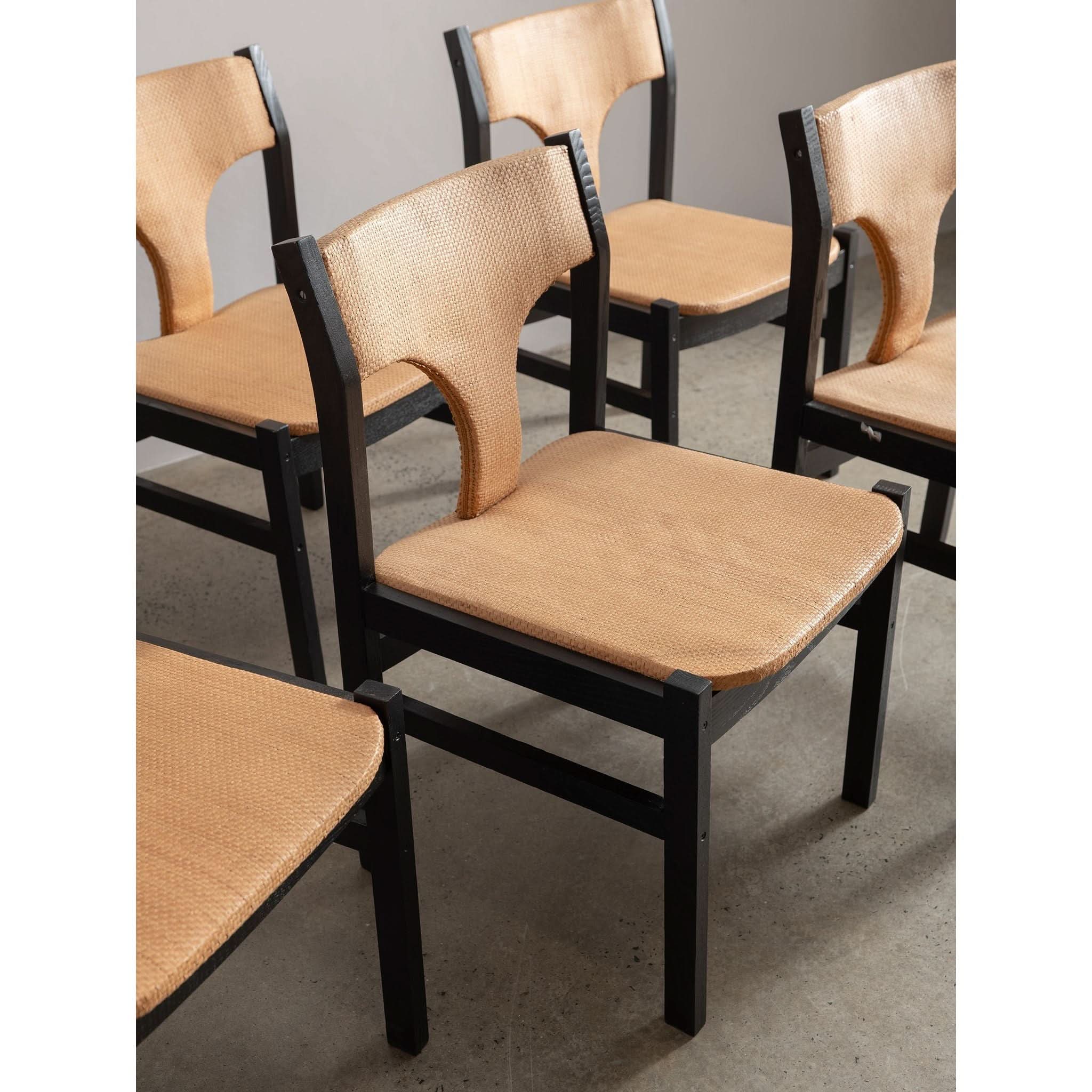These mid-century dining chairs are a study in contrast and craftsmanship. The ebonized wooden frames provide a sleek, architectural foundation, beautifully offset by the natural warmth of rattan. Both the seat and the uniquely shaped backrest are finished in finely woven rattan, offering a tactile, organic elegance against the bold black finish.
