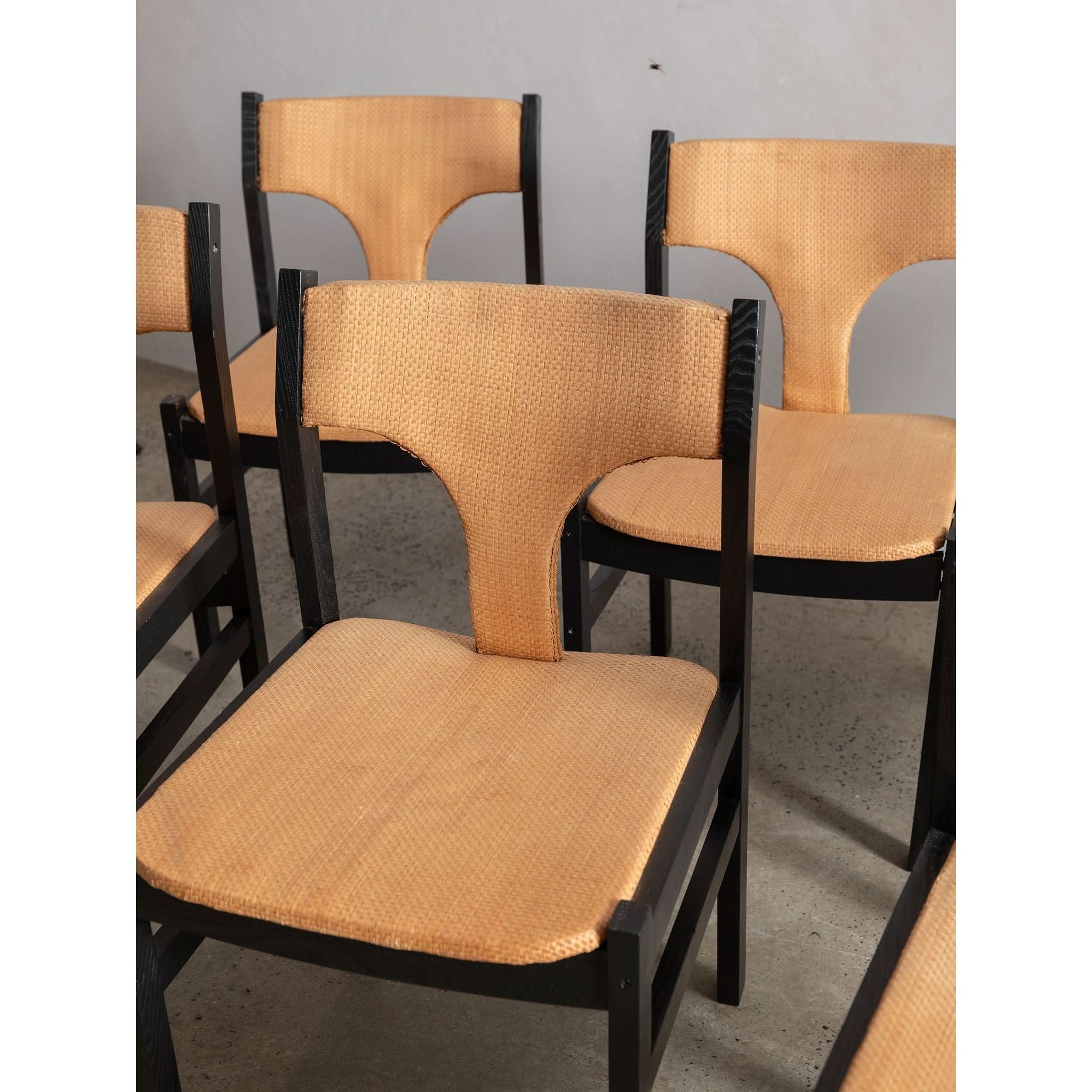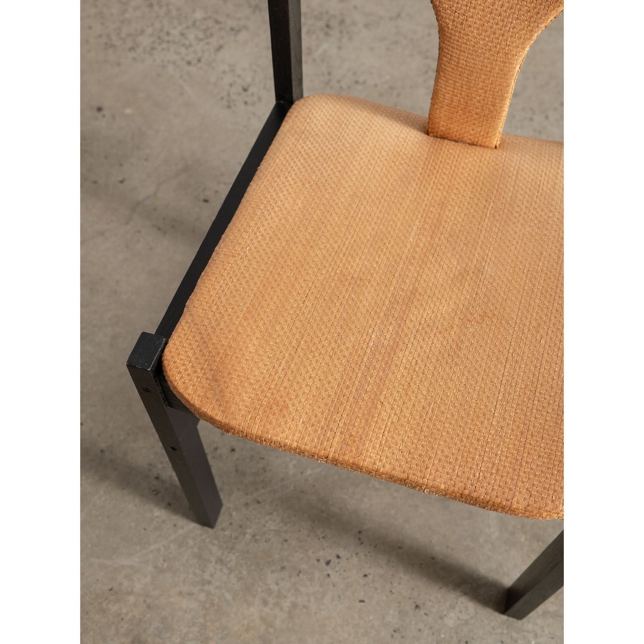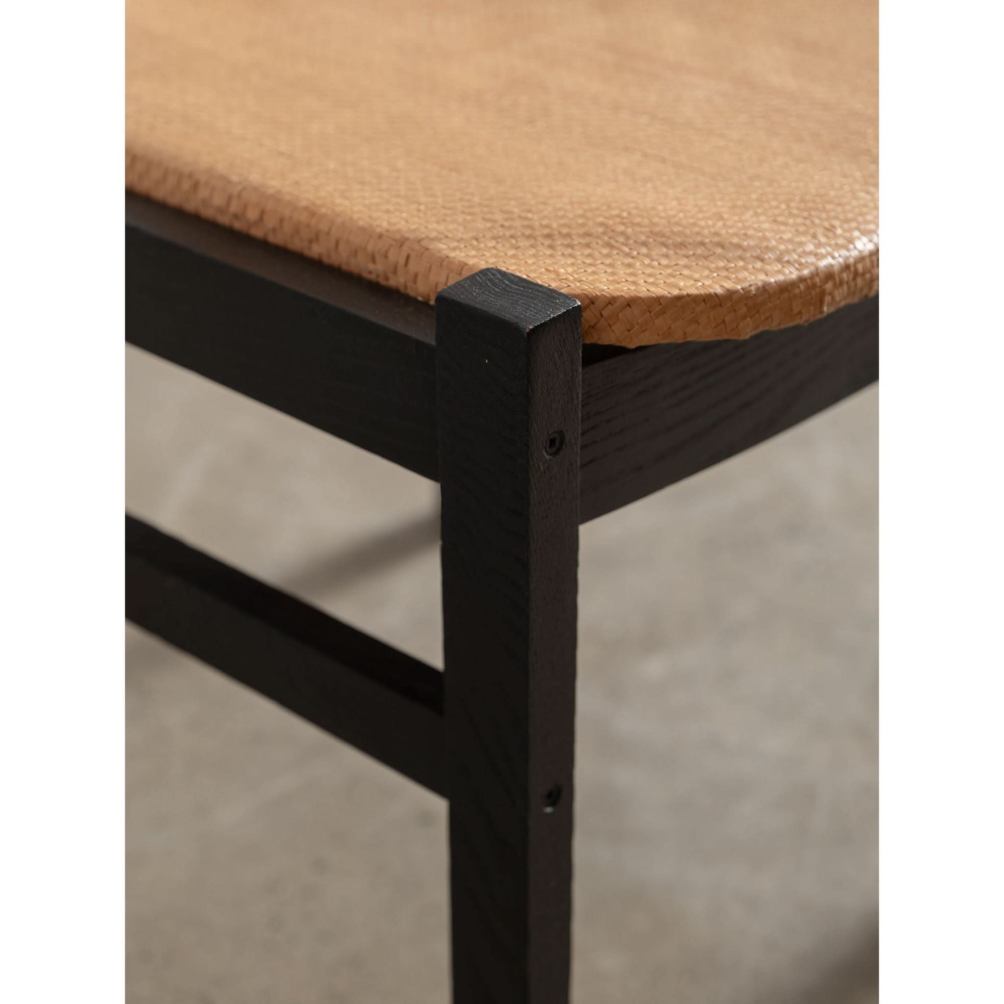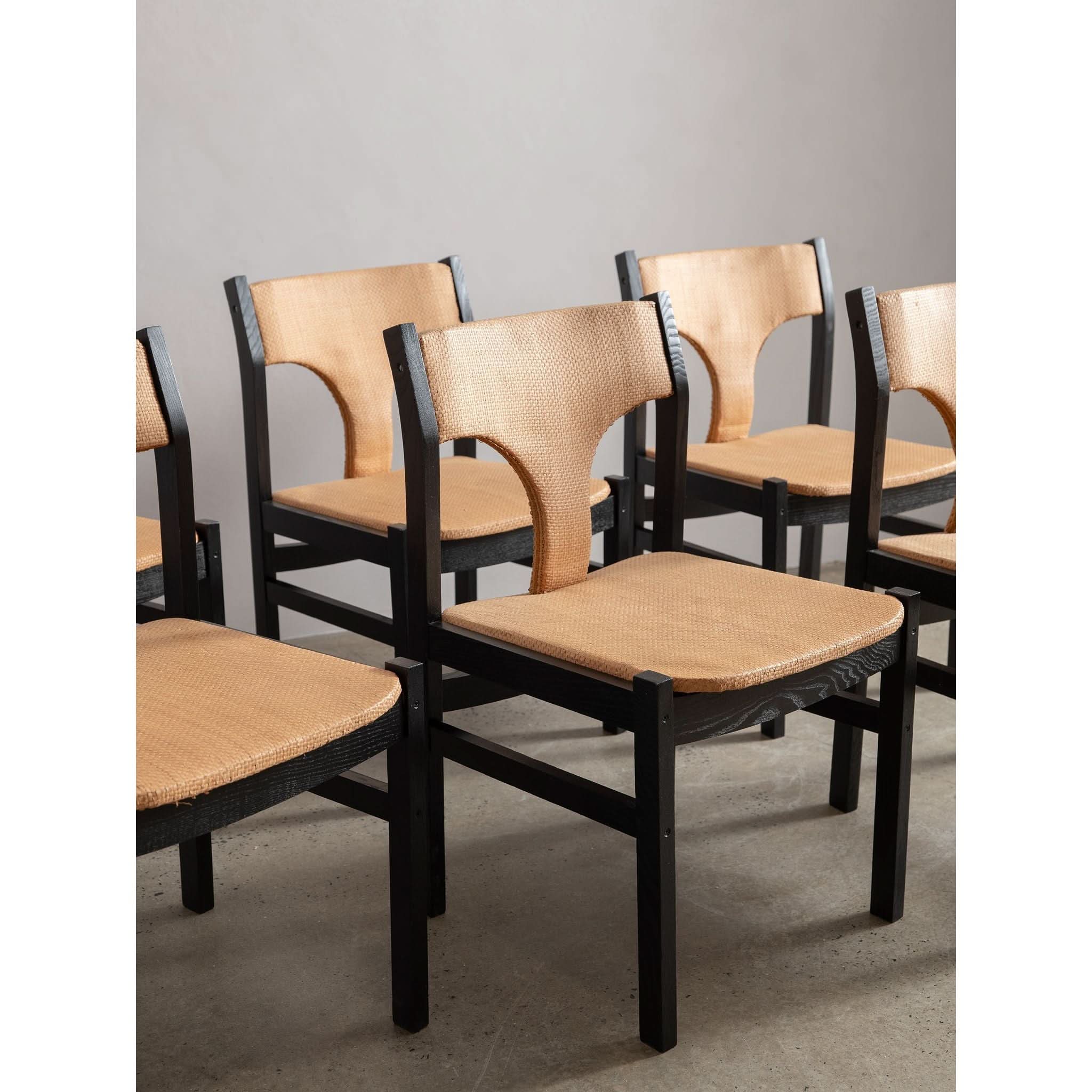These mid-century dining chairs are a study in contrast and craftsmanship. The ebonized wooden frames provide a sleek, architectural foundation, beautifully offset by the natural warmth of rattan. Both the seat and the uniquely shaped backrest are finished in finely woven rattan, offering a tactile, organic elegance against the bold black finish.