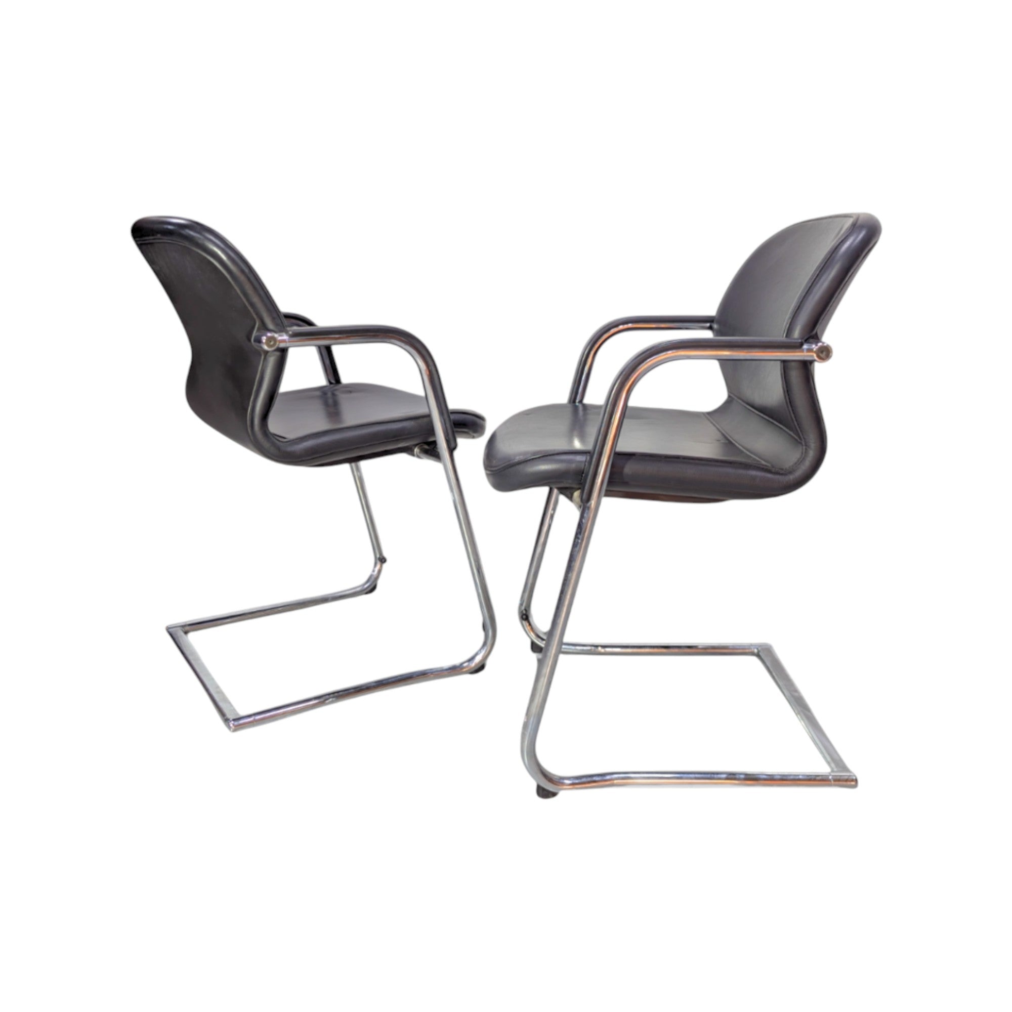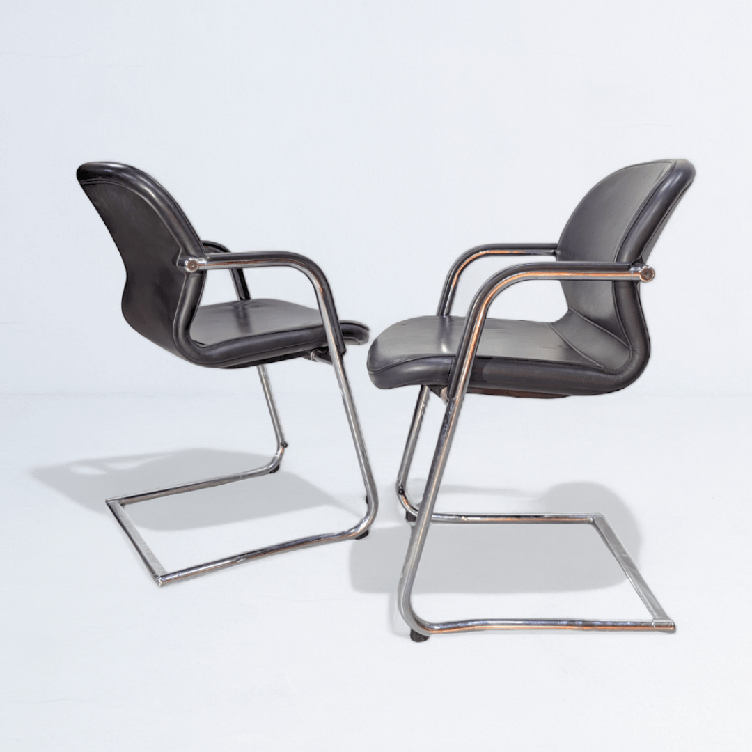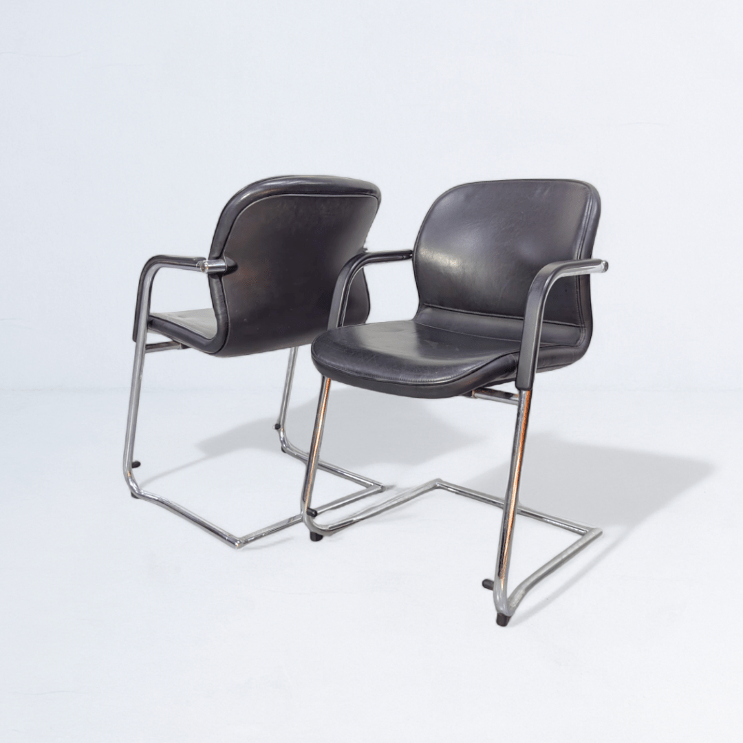 Streamlined German design from Wilkhahn, these cantilever chairs combine black leather upholstery with polished chrome steel frames — a balance of comfort, engineering, and modernist clarity.