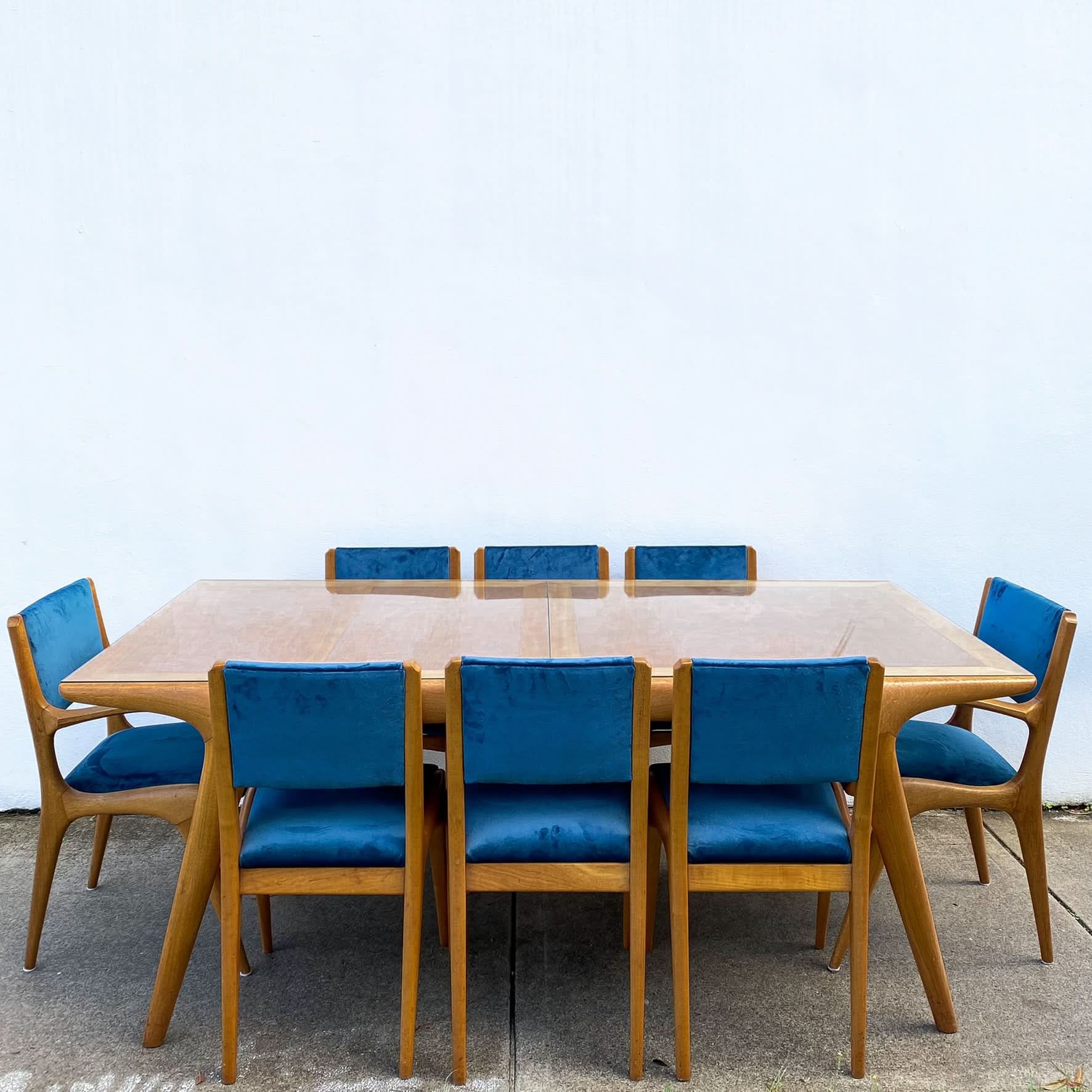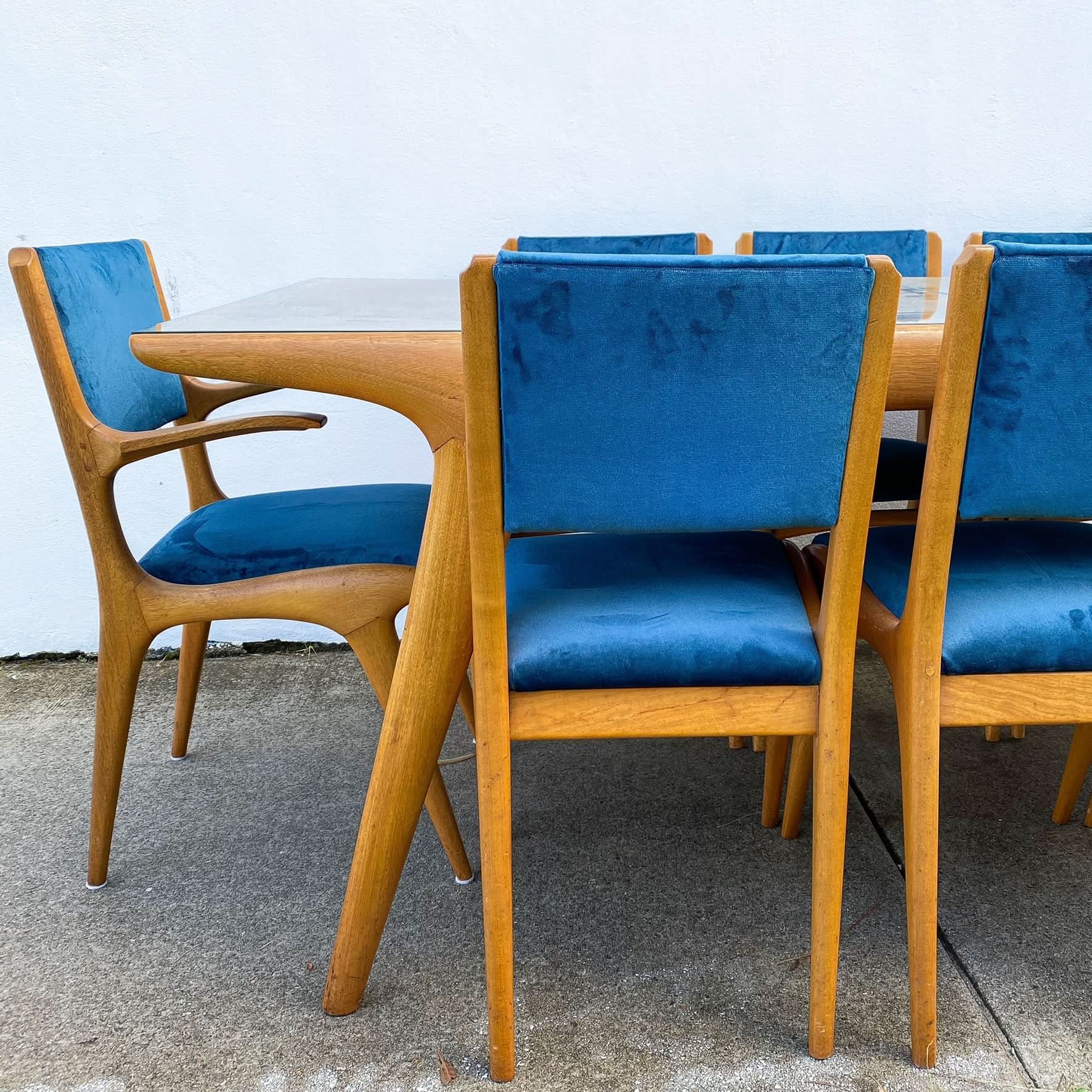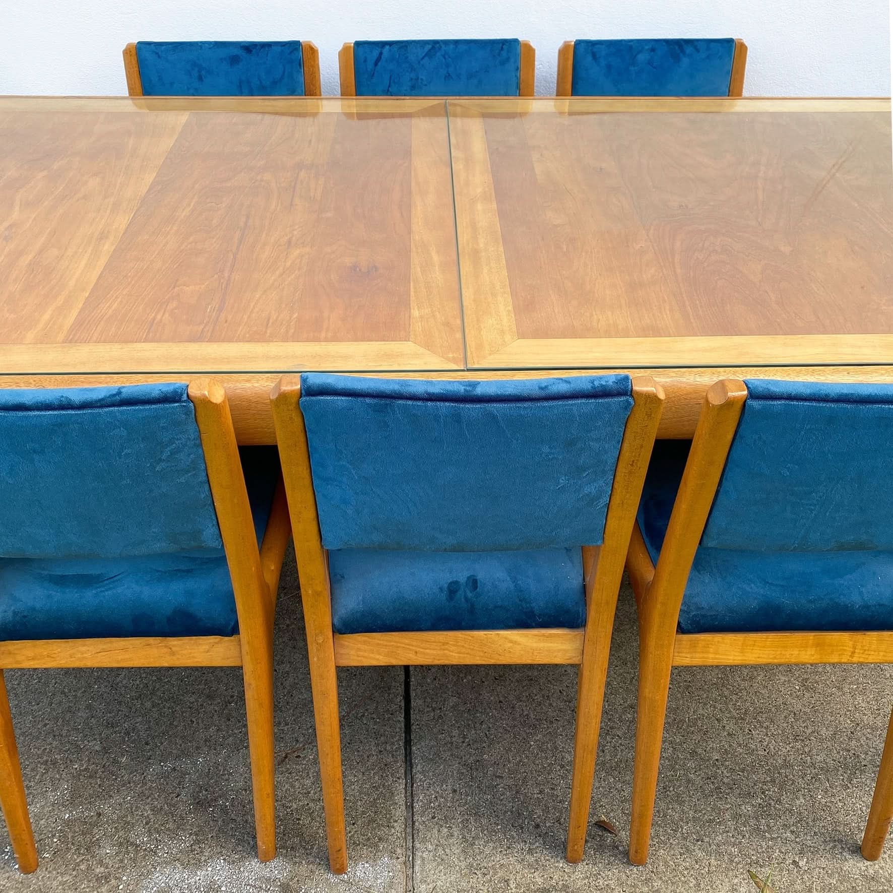 Stunning 9 piece mid century dining suite, with original glass surface. Includes extension table, 6 dining chairs and 2 carvers. Crafted from Queensland maple and coachwood. Newly reupholstered with Warwick royal blue velvet.