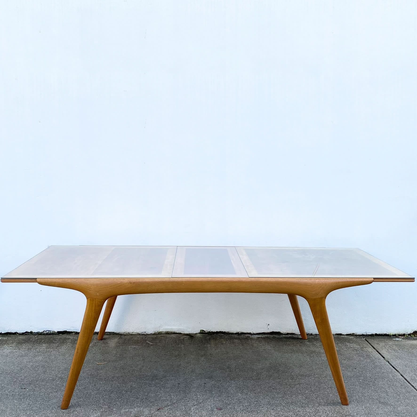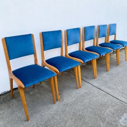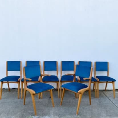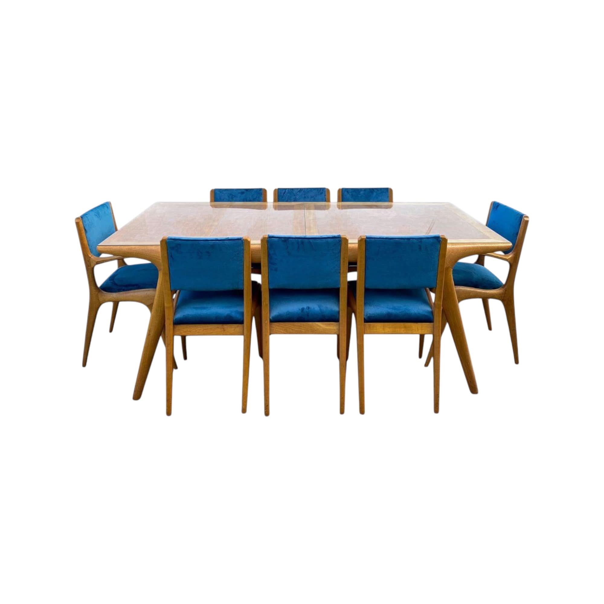 Stunning 9 piece mid century dining suite, with original glass surface. Includes extension table, 6 dining chairs and 2 carvers. Crafted from Queensland maple and coachwood. Newly reupholstered with Warwick royal blue velvet.