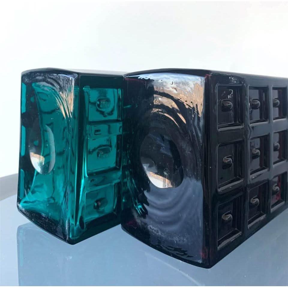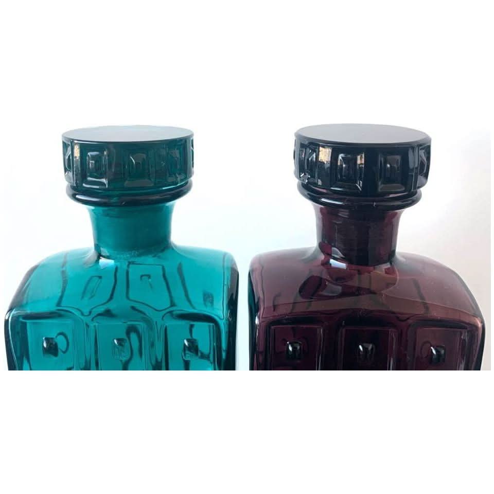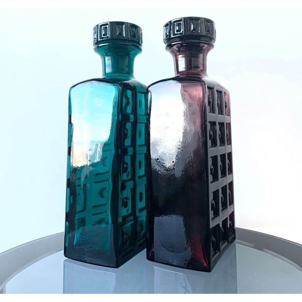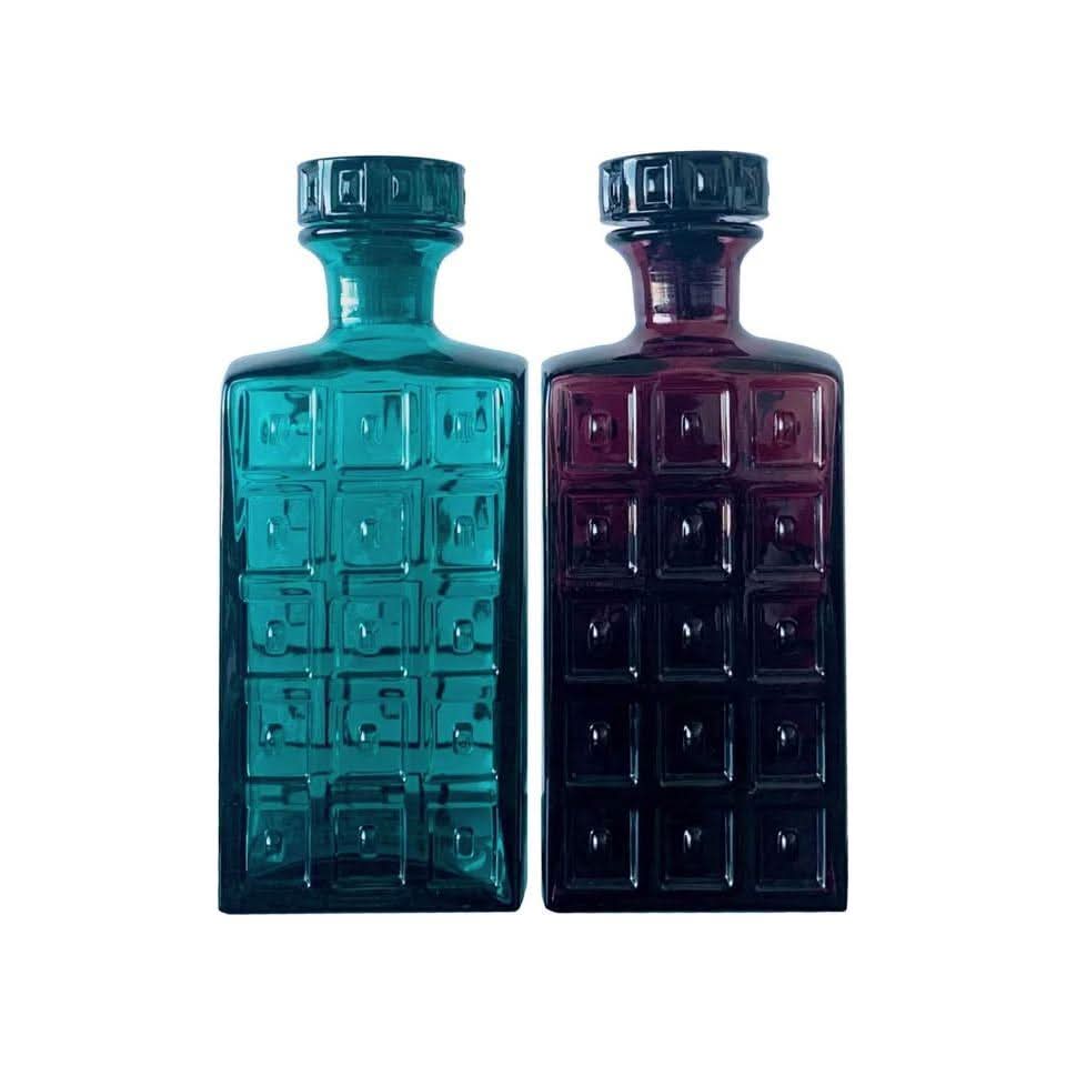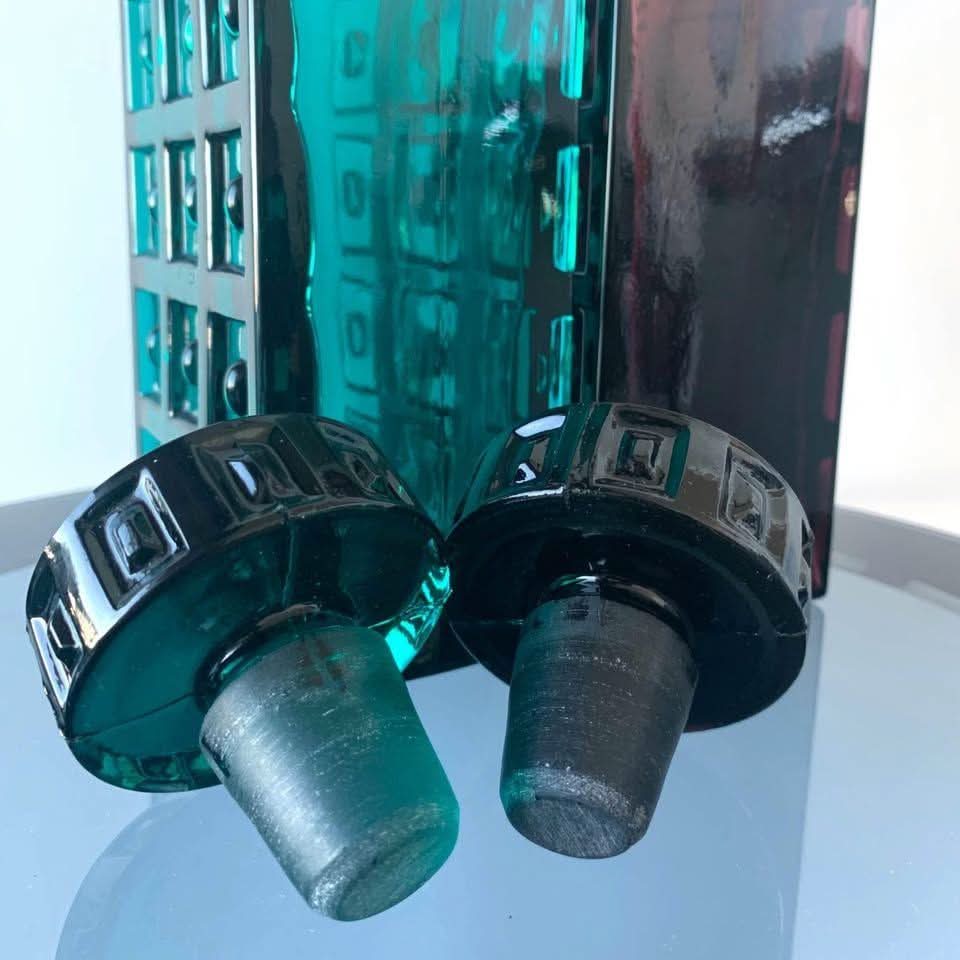 Each bottle of flattened rectangular form with grid design front and back. Of great quality in thick moulded glass, the bases with polished pontil. The bottles are by the famed maker ‘Casa Pupo’ London House in a rich emerald green and burgundy circa 1970s.