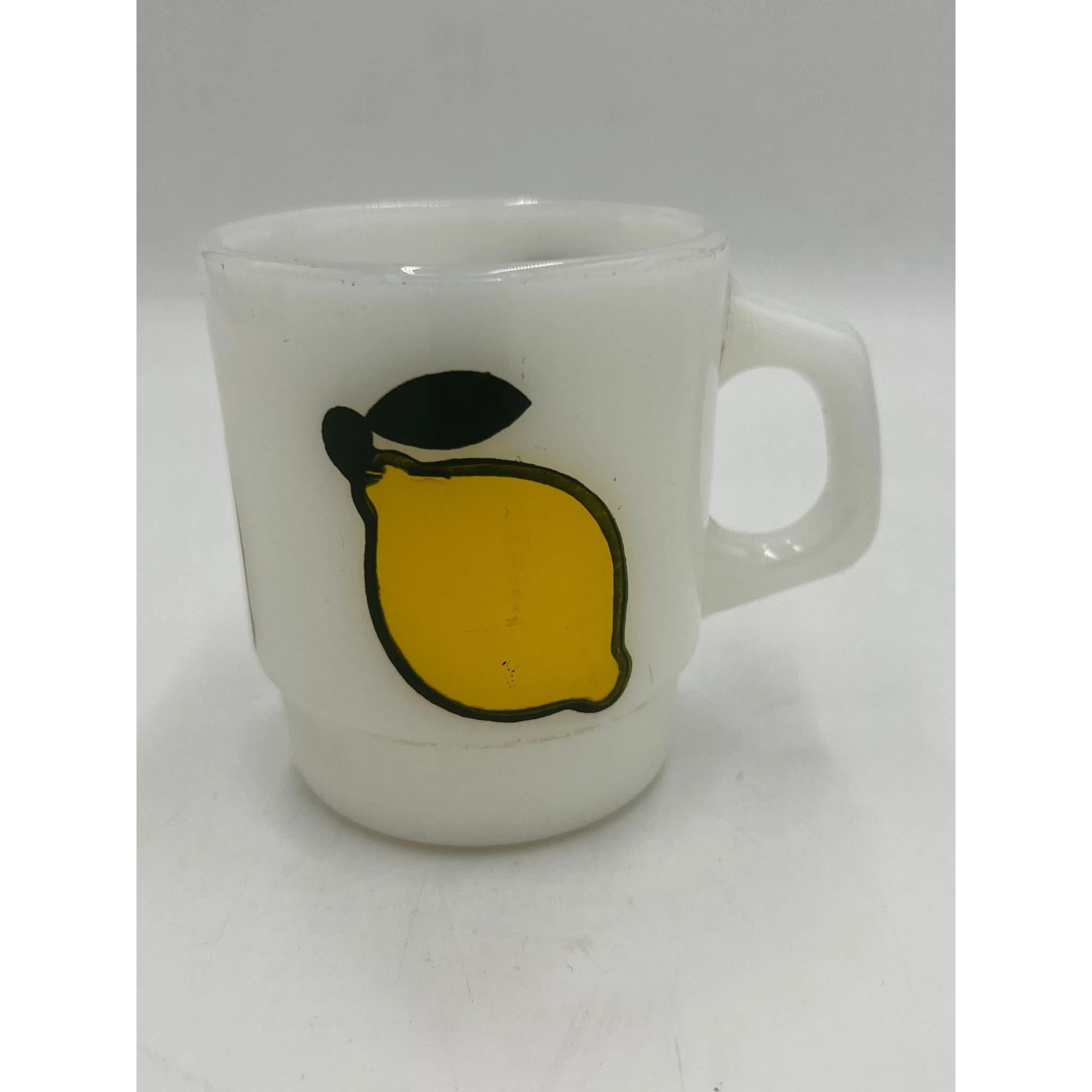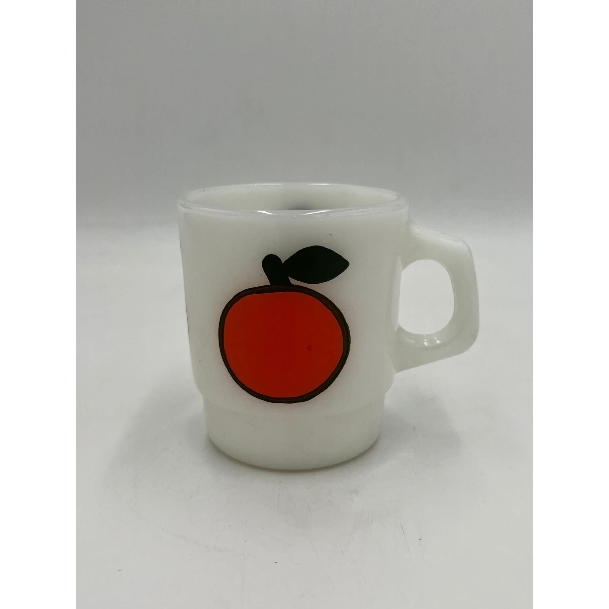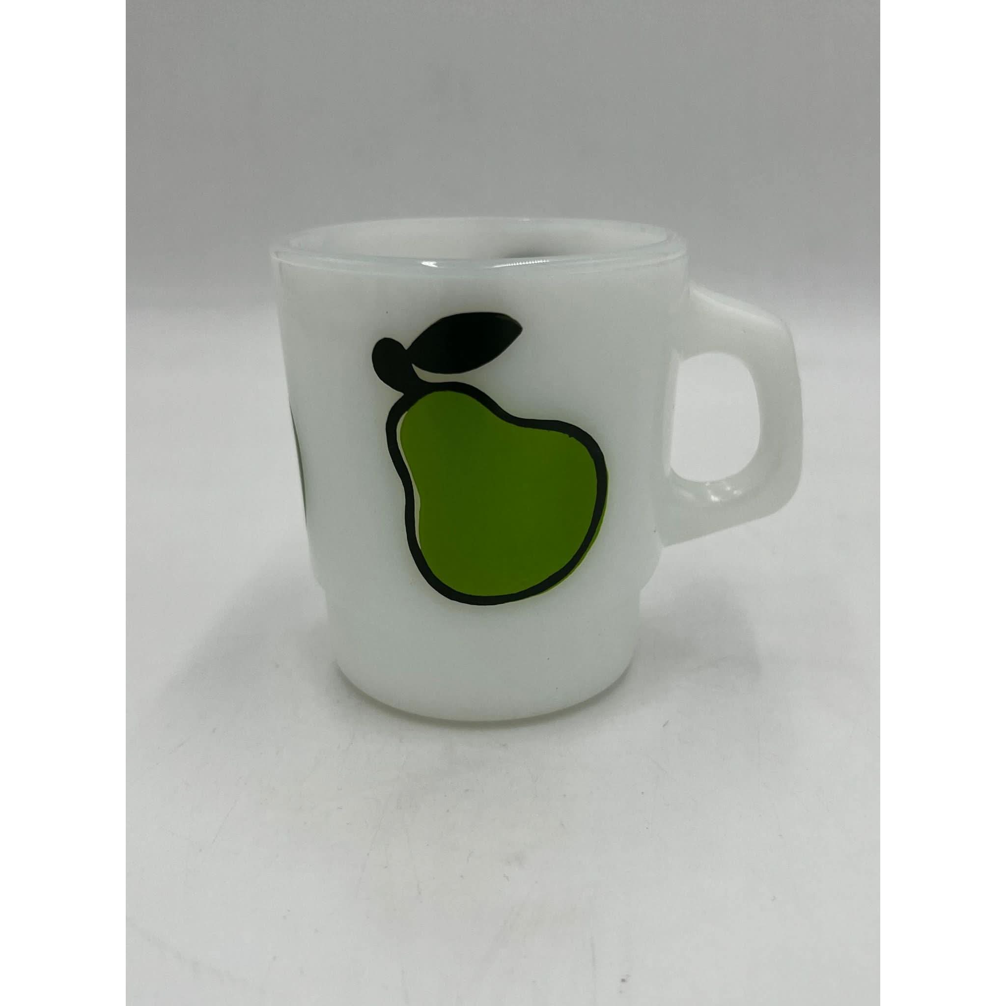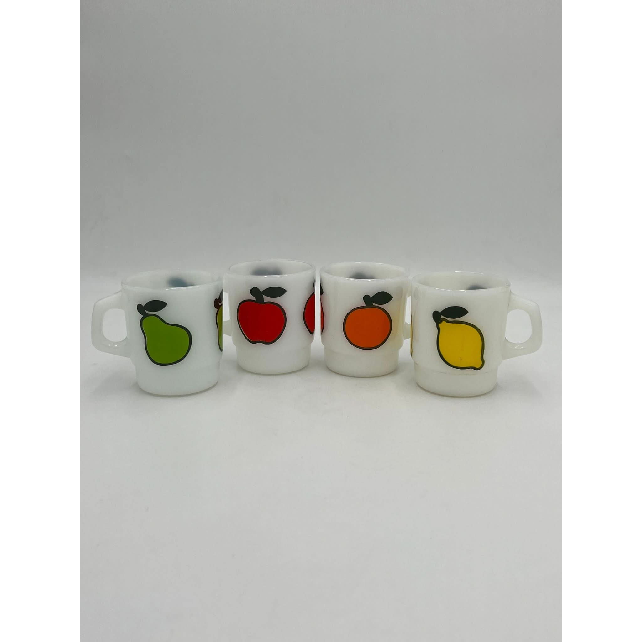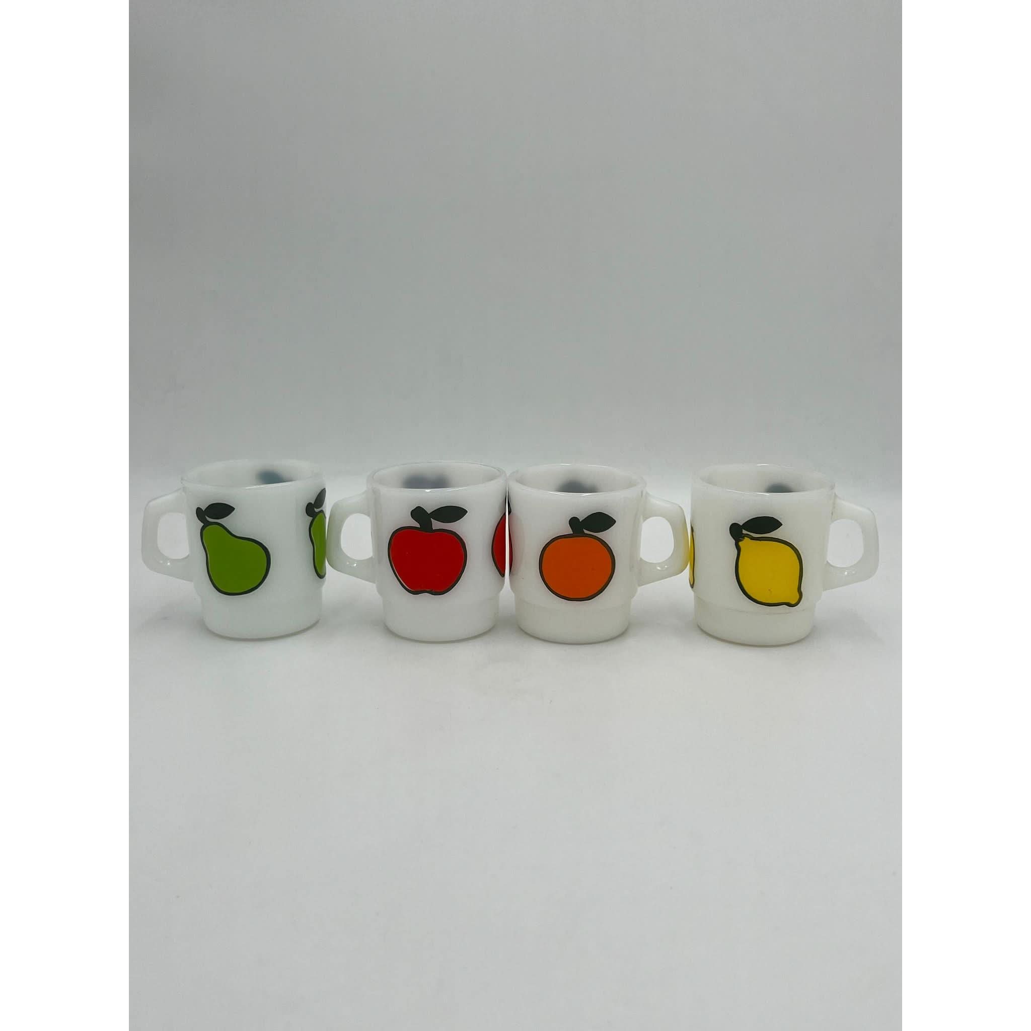 This rare and vibrant set of Anchor Hocking Fire King milk glass mugs feature bold fruit motifs – pear, apple, orange, and lemon. Produced in the 1970s, these collectible mugs are a delightful example of Fire King's playful and iconic mid-century design.