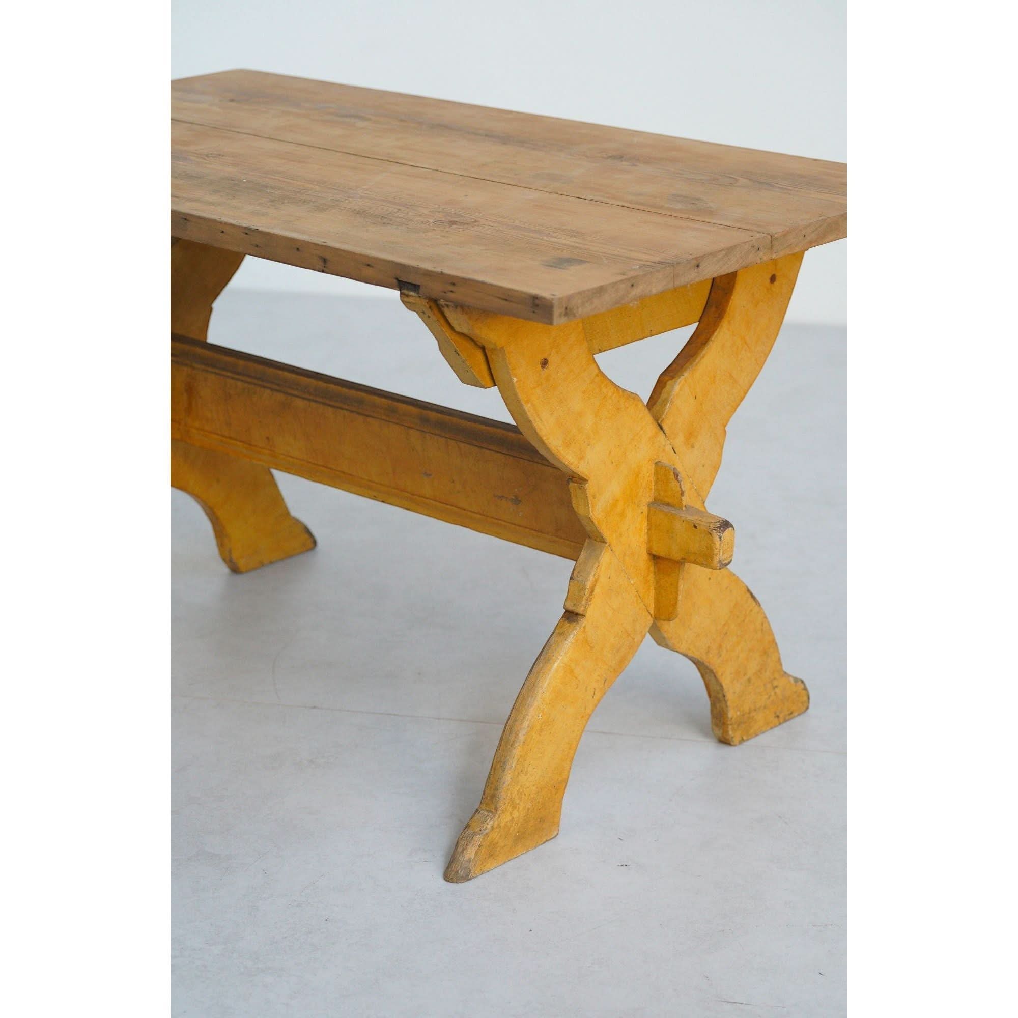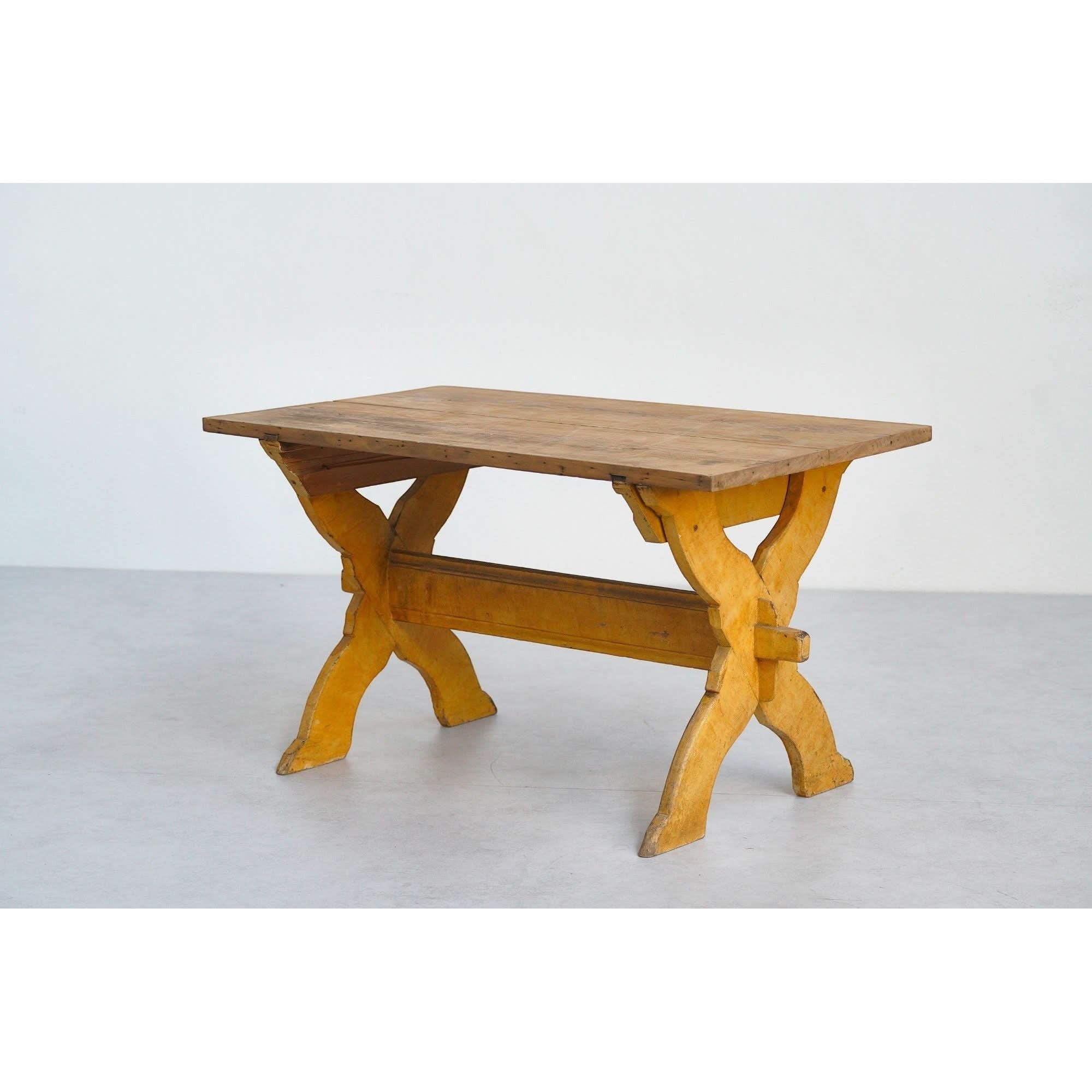 The table's most striking characteristic is its whimsical bow-legged trestle base, a playful design element that feels remarkably contemporary despite its 200-year heritage. The original yellow paint has developed a beautiful patina over time, with natural wear creating an authentic rustic charm that speaks to generations of use in Swedish country homes.