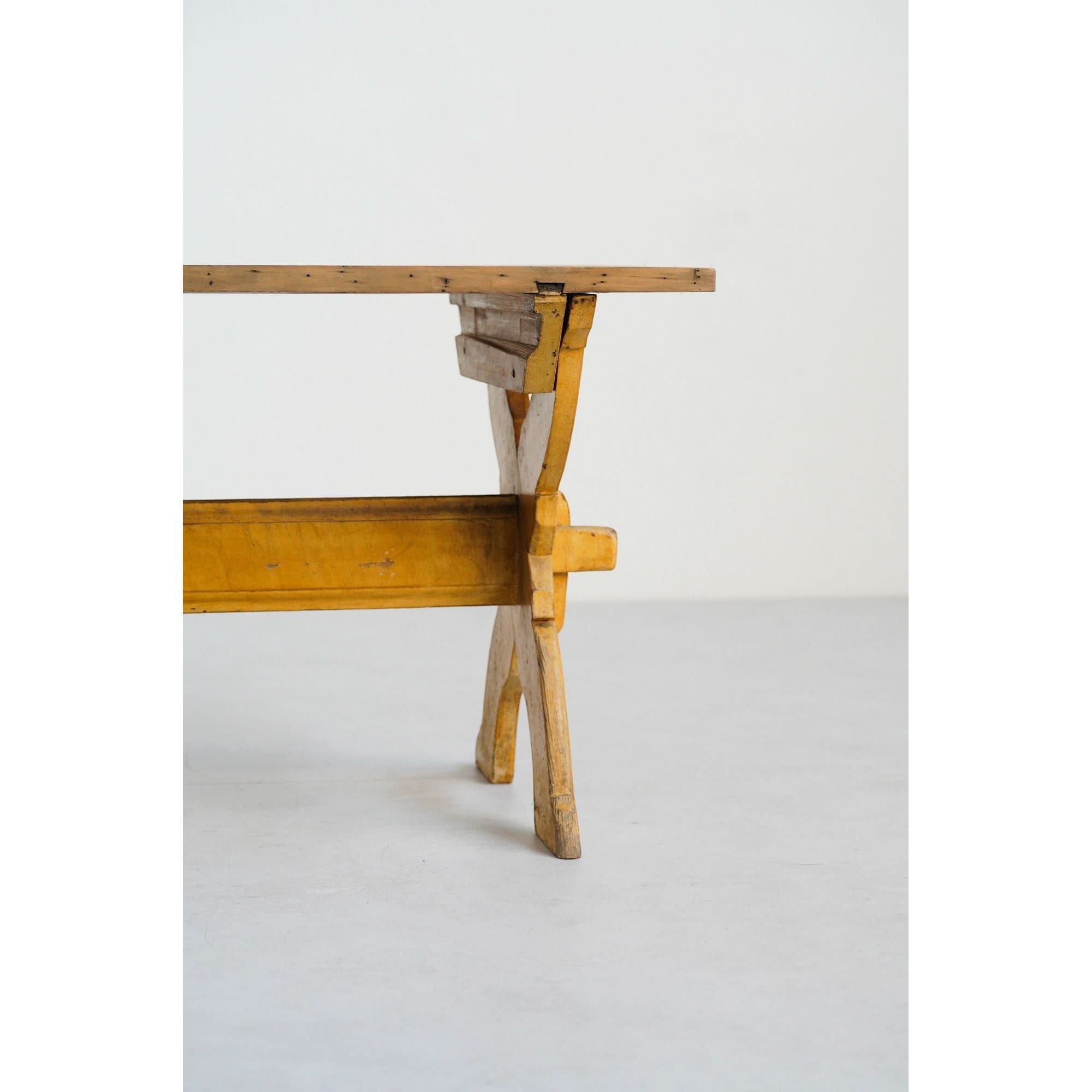 Crafted entirely from solid Swedish pine, this antique trestle table remains in excellent stable condition. All age-related wear is consistent with its 19th century origins and adds to rather than detracts from its charm. The traditional trestle construction ensures lasting durability while maintaining the piece's folk art appeal.