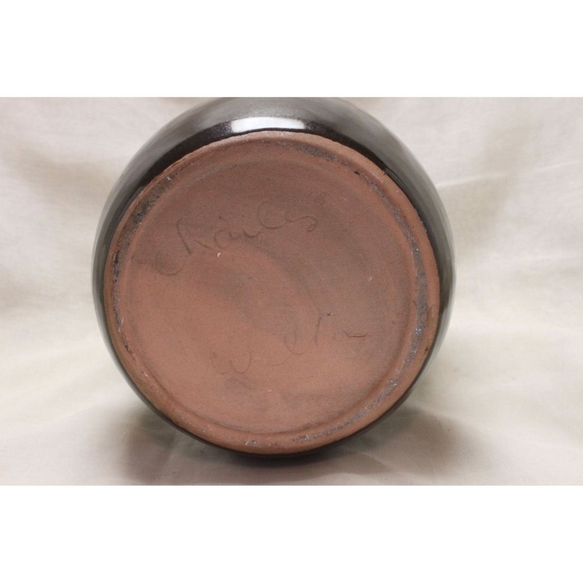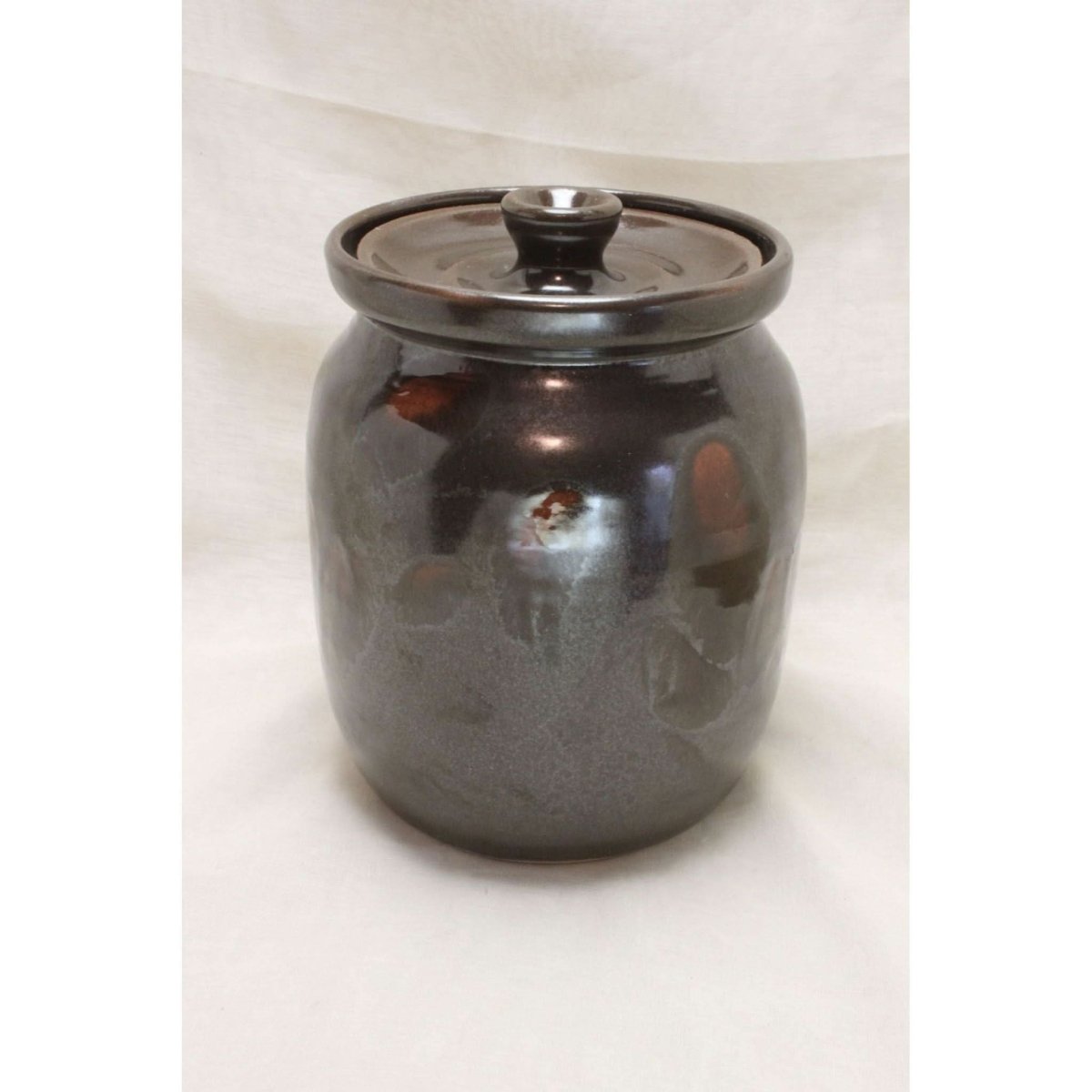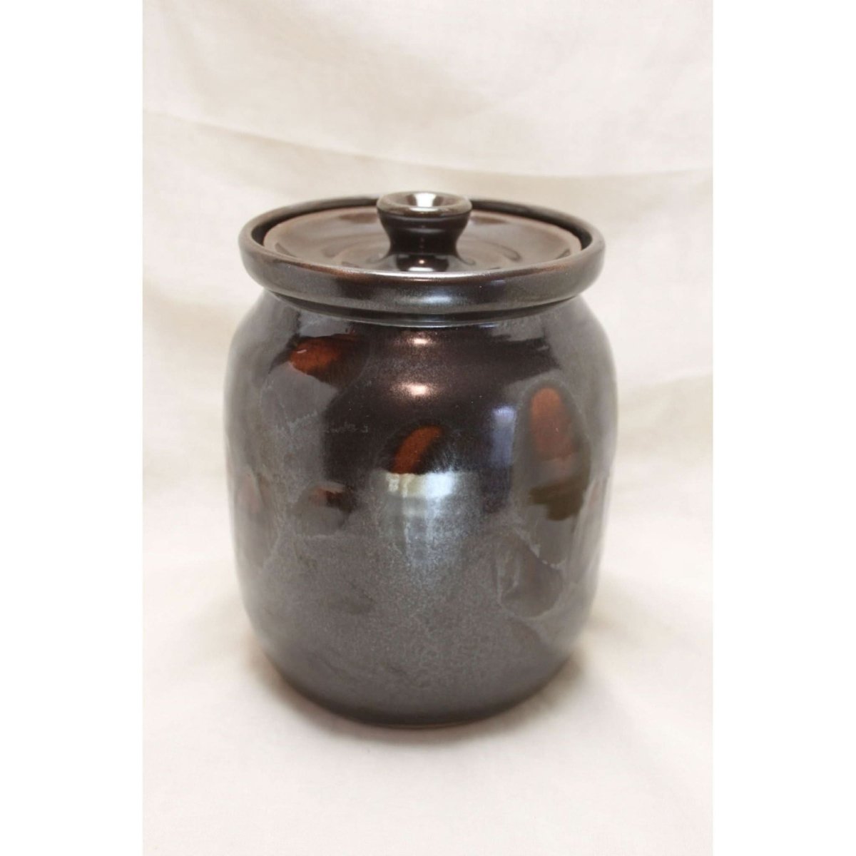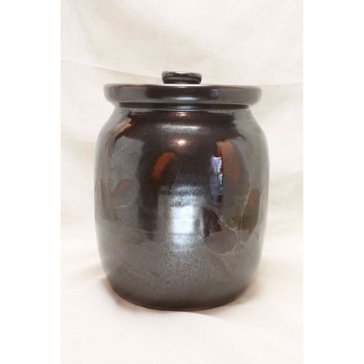 After throwing this lidded jar on the wheel, Charles Wilton has decorated it by dipping it in a chocolatey brown glaze, then wiping away small random areas to expose the orange coloured clay underneath. Wilton (1916-2000) was one of the co-founders of the Potters Cottage in Warrandyte in 1958 and retired in 1992. This thickly potted jar stands 180 mm high and has a diameter of 145 mm. It is in very good condition with only a tiny chip to the lid rim to detract from it. It would date from the 1970's.