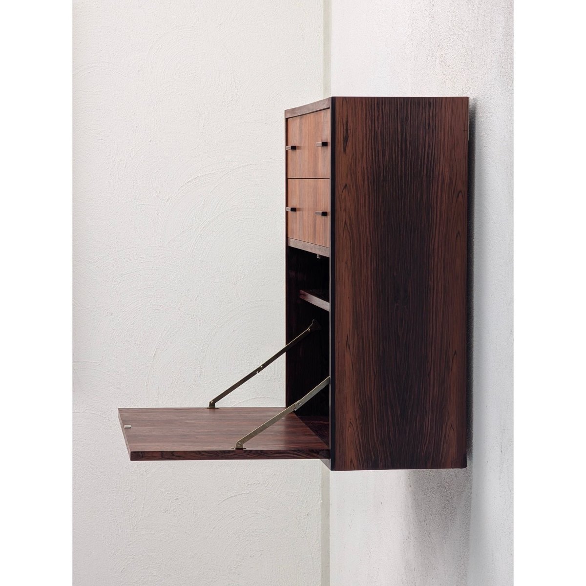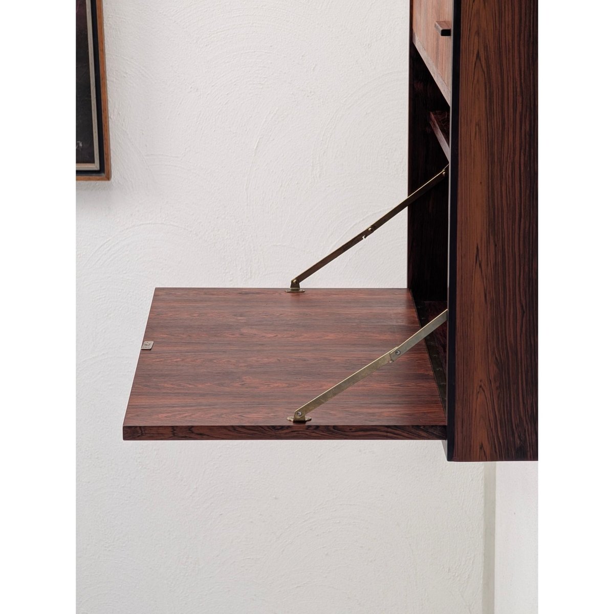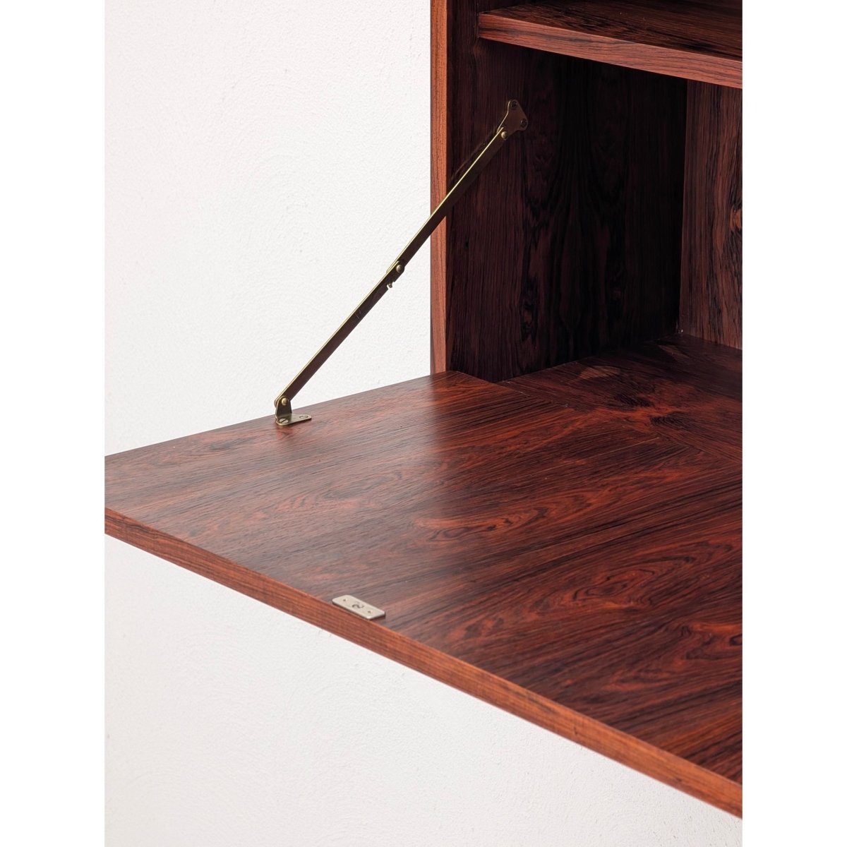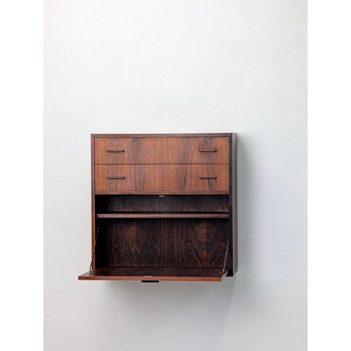 A rare and exceptionally fine example of Danish Modern cabinetmaking. This floating wall-mounted secretary, produced in Denmark circa 1960, is a masterclass in material, form, and function. It transcends the ordinary, showcasing a superior level of artistry and precision in its joinery and construction.