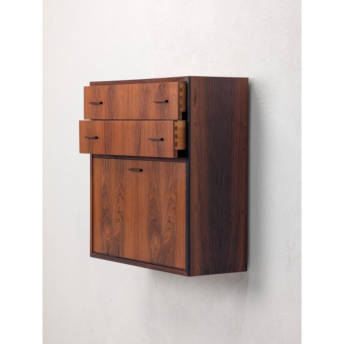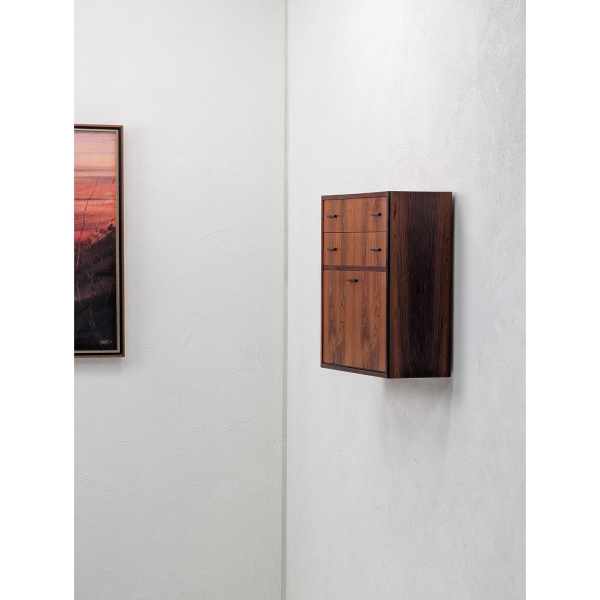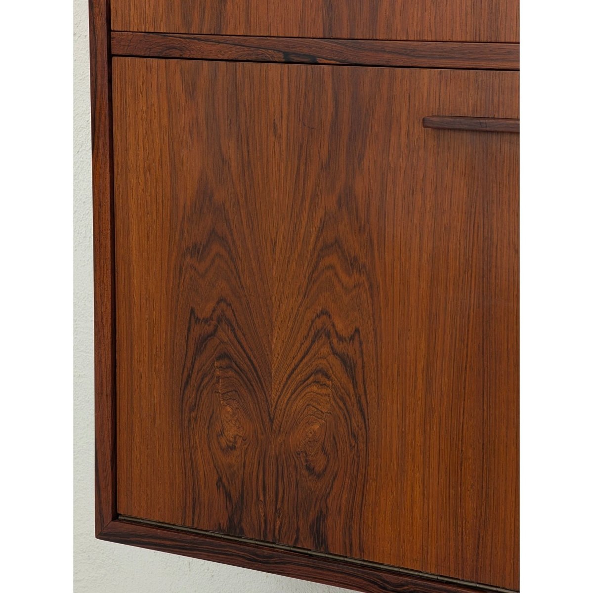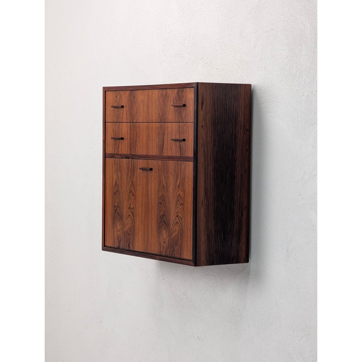 Designed to float elegantly on the wall, the cabinet has a light, architectural presence. The form is pure and rectilinear, allowing the richness of the rosewood and the precision of the joinery to take center stage. What distinguishes this piece are its unique, hand-sculpted solid rosewood handles. Their elongated, organic form is a distinct design signature, setting it apart from the more common styles of the period. While the designer and manufacturer remain unidentified, the superlative quality is undeniable. This is not a mass-produced item, but rather the work of a master cabinetmaker from a high-quality furniture factory (Møbelfabrik).