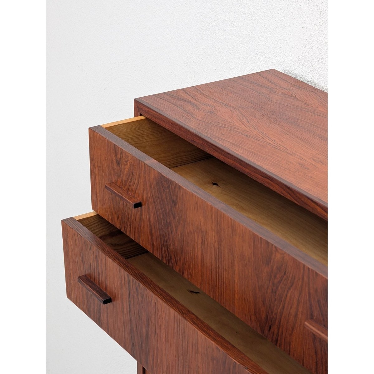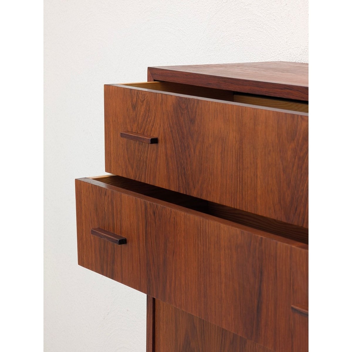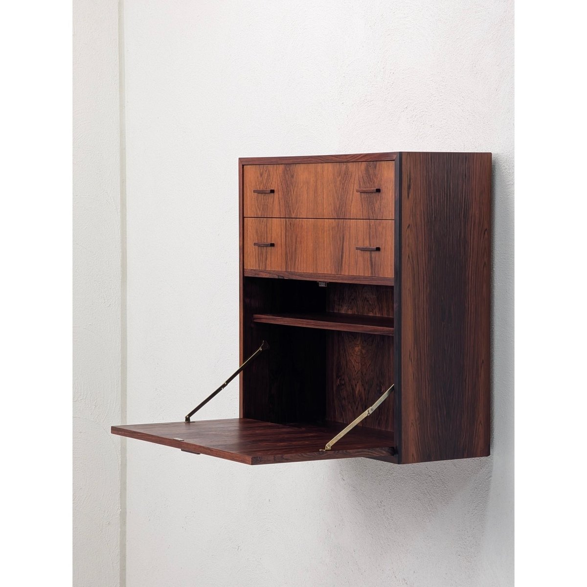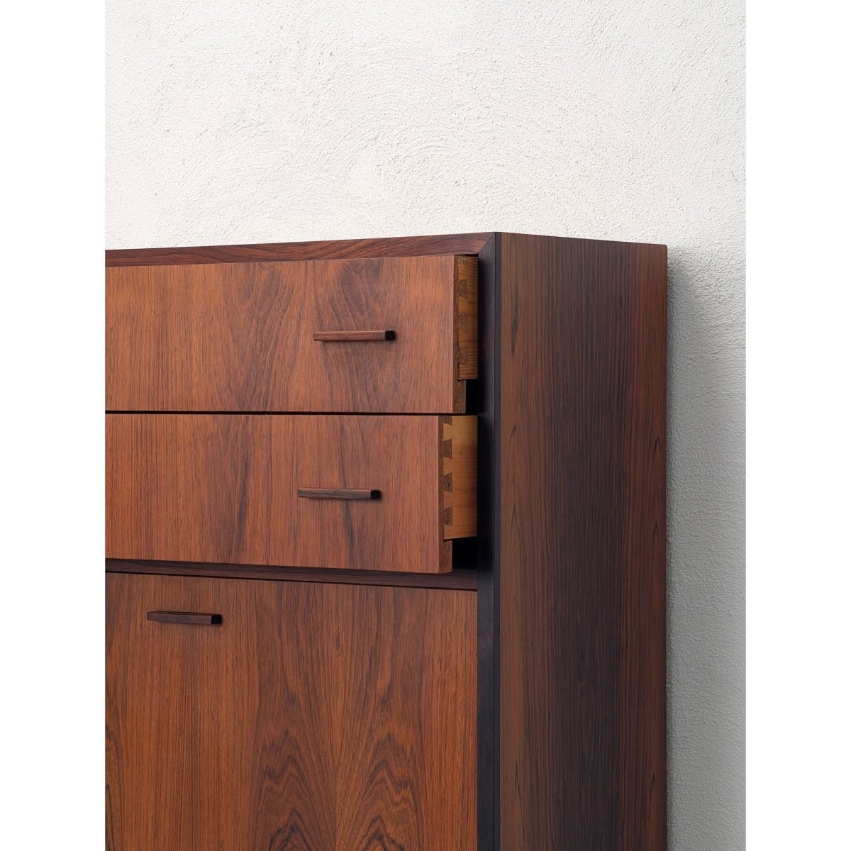Designed to float elegantly on the wall, the cabinet has a light, architectural presence. The form is pure and rectilinear, allowing the richness of the rosewood and the precision of the joinery to take center stage. What distinguishes this piece are its unique, hand-sculpted solid rosewood handles. Their elongated, organic form is a distinct design signature, setting it apart from the more common styles of the period. While the designer and manufacturer remain unidentified, the superlative quality is undeniable. This is not a mass-produced item, but rather the work of a master cabinetmaker from a high-quality furniture factory (Møbelfabrik).