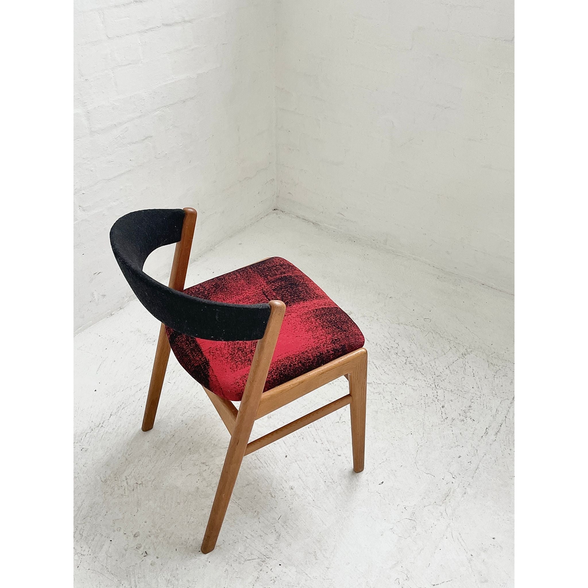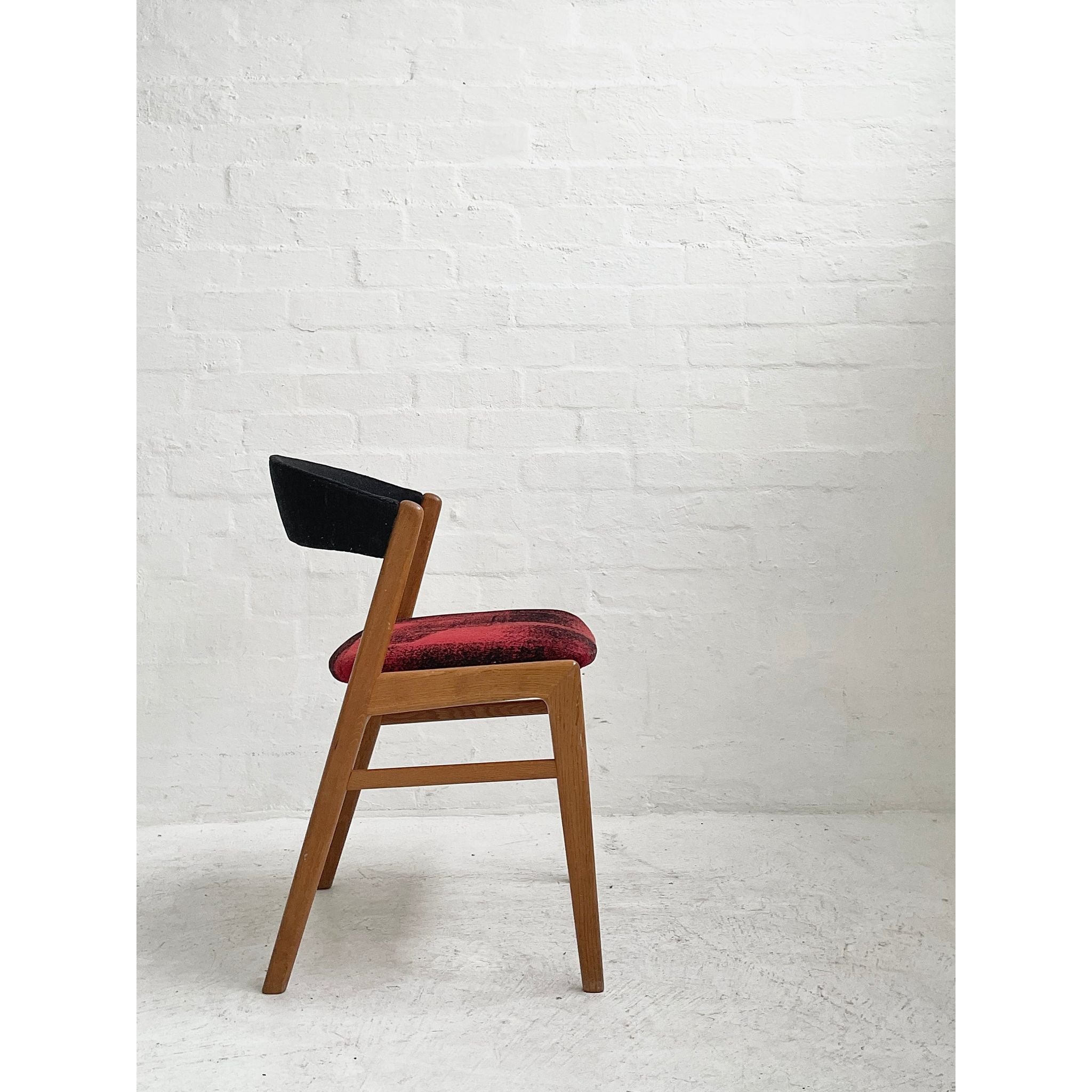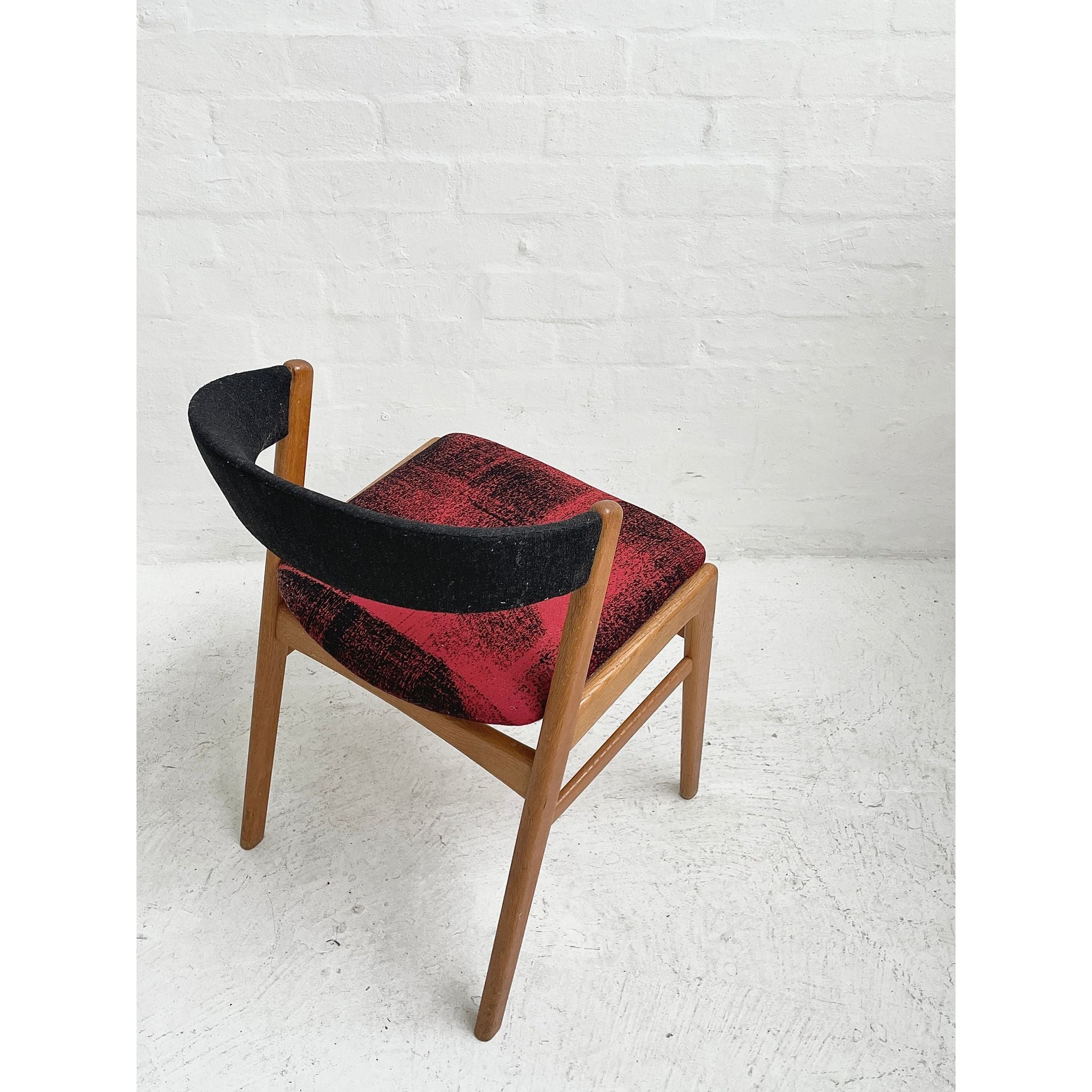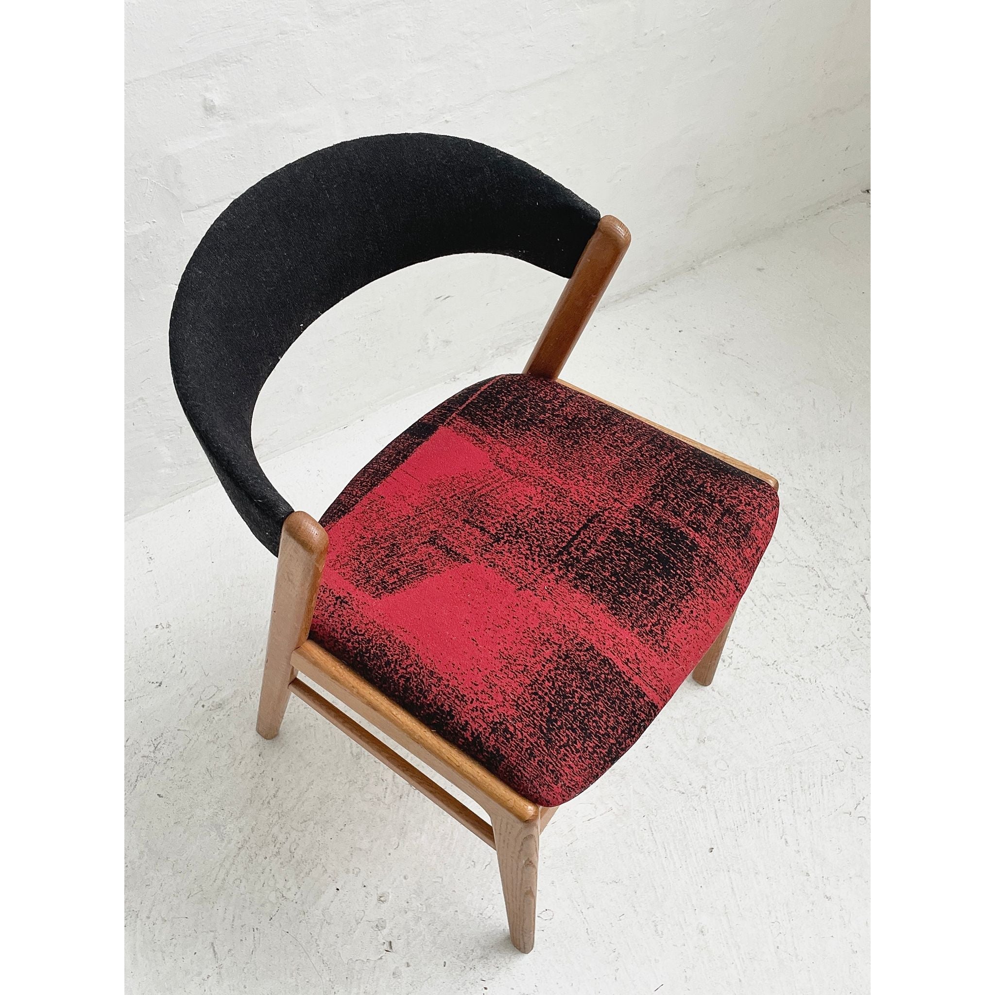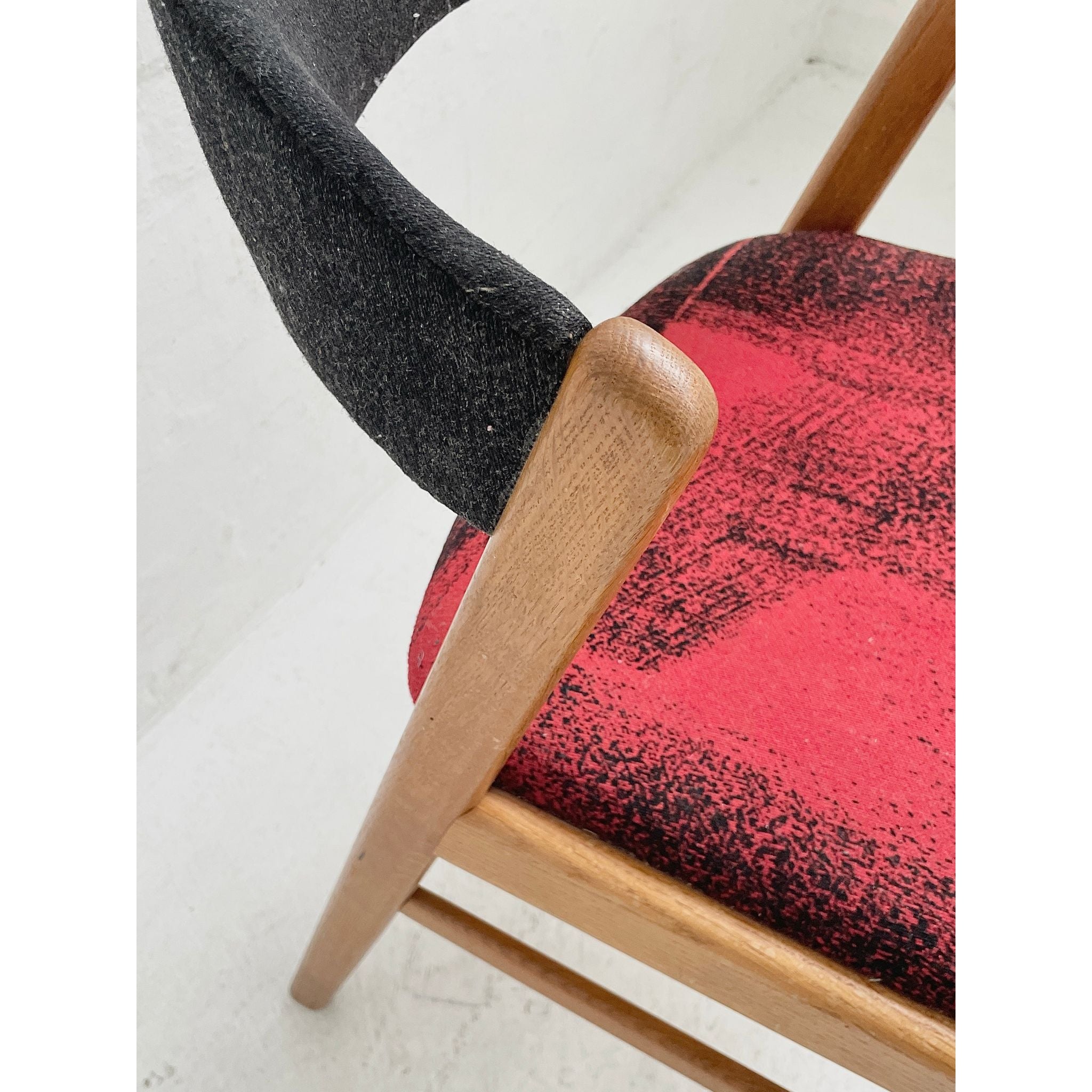 In oak with original wool upholstery. Good vintage condition.