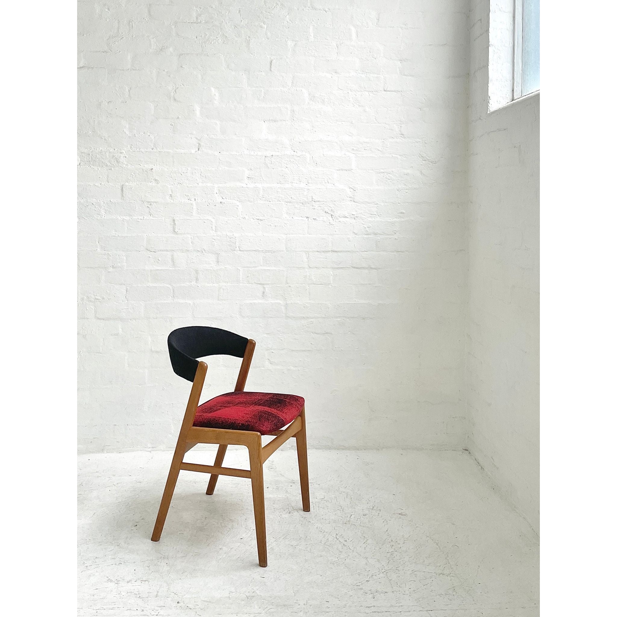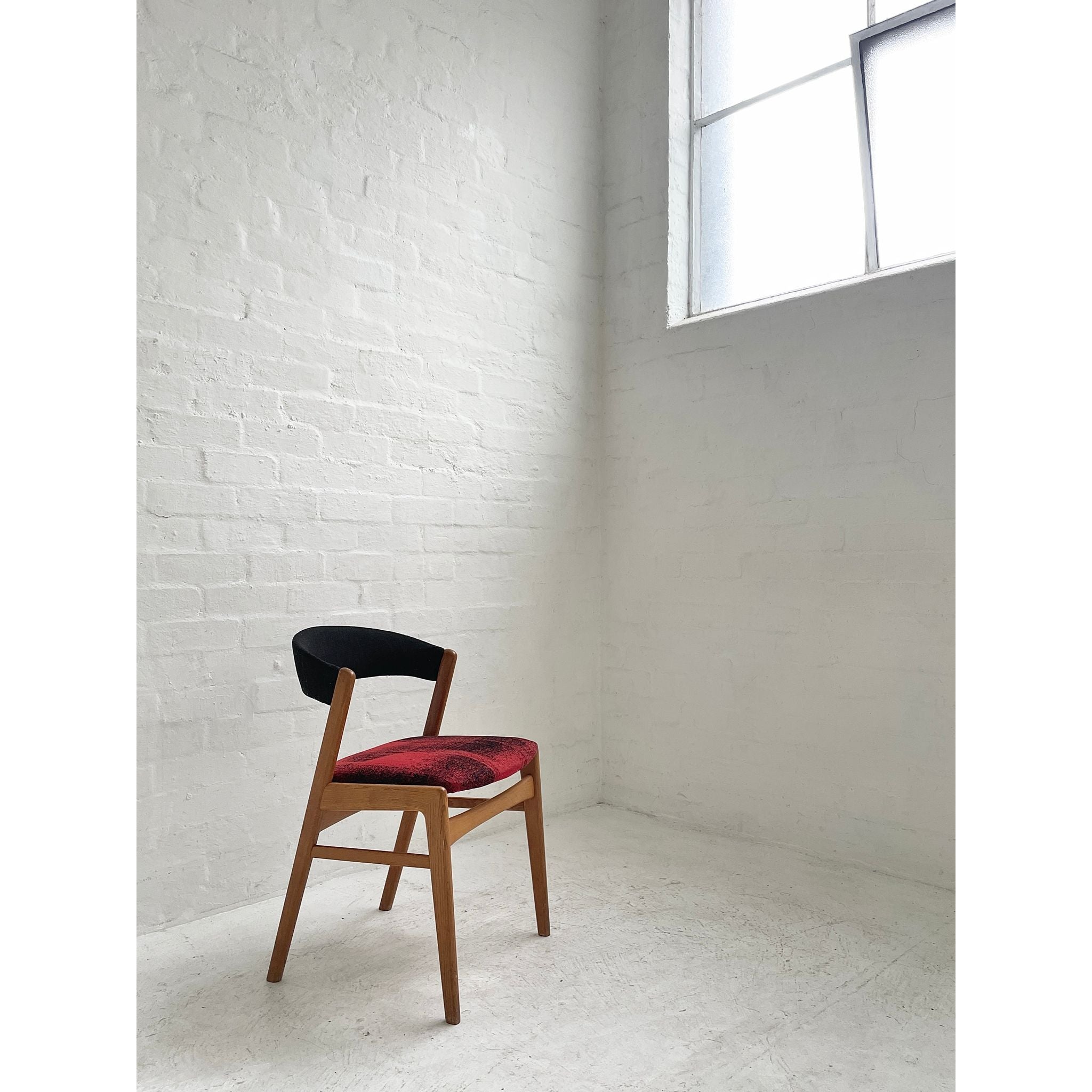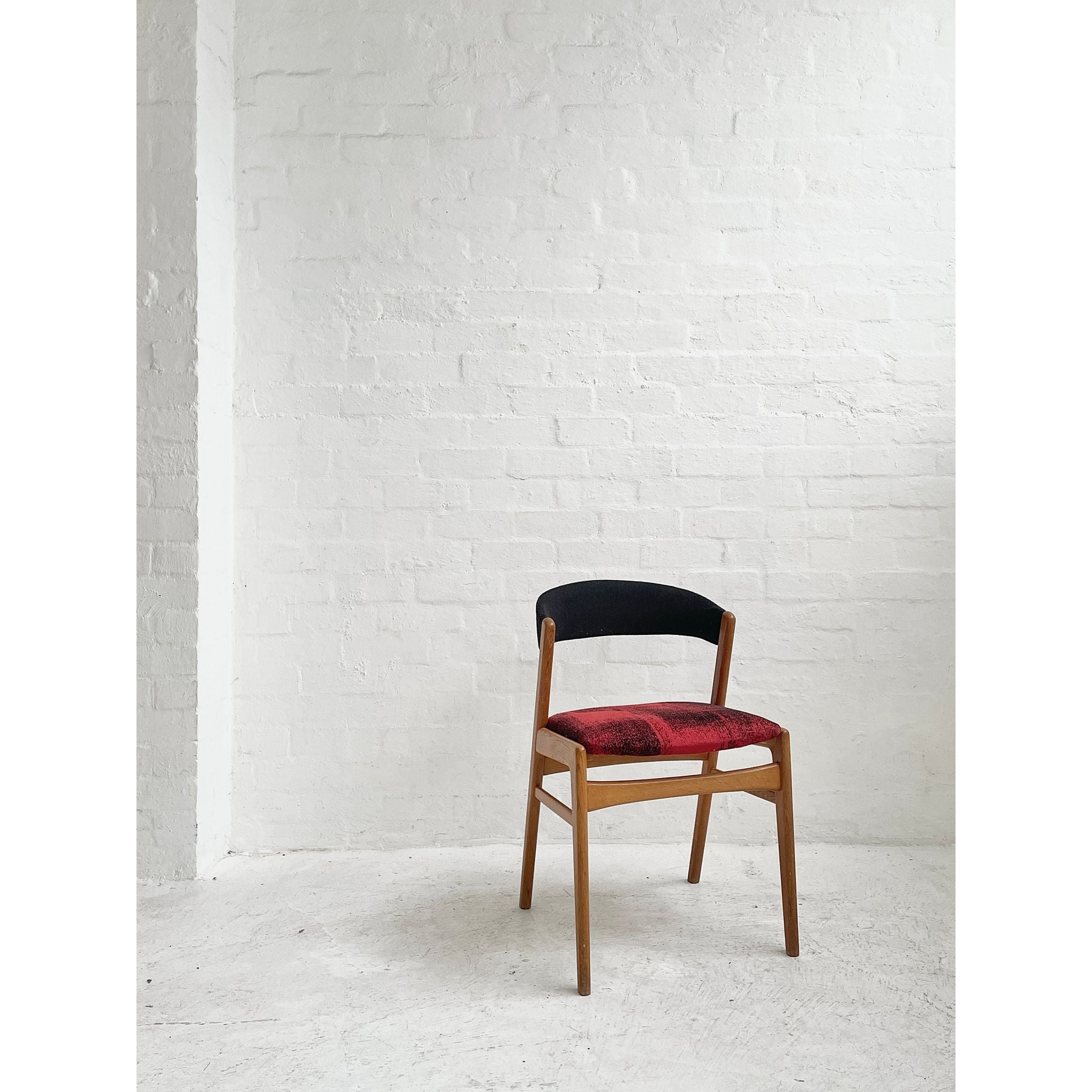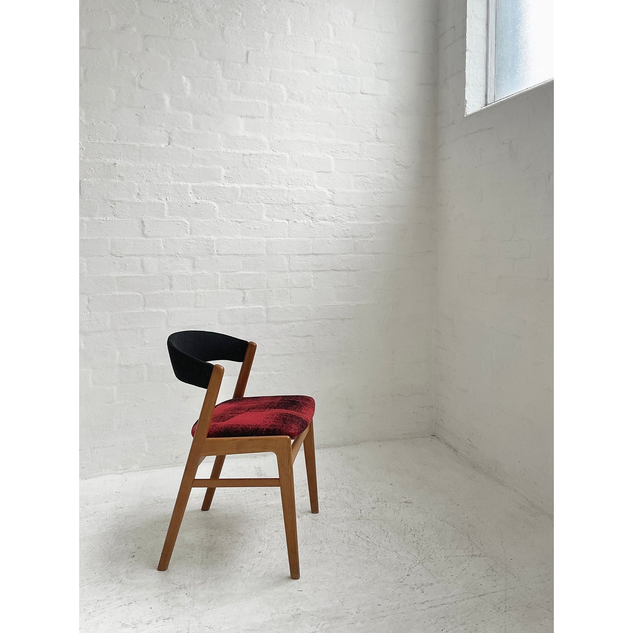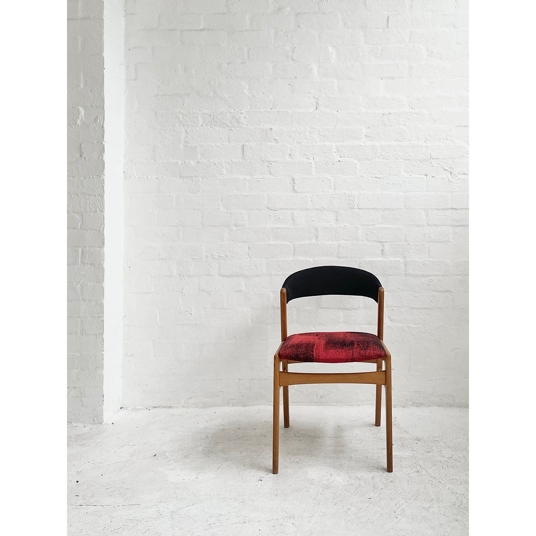 In oak with original wool upholstery. Good vintage condition.