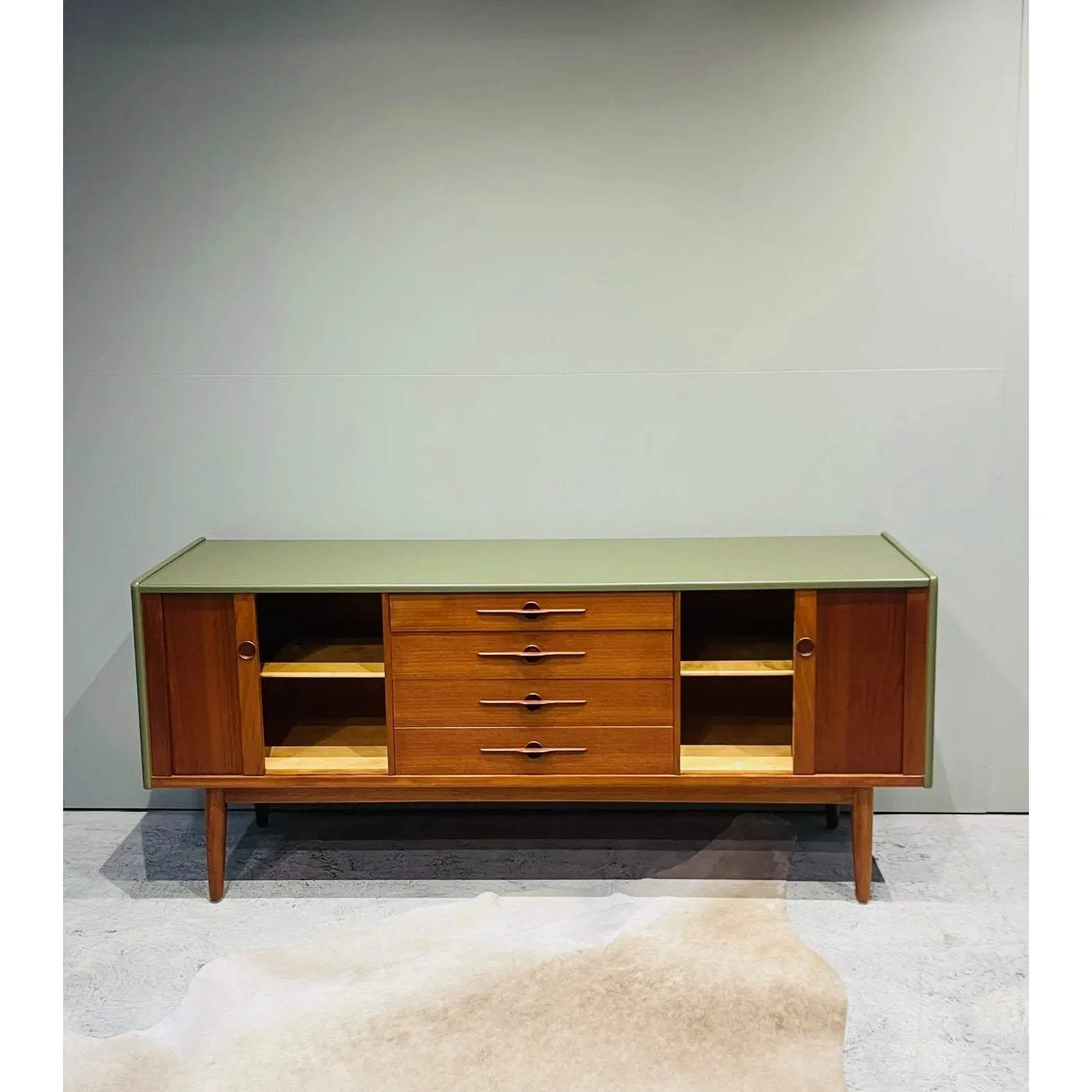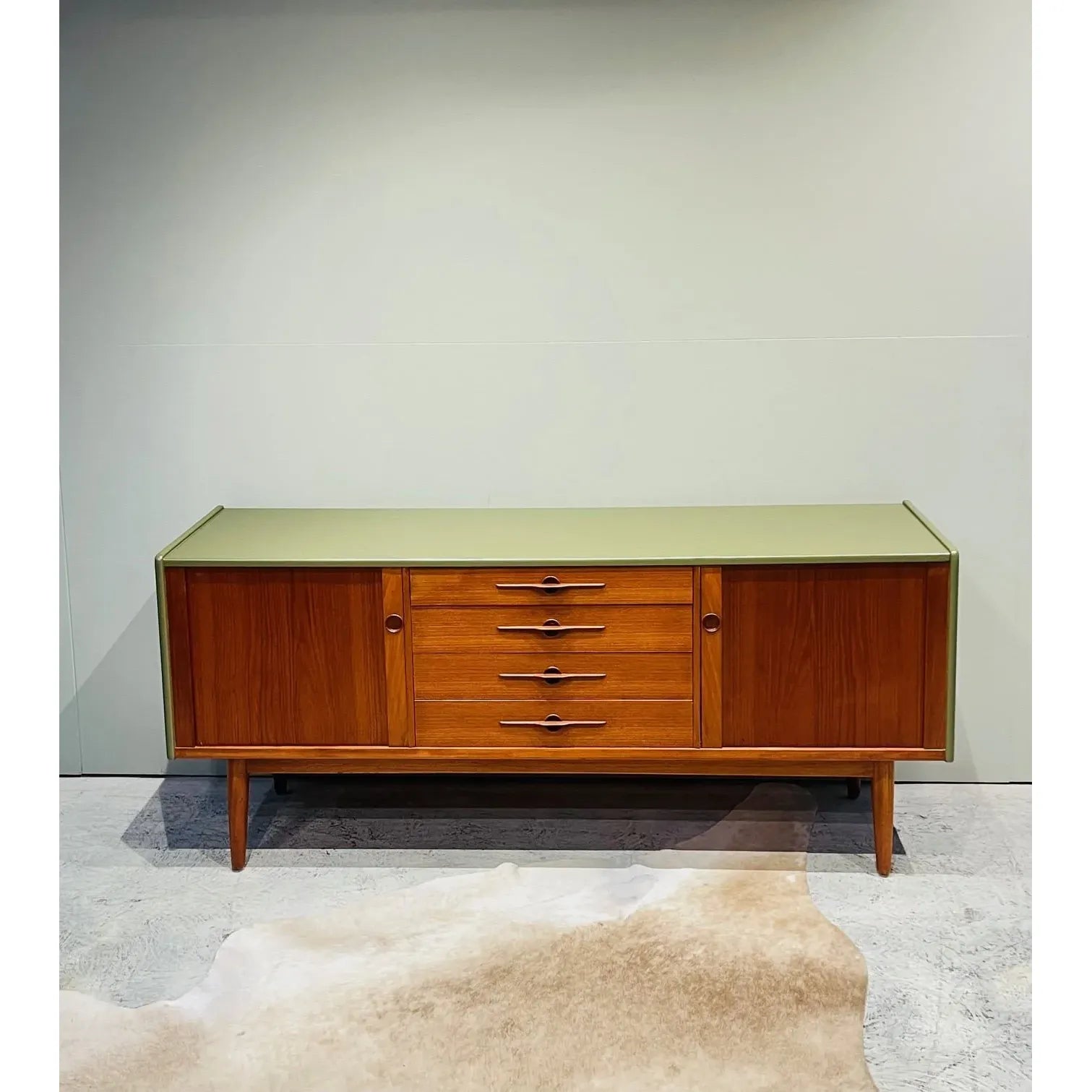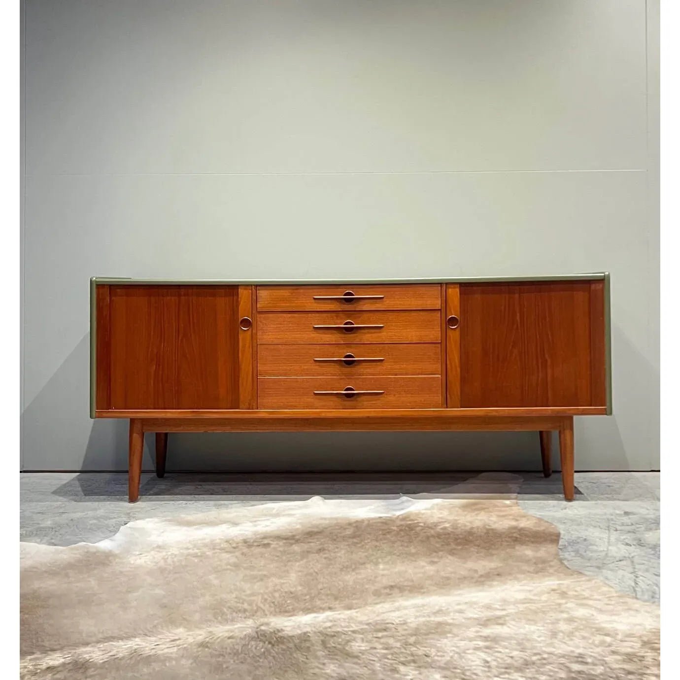 The vintage Danish teak sideboard exemplifies mid-century design. Crafted from quality teak with unusual painted surfaces, highlights the wood's natural beauty with warm colors and grain. Its rarity comes from simple design features; its sliding tambour doors and four draws add an architectural touch. This stylish yet practical piece offers ample storage and appeals to collectors and mid-century modern enthusiasts.