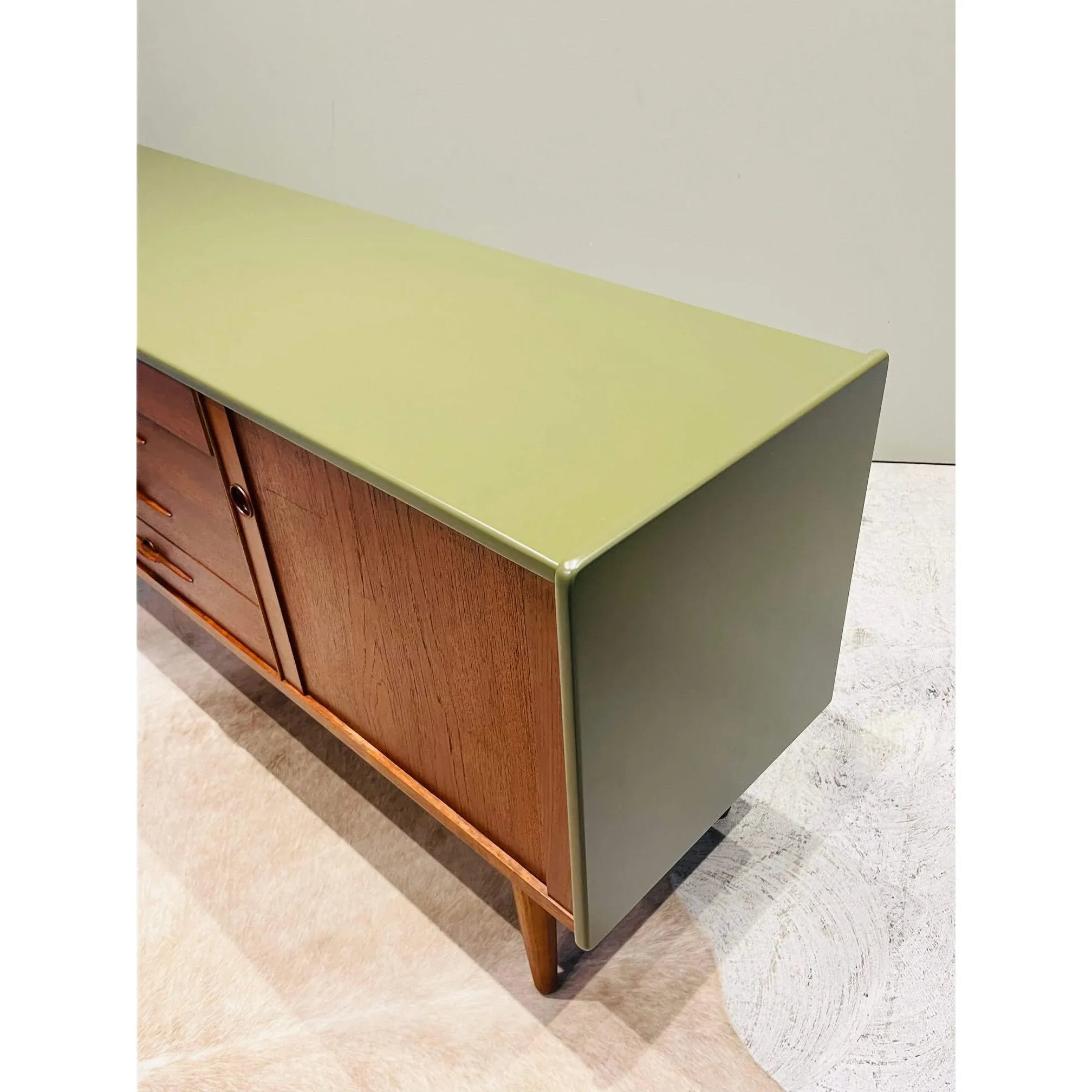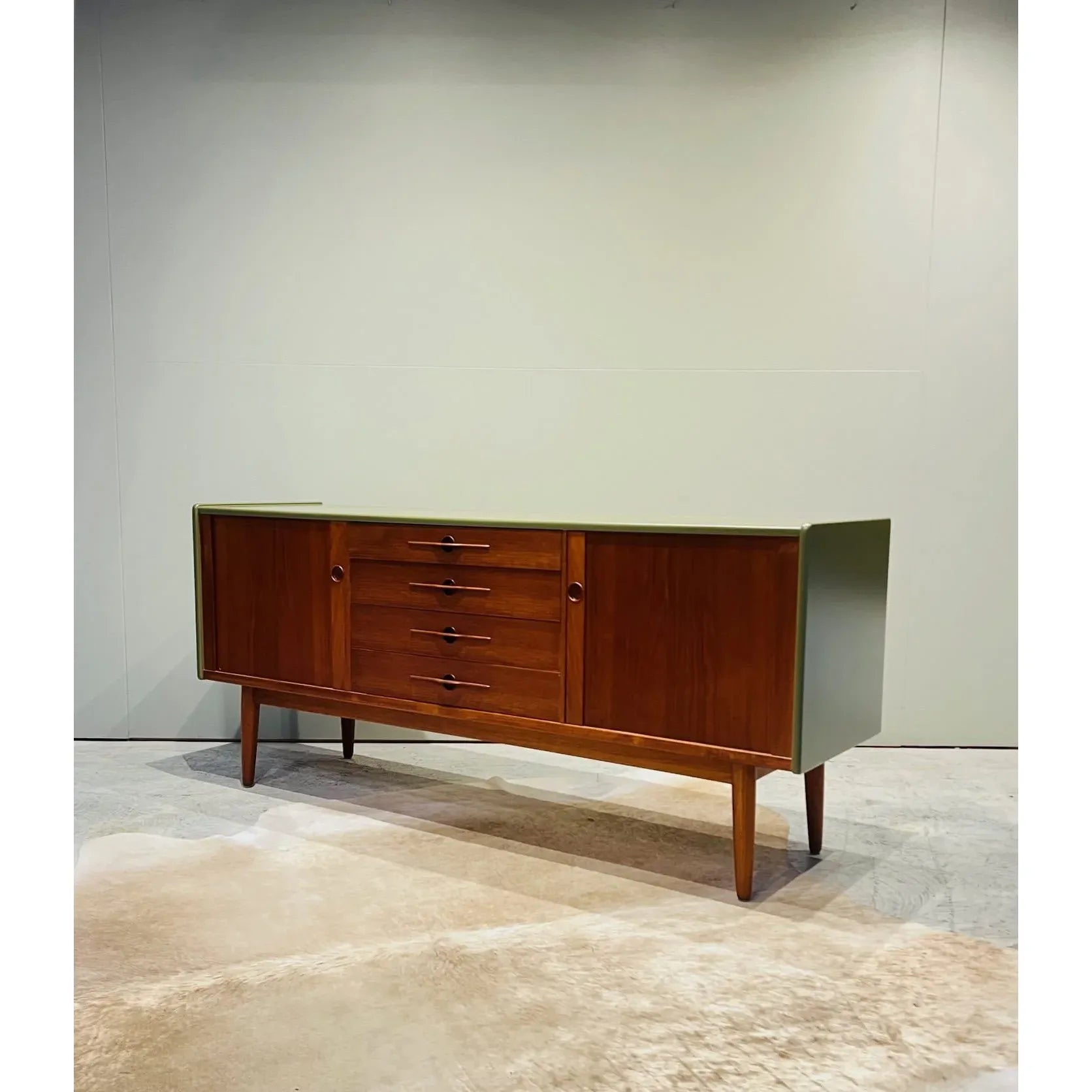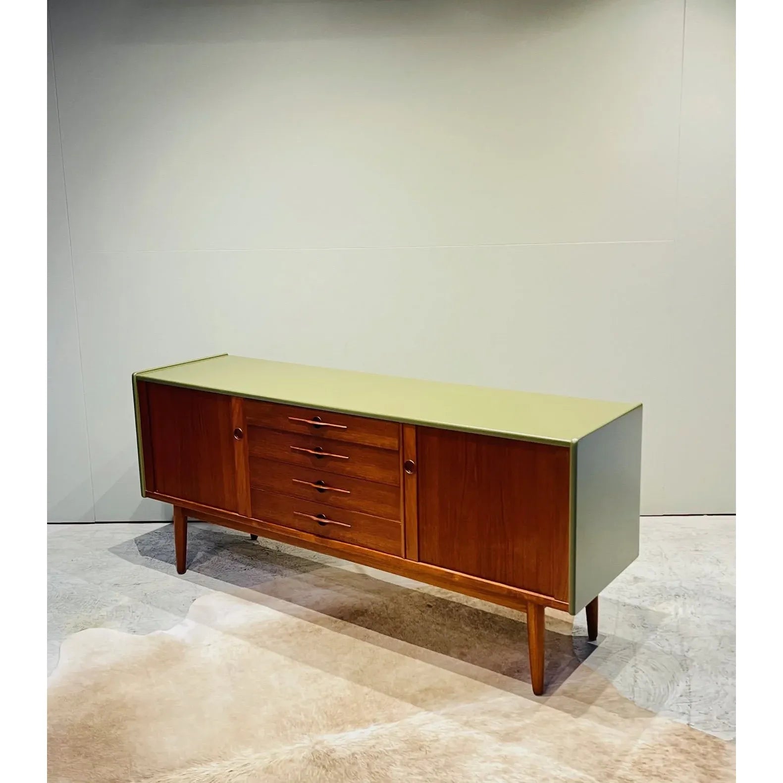 The vintage Danish teak sideboard exemplifies mid-century design. Crafted from quality teak with unusual painted surfaces, highlights the wood's natural beauty with warm colors and grain. Its rarity comes from simple design features; its sliding tambour doors and four draws add an architectural touch. This stylish yet practical piece offers ample storage and appeals to collectors and mid-century modern enthusiasts.