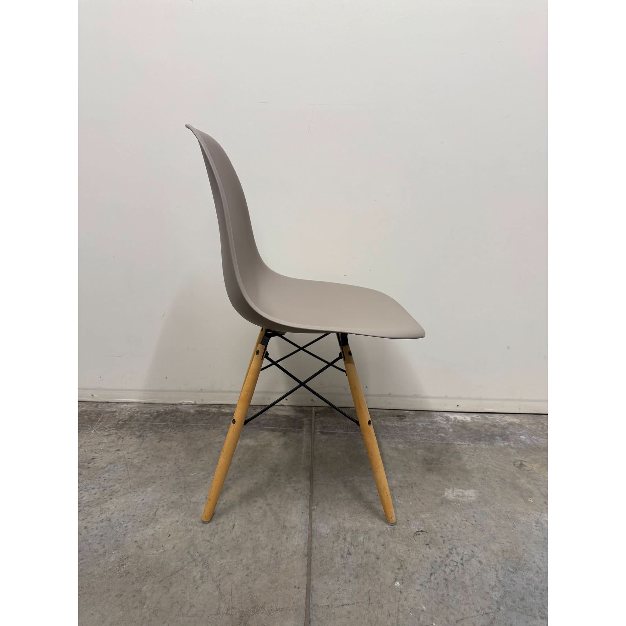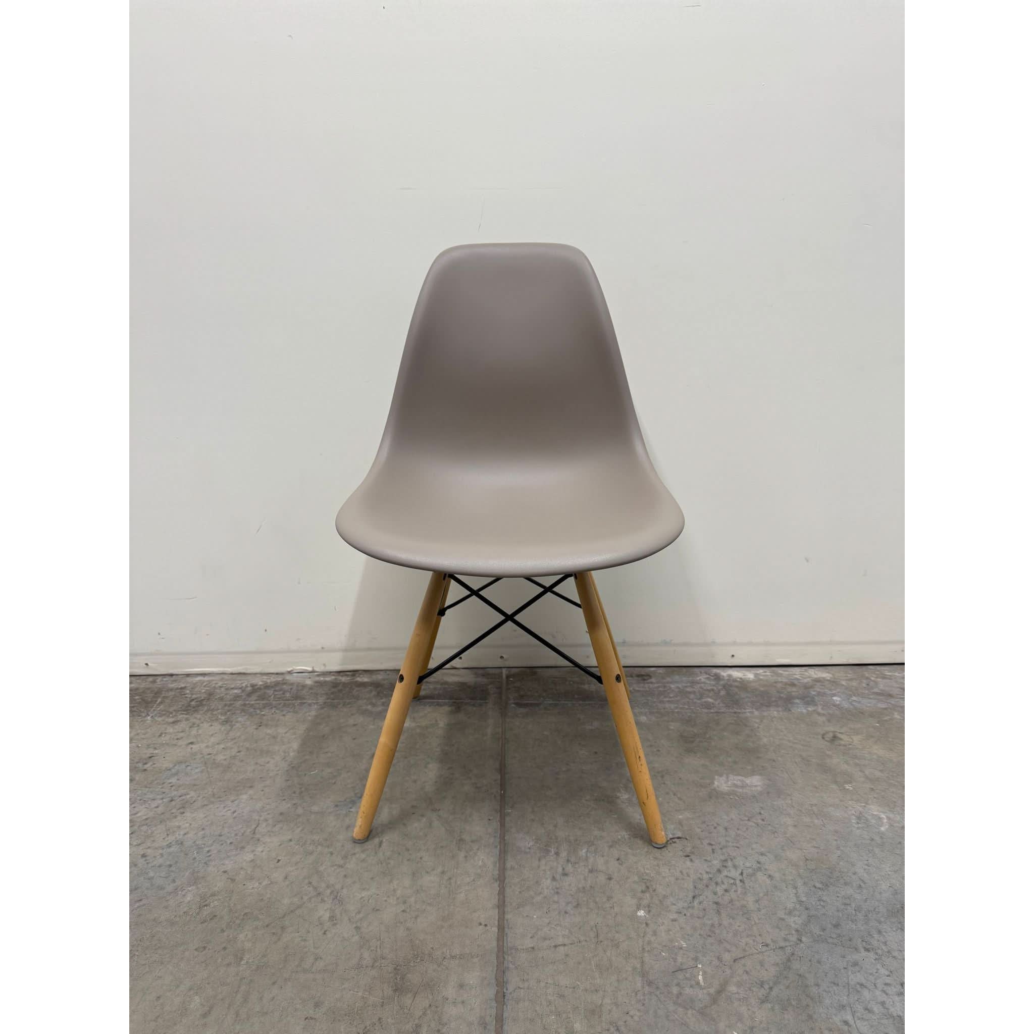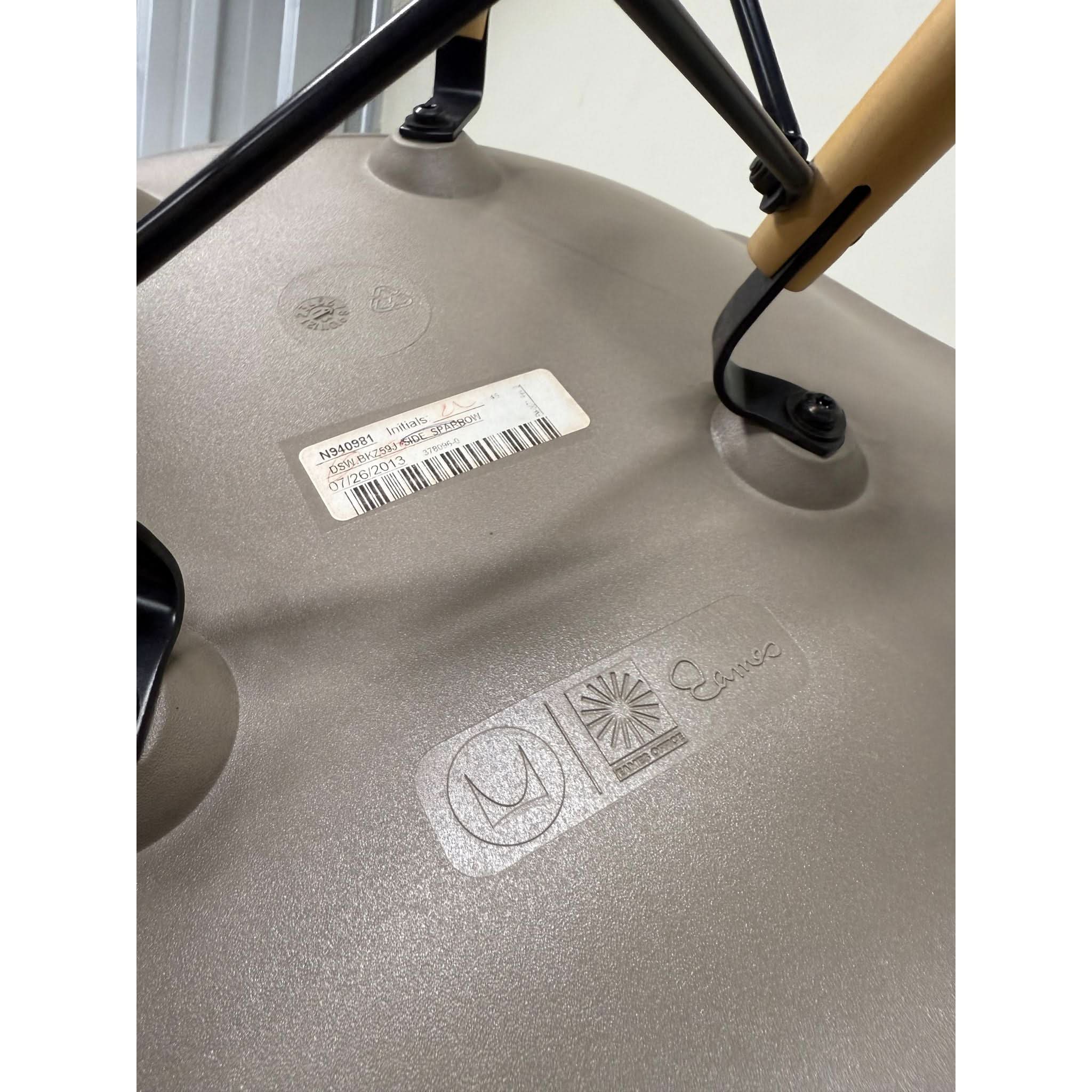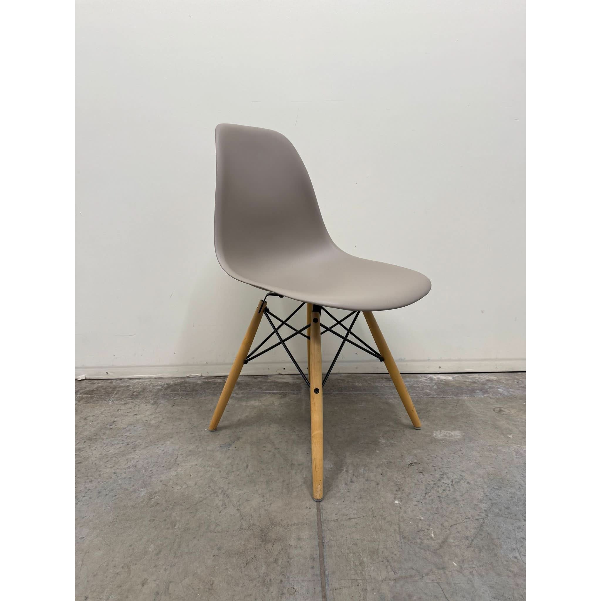 A modern design icon from Herman Miller, the Eames Molded Plastic Side Chair in Sparrow grey embodies the timeless form created by Charles and Ray Eames. Featuring a gently curved polypropylene seat and signature wooden dowel base with black metal cross struts, this chair offers a stylish blend of comfort and mid-century elegance.