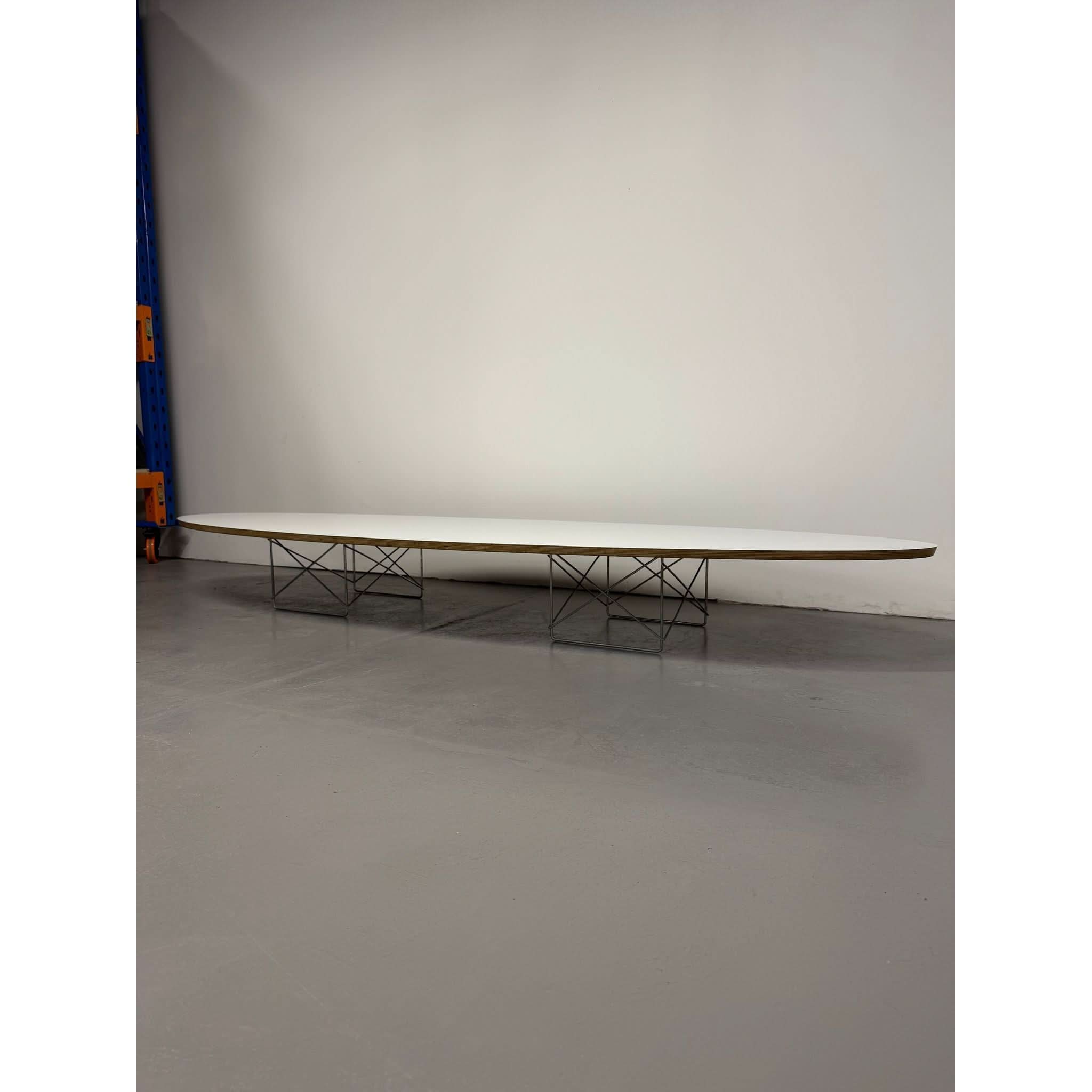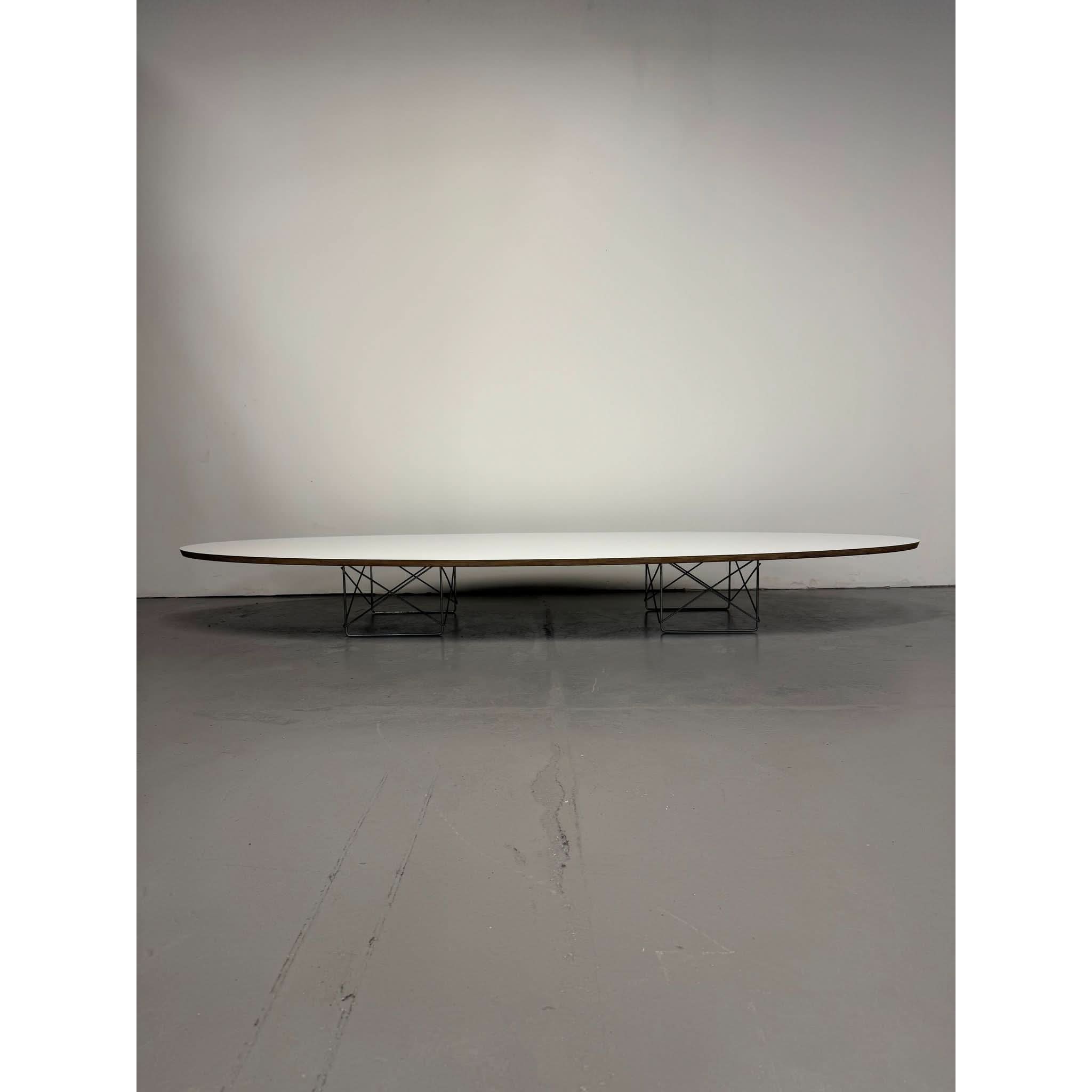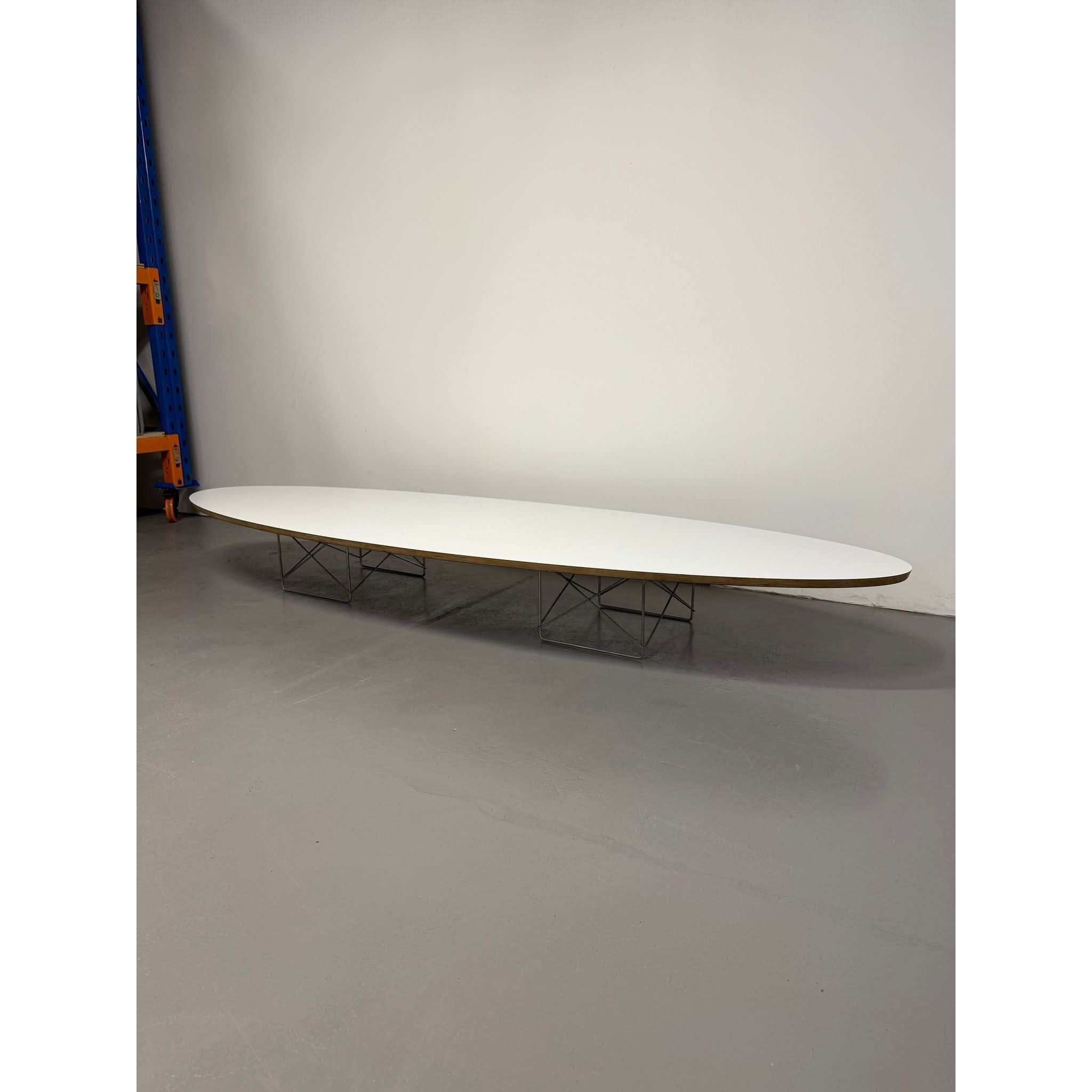 The Eames Wire Base Elliptical Table, often referred to as the “Surfboard Table,” is a rare and well-known mid-century piece designed by Charles and Ray Eames for Herman Miller. With its long, low profile and clean white laminate top, the elliptical shape takes direct inspiration from surfboard design, making it one of the most recognisable coffee tables of its era.