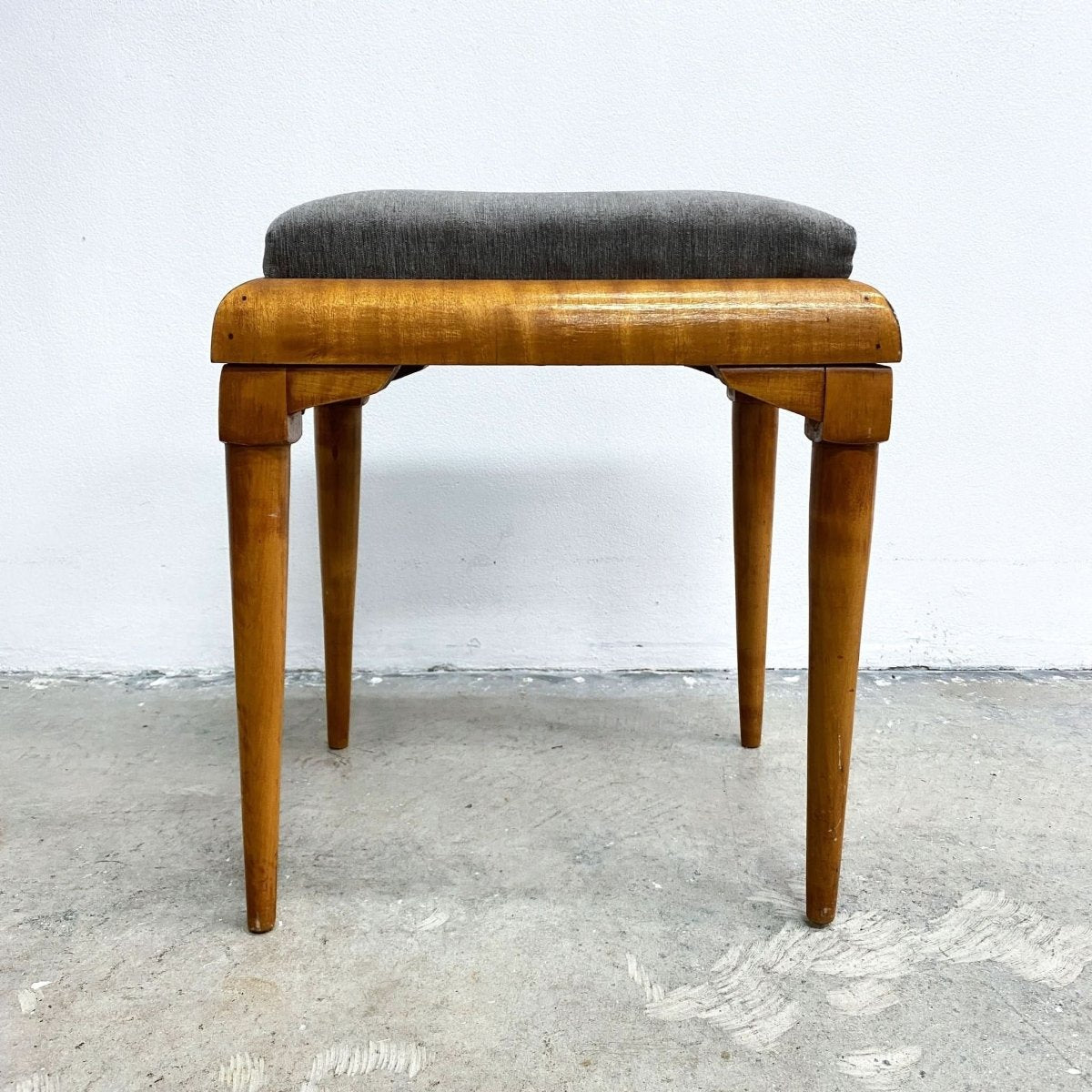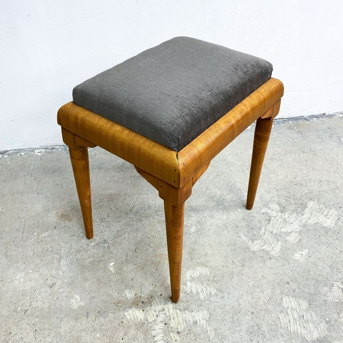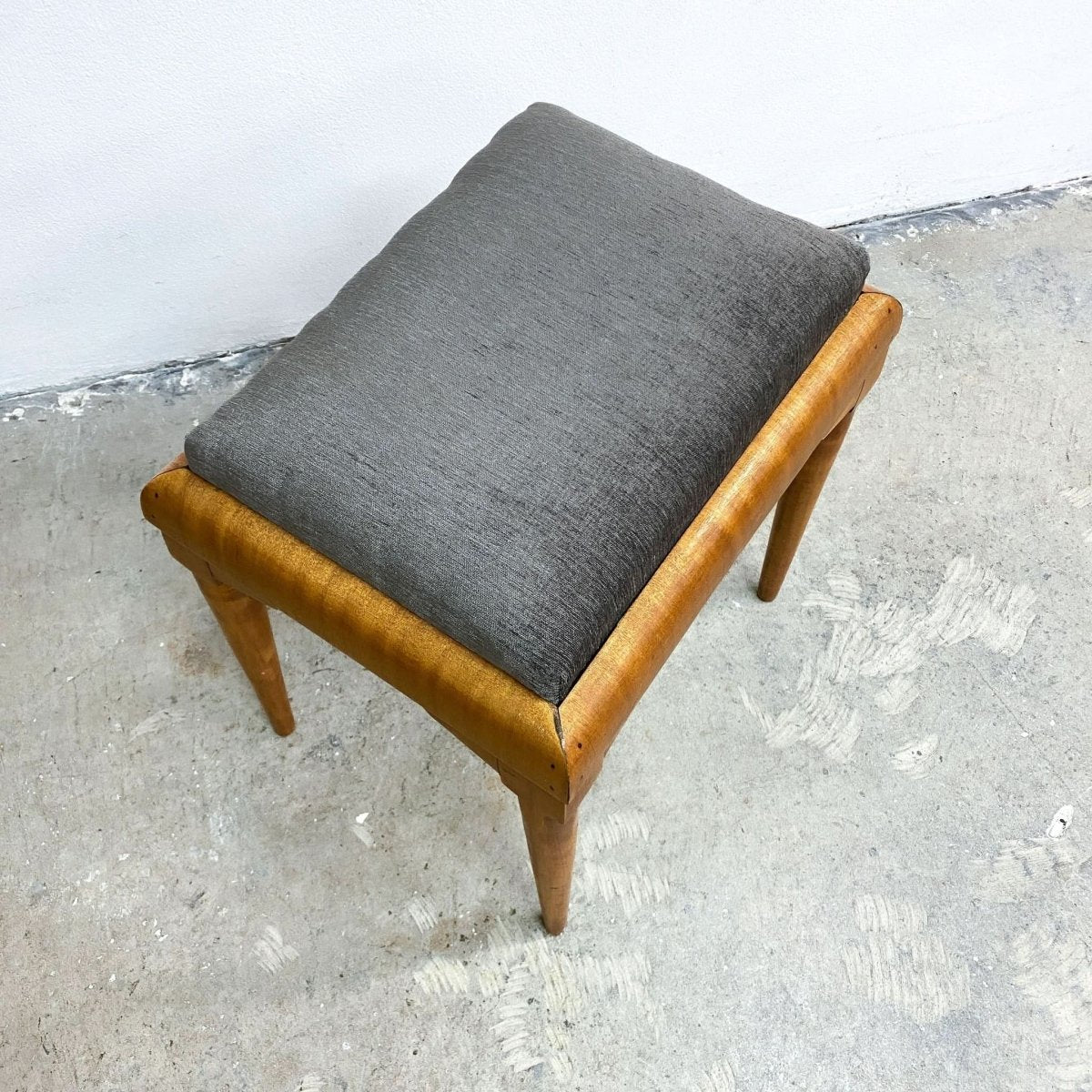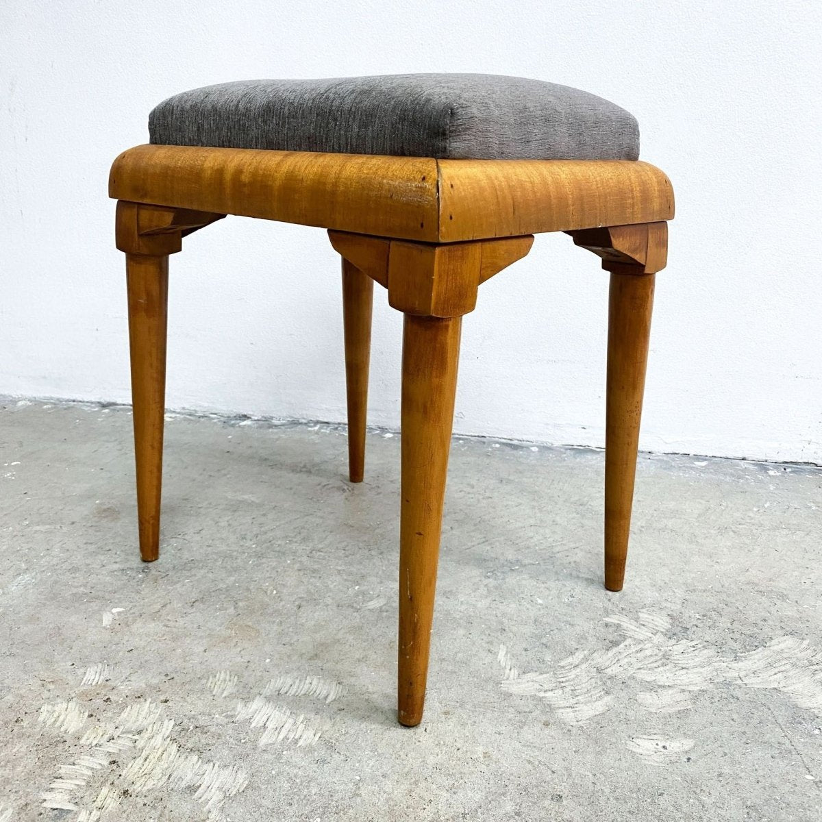 Charming early mid century maple piano or dresser stool with more recent grey upholstery. Perfect as a interesting accent piece. In excellent condition with minor signs of previous use.