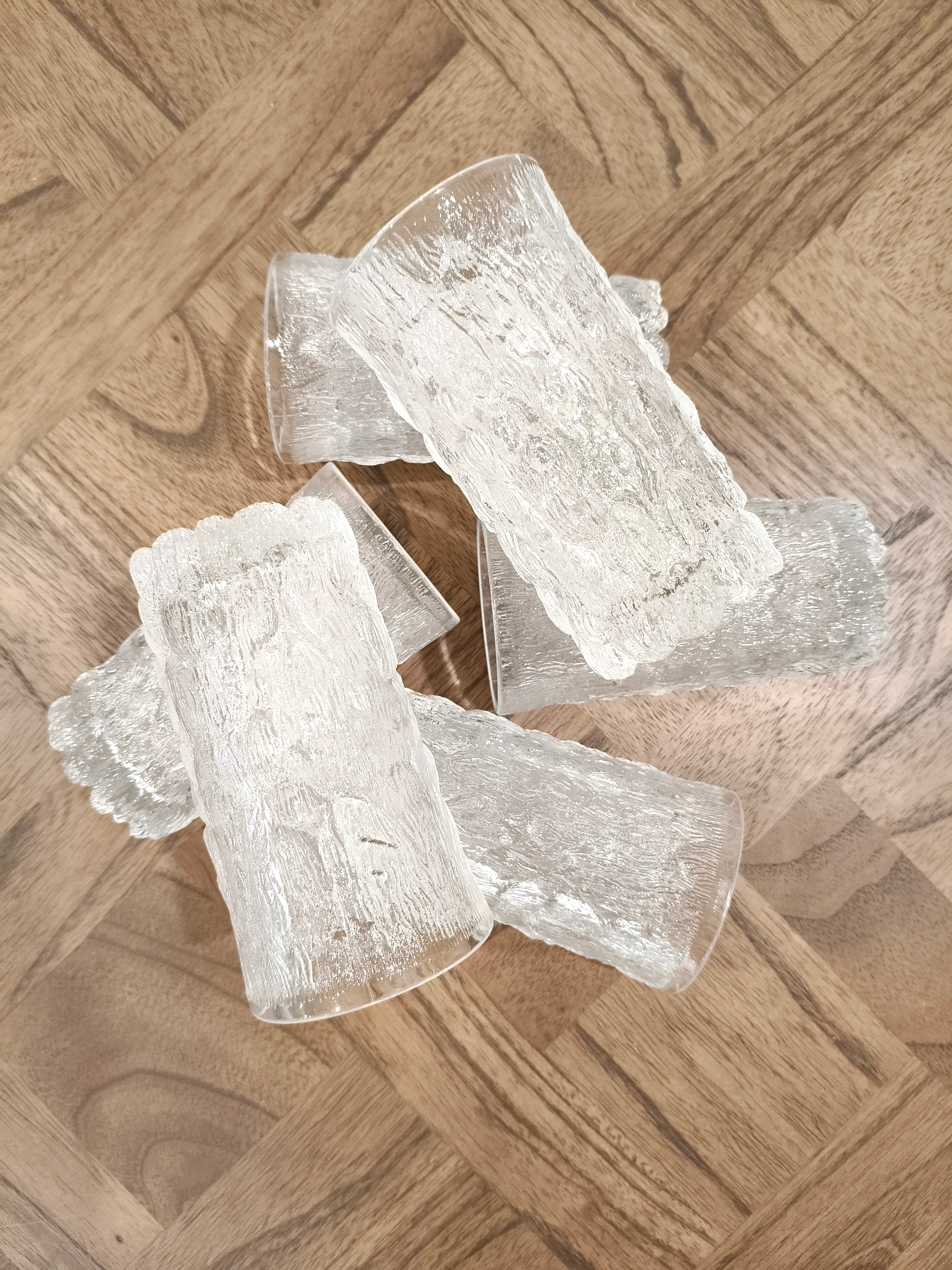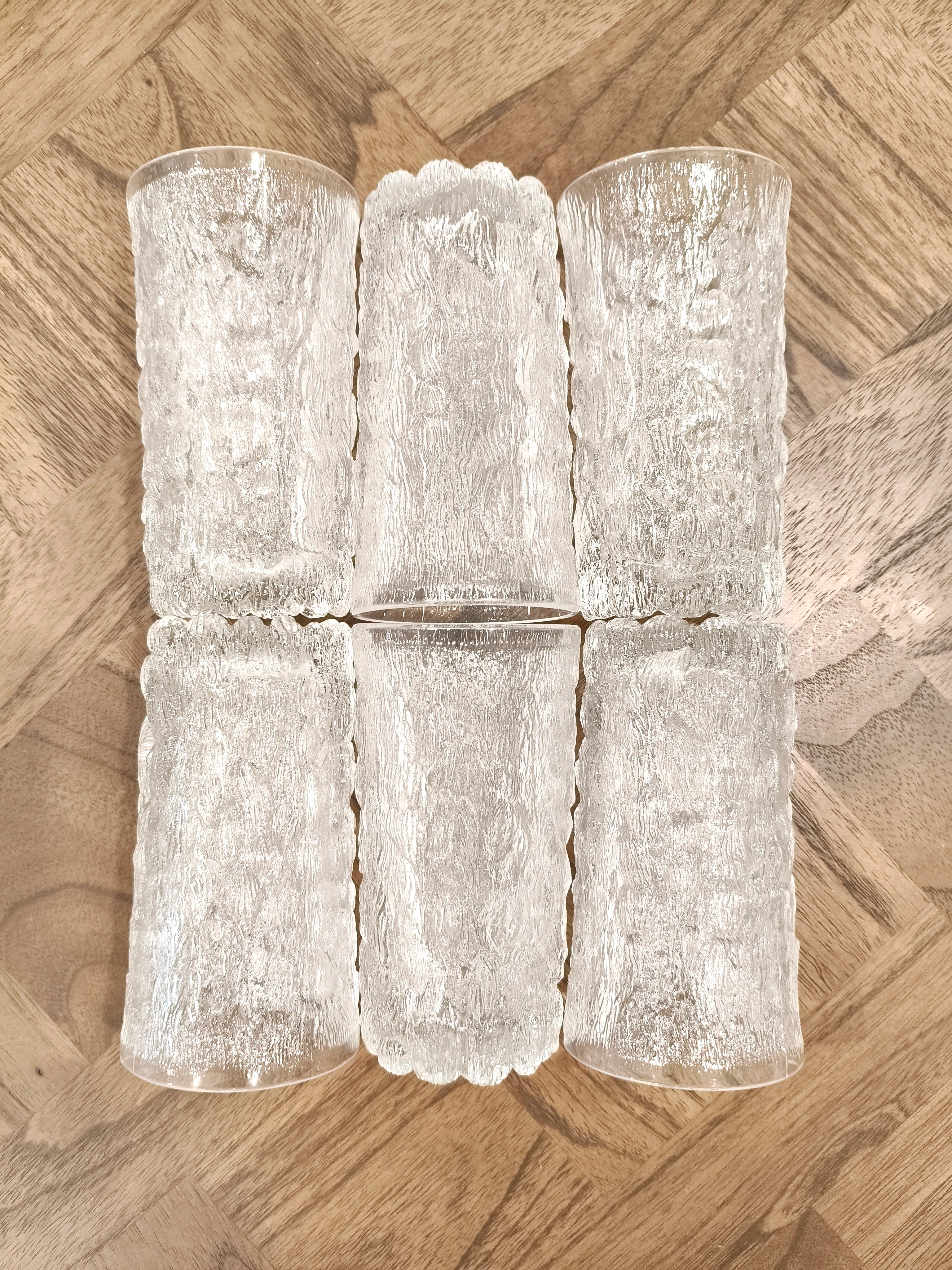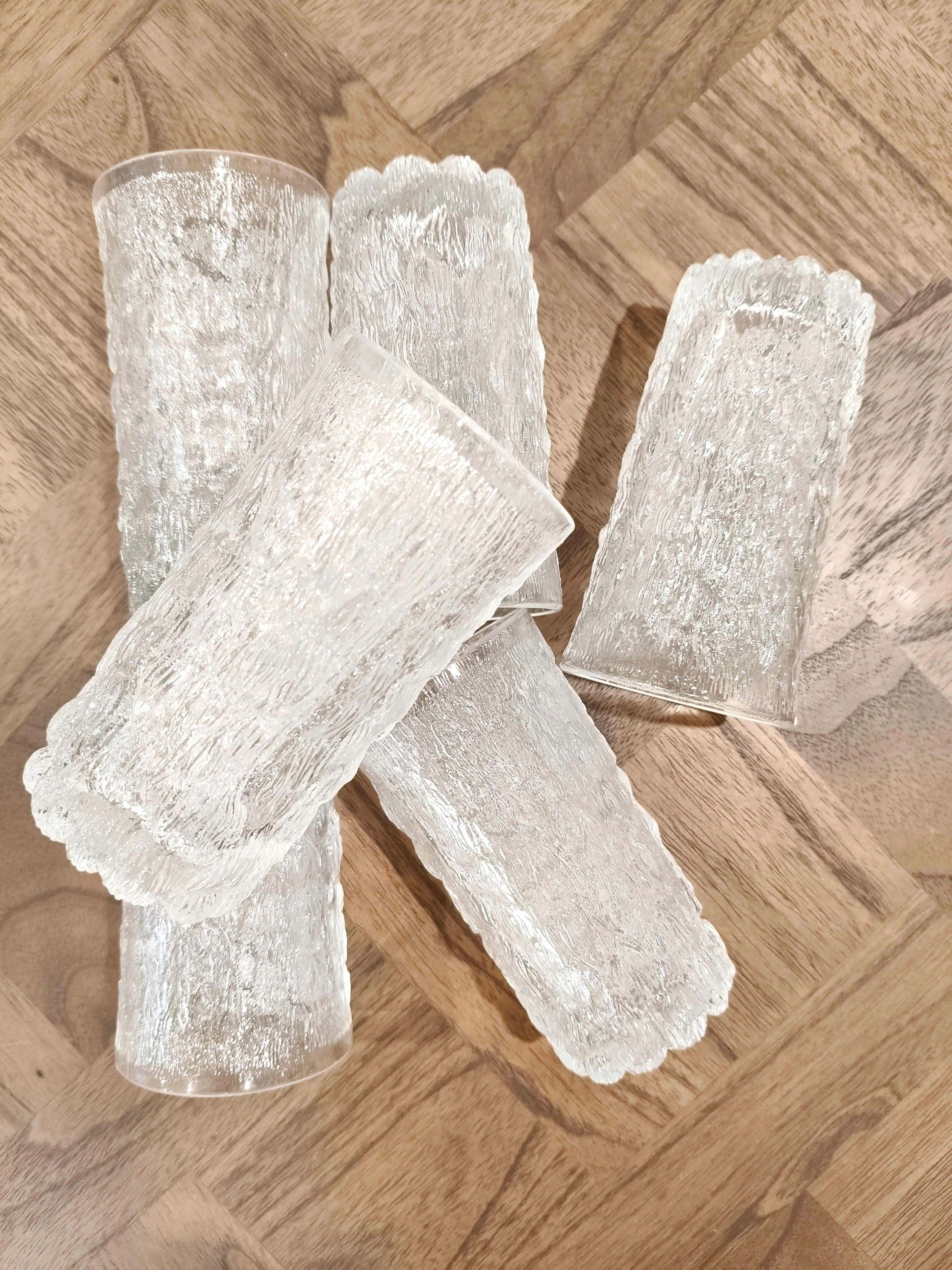 Set of 6 tumblers in a bark glass textured style, an ice pattern similar to the Scandinavian designs at the time.