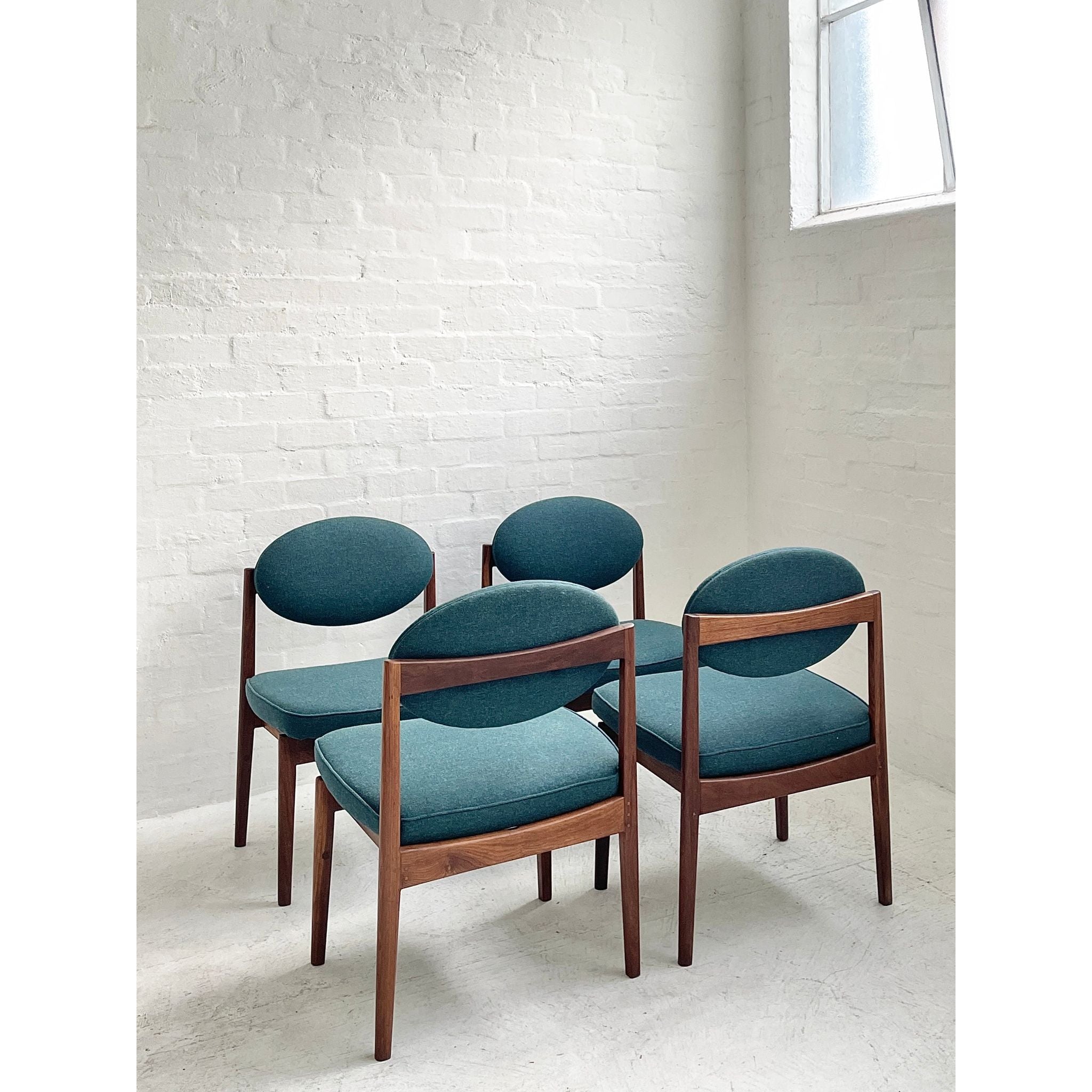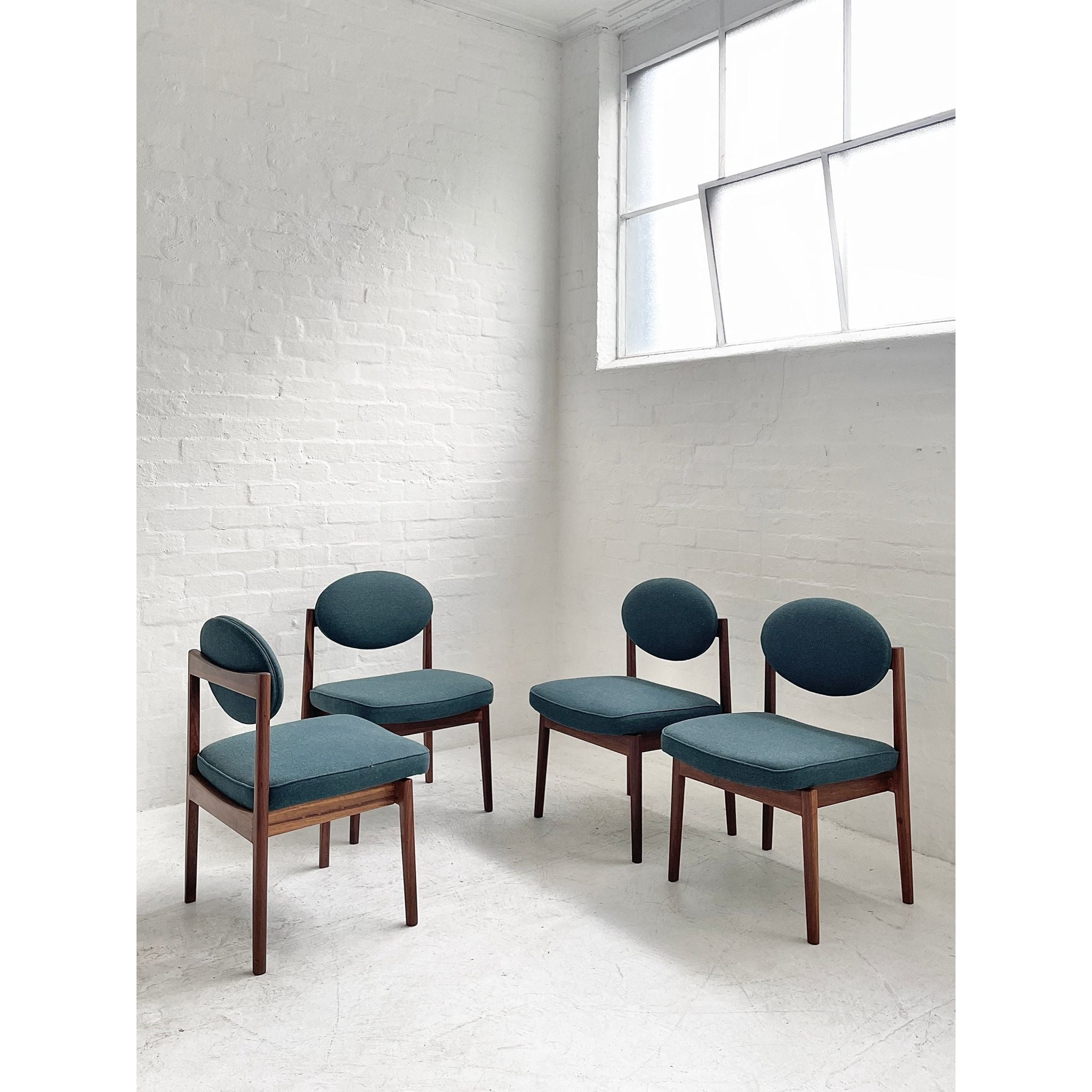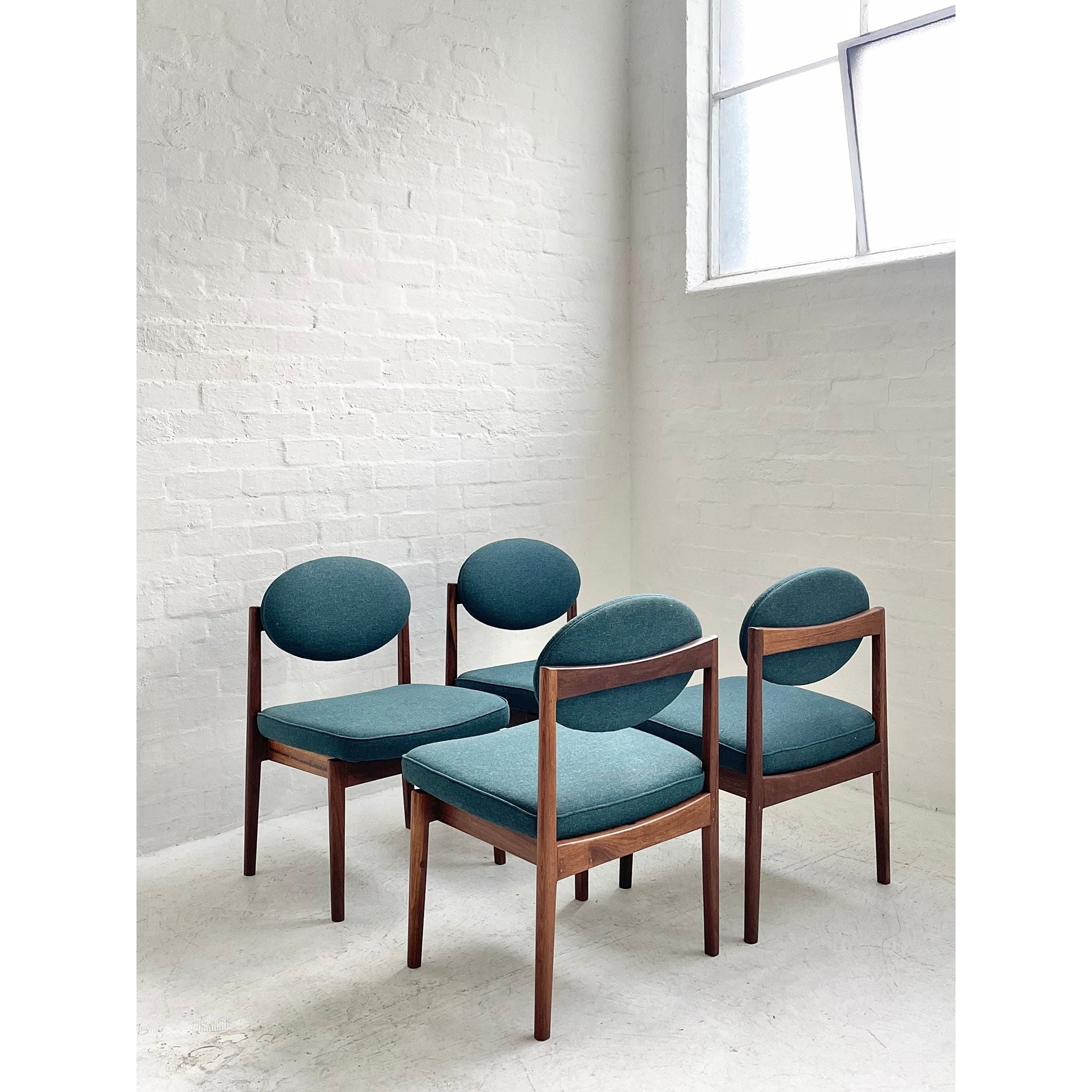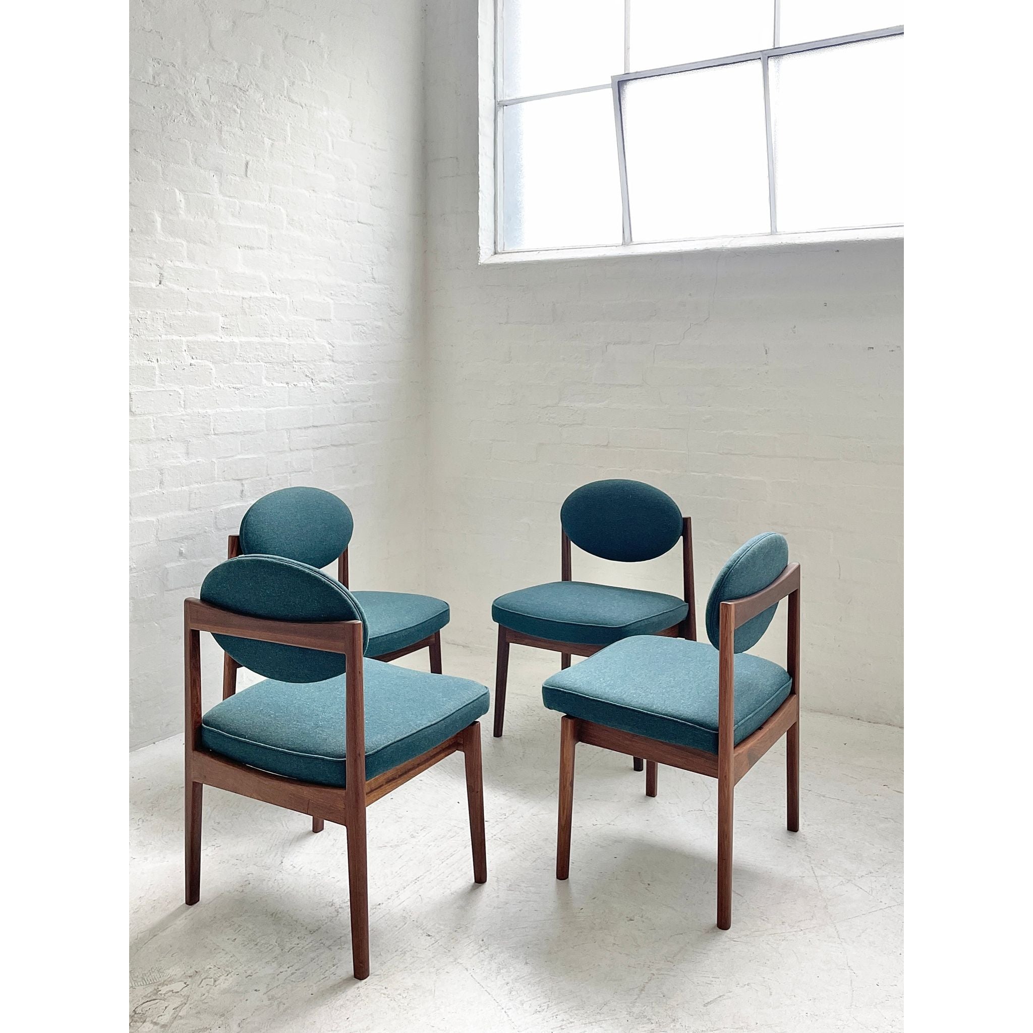 Set of four chairs designed by Jens Risom, produced by William Latchford. In blackbean timber and Instyle wool upholstery.
