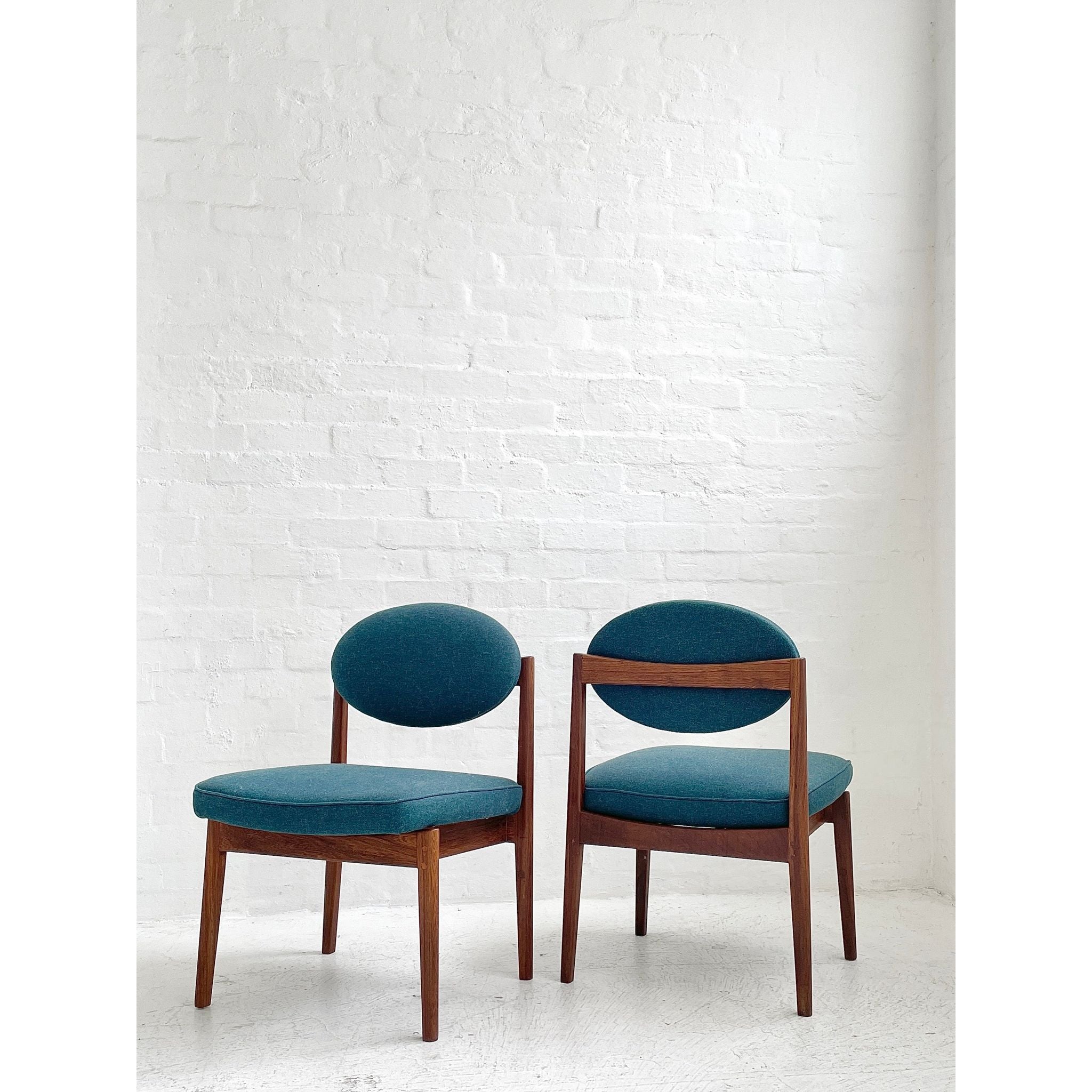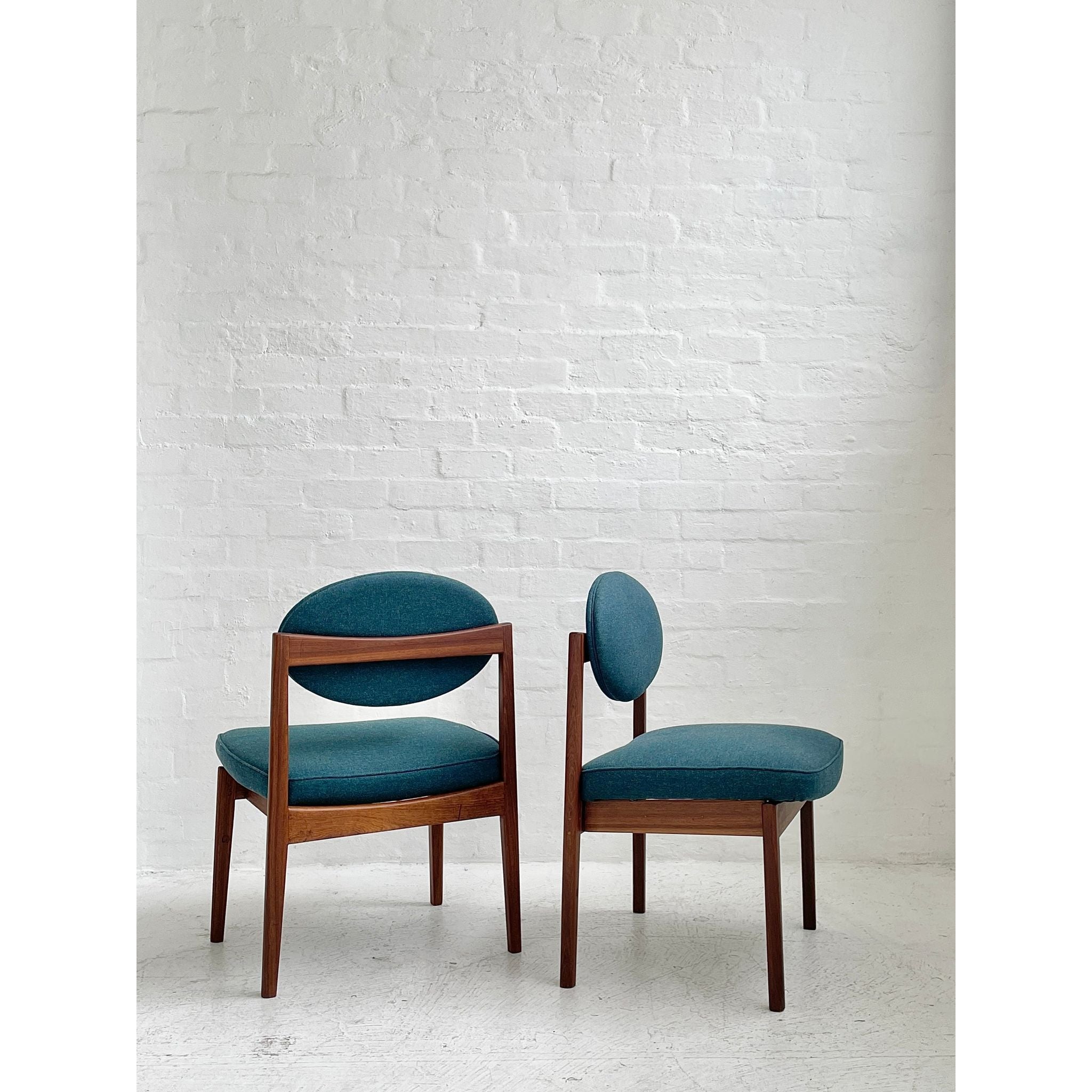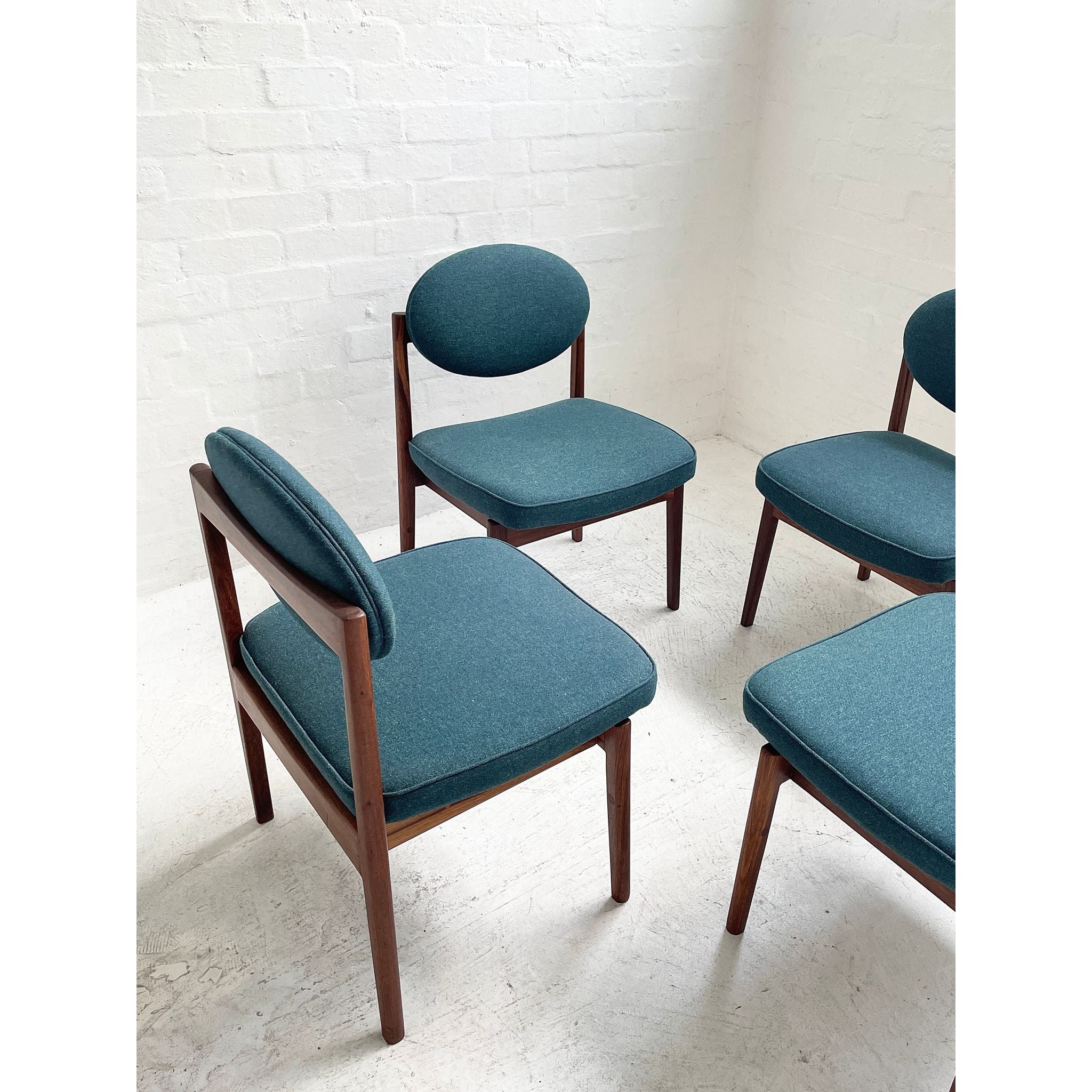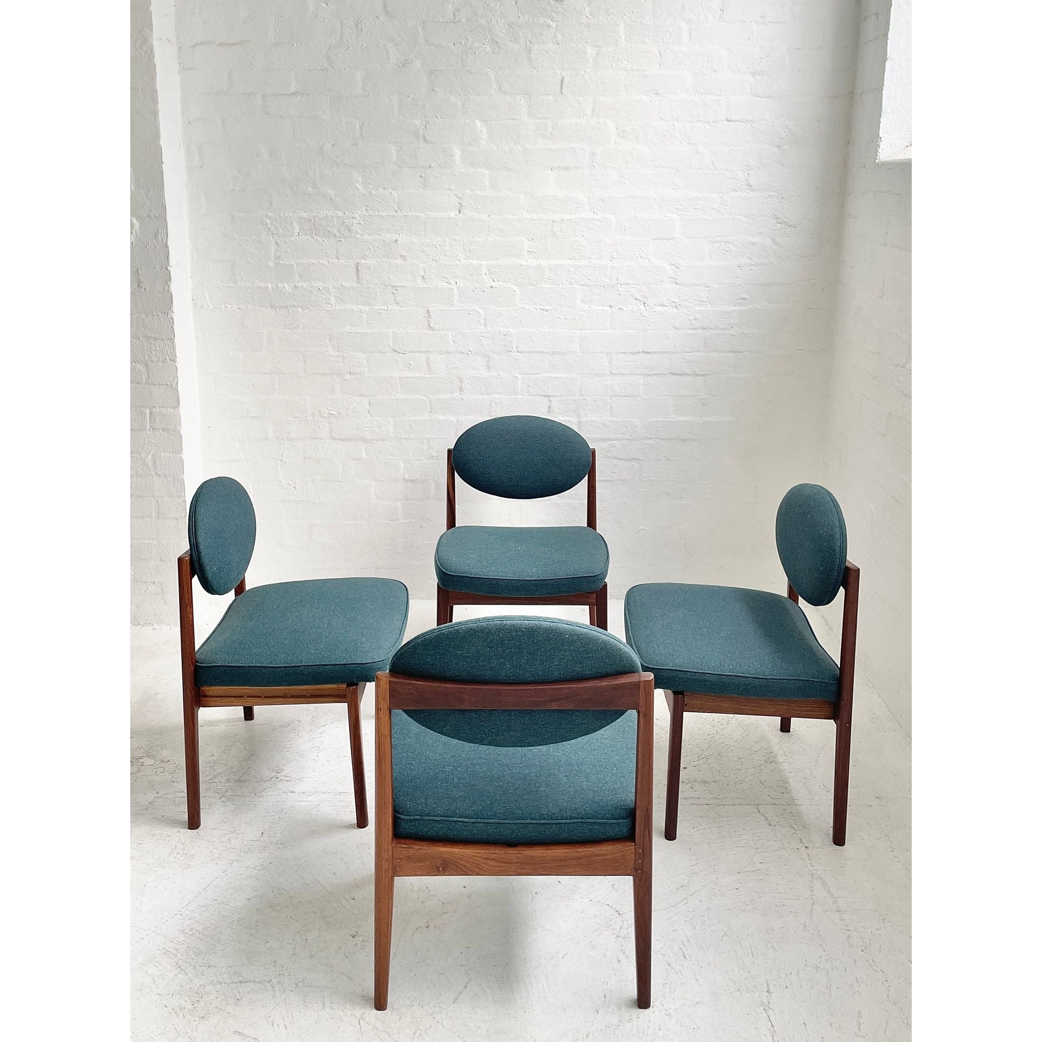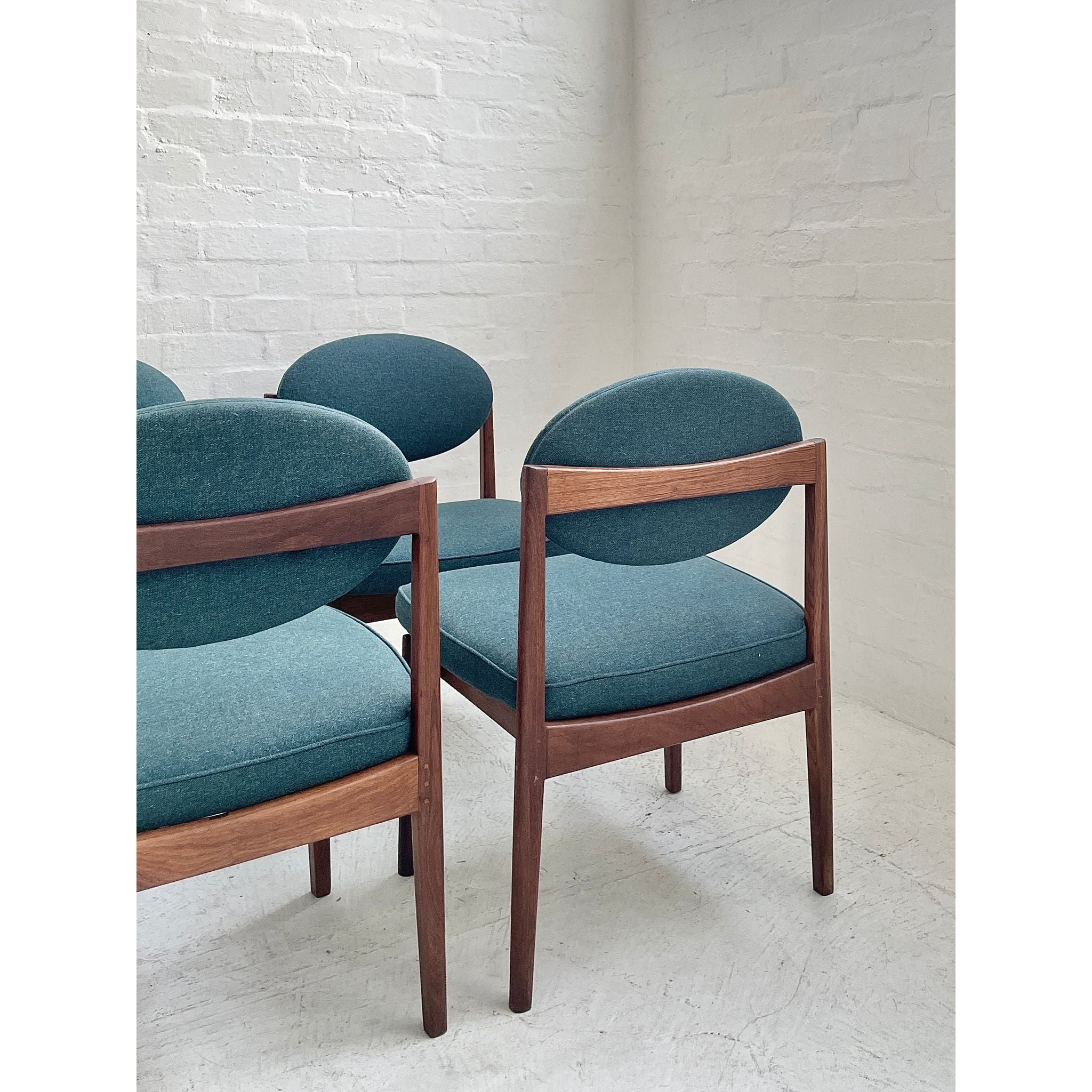 Set of four chairs designed by Jens Risom, produced by William Latchford. In blackbean timber and Instyle wool upholstery.