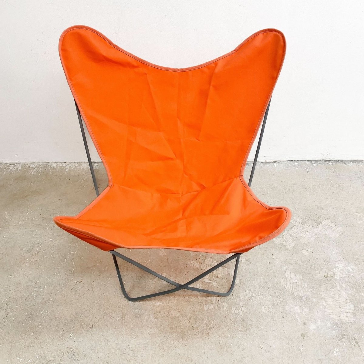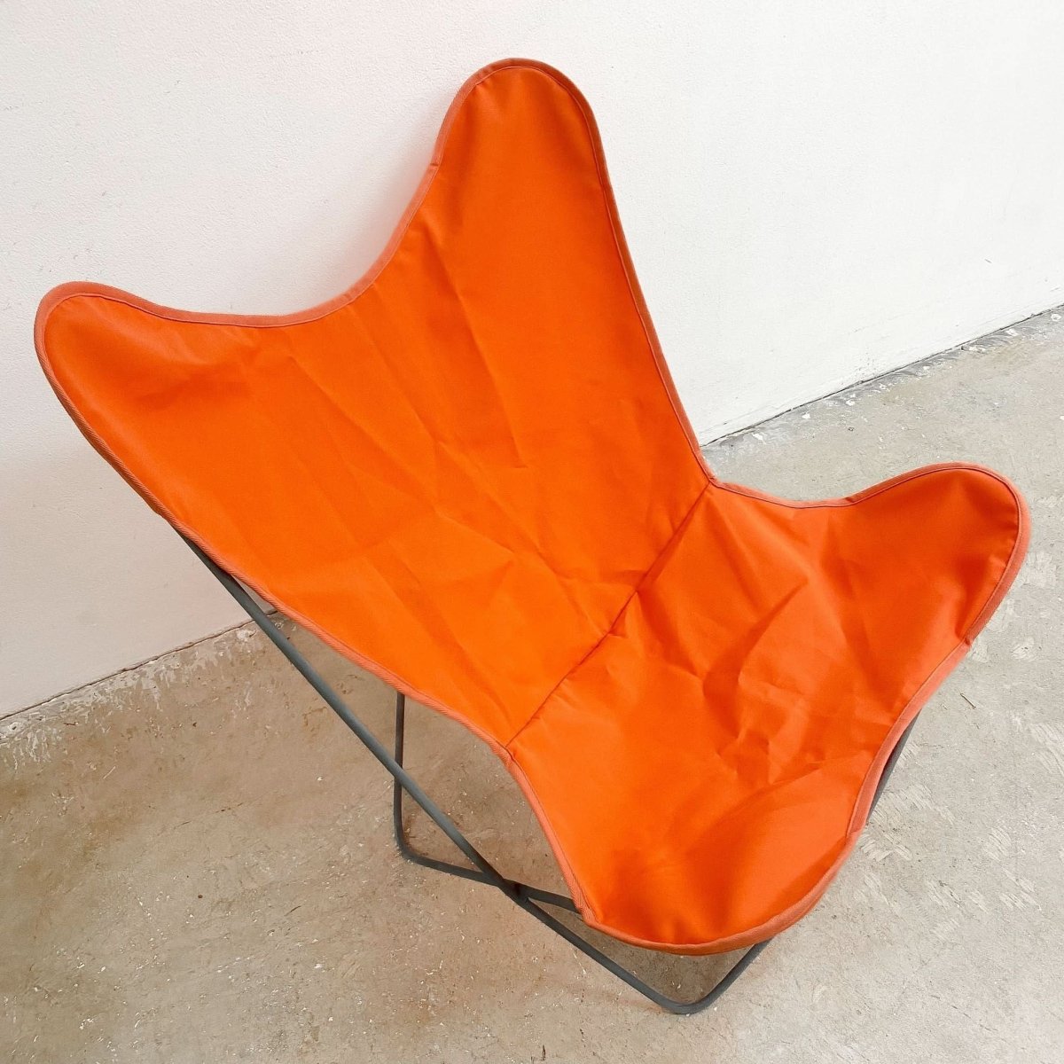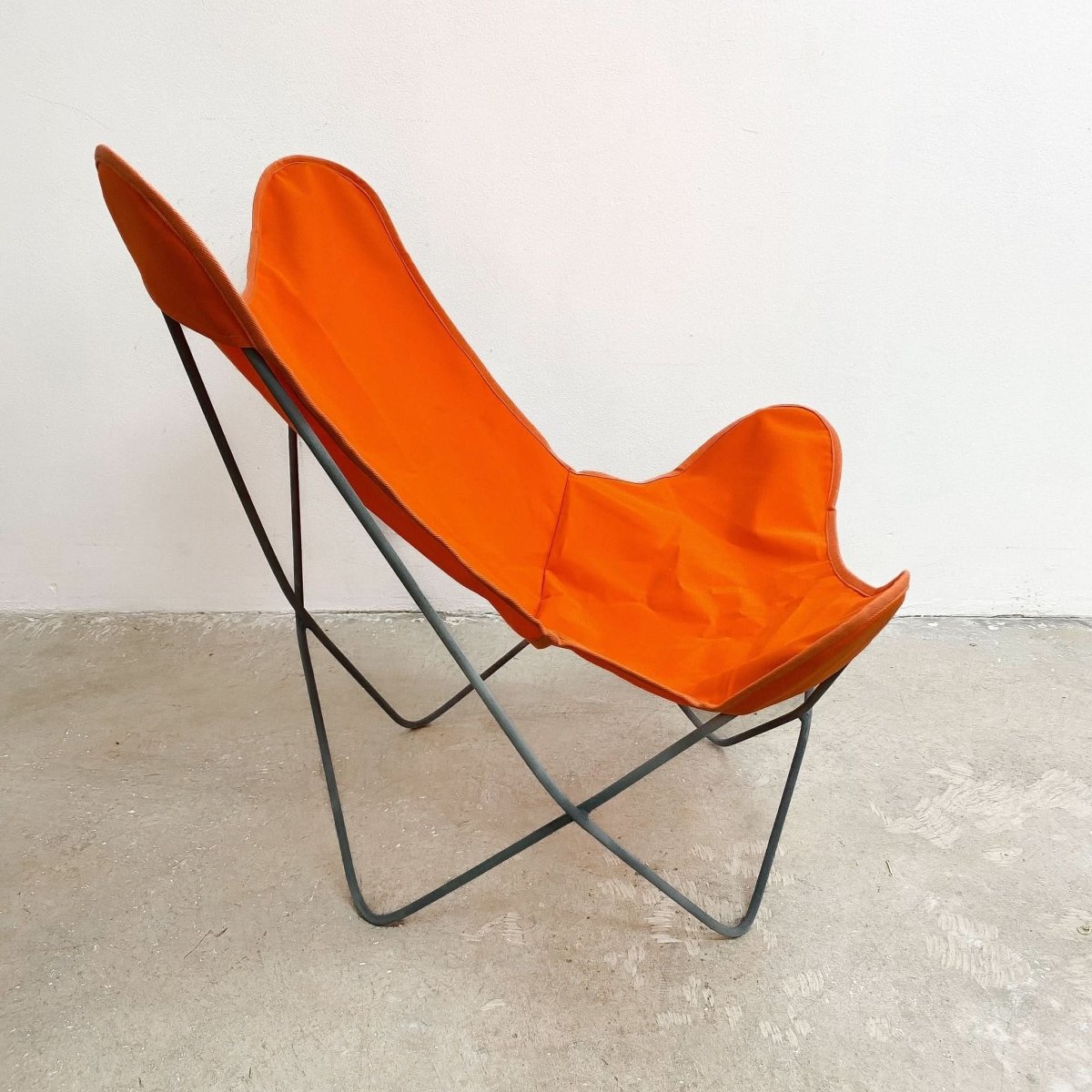 Classic mid century butterfly chair by Descon, with new outdoor canvas cover, available in orange or black. In great condition, frame has been restored.