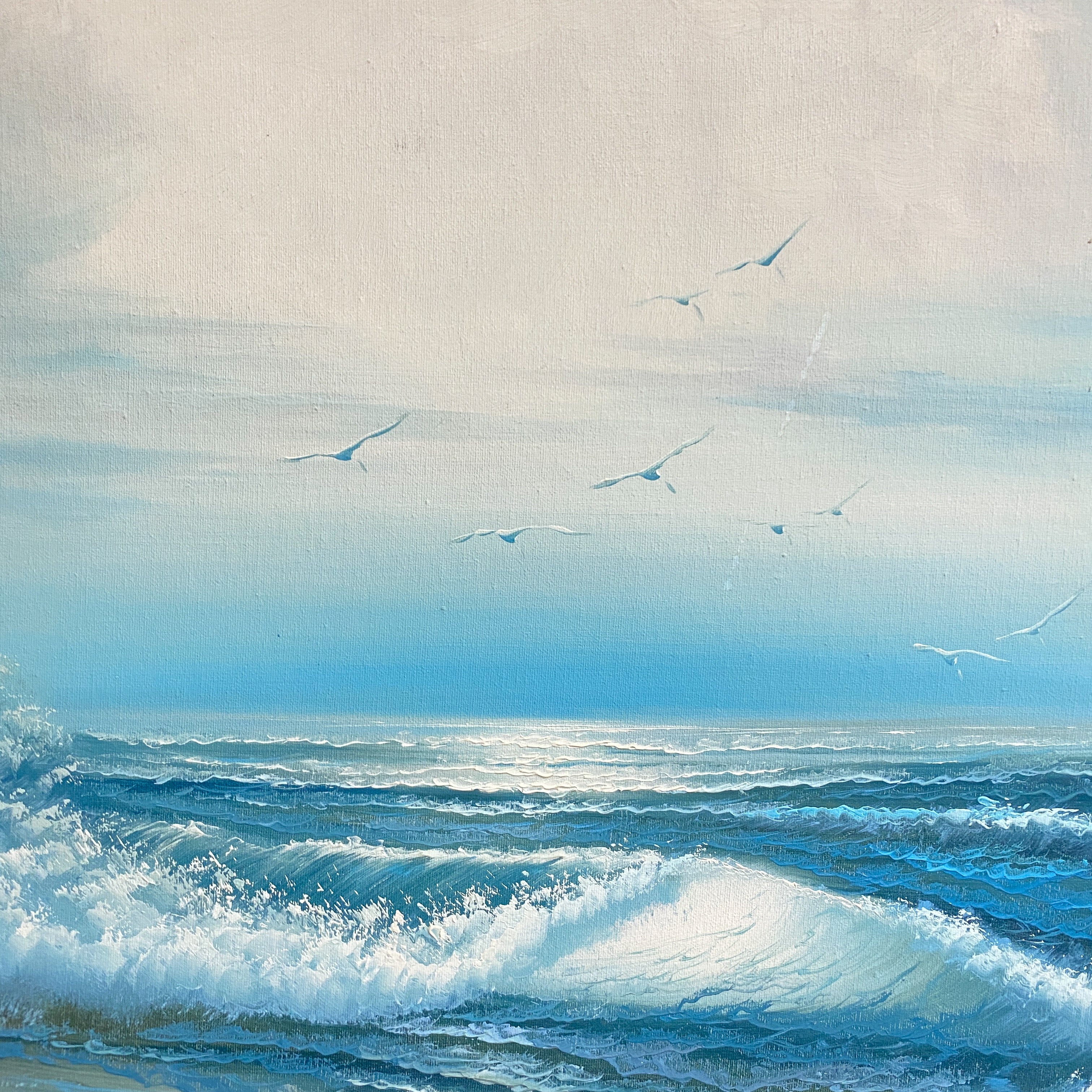Beautifully painted mid century coastal scene of breaking waves, framed