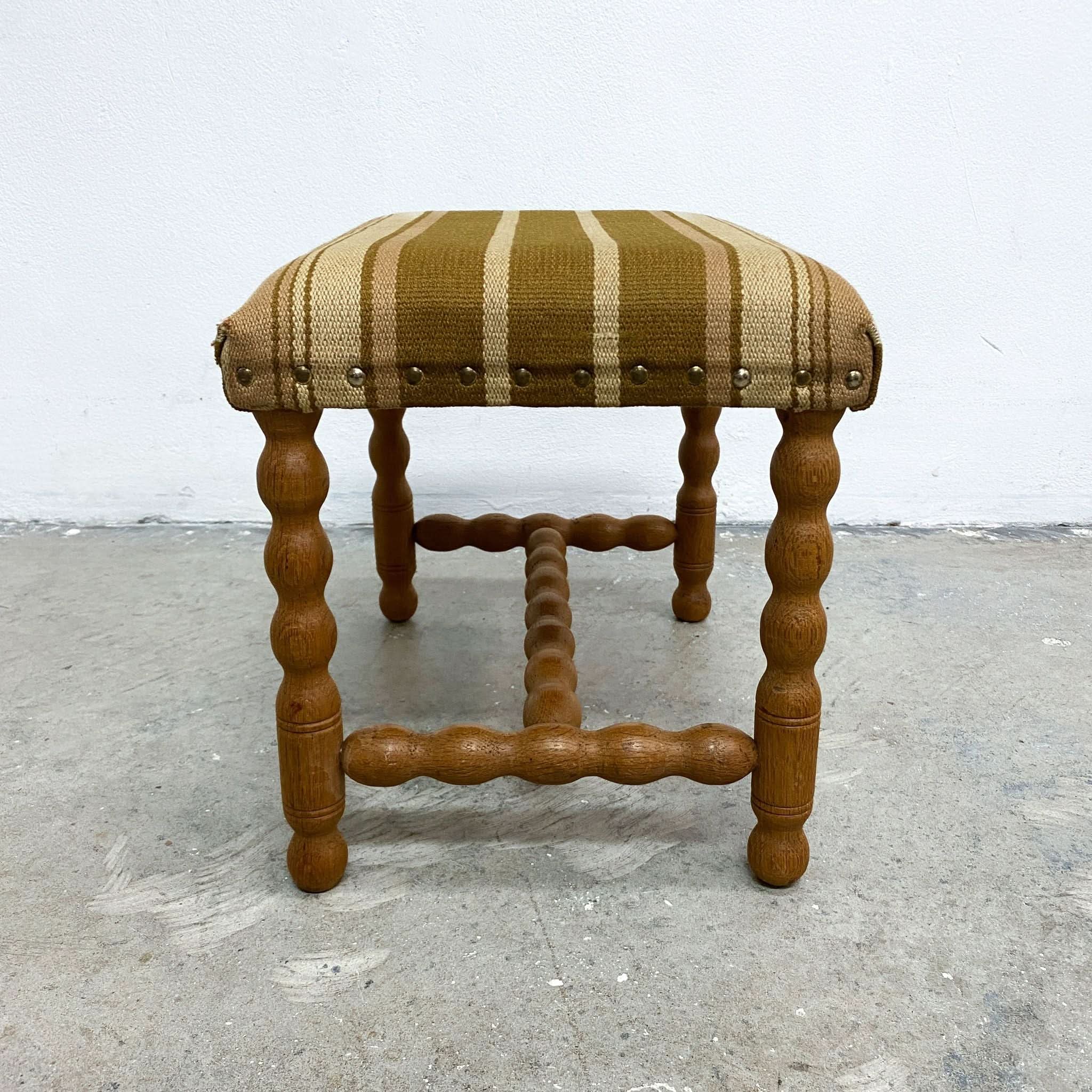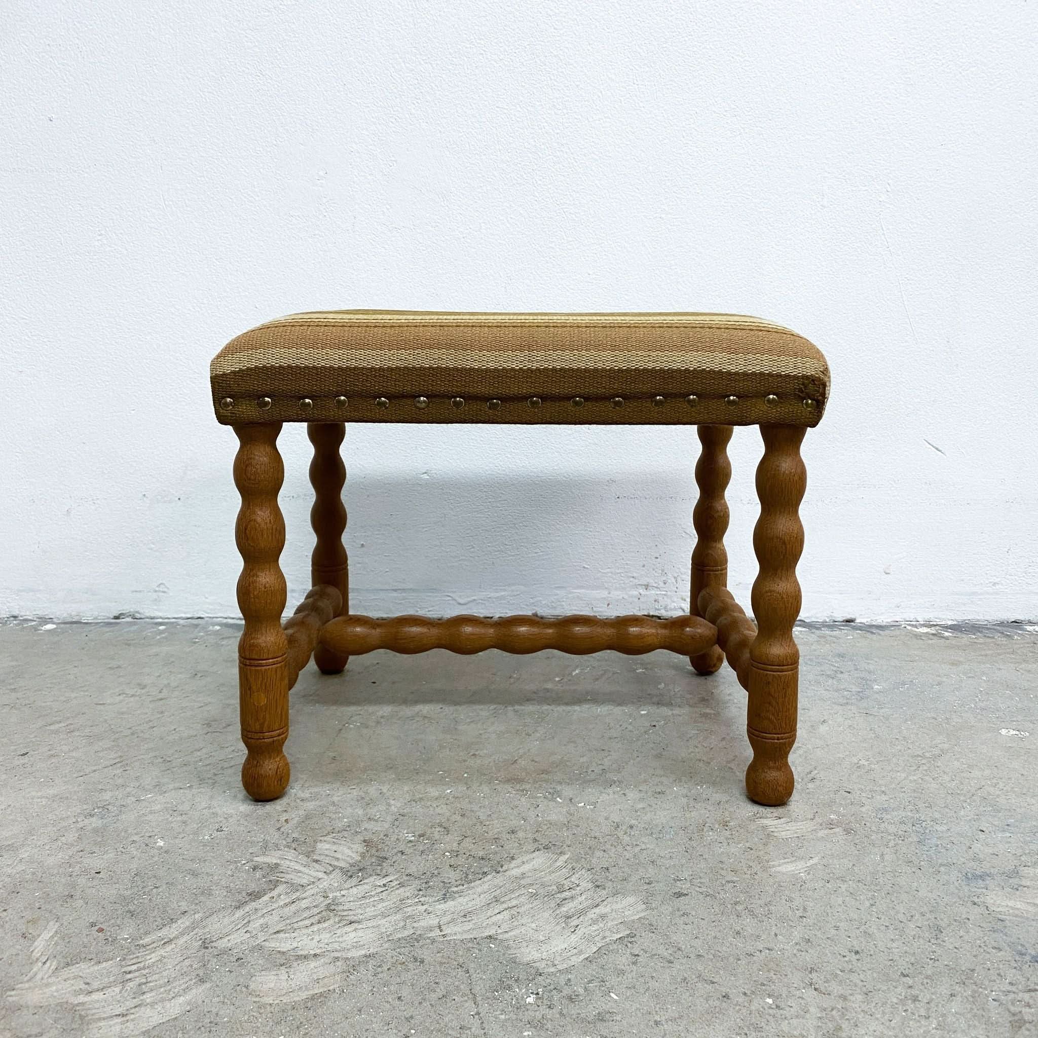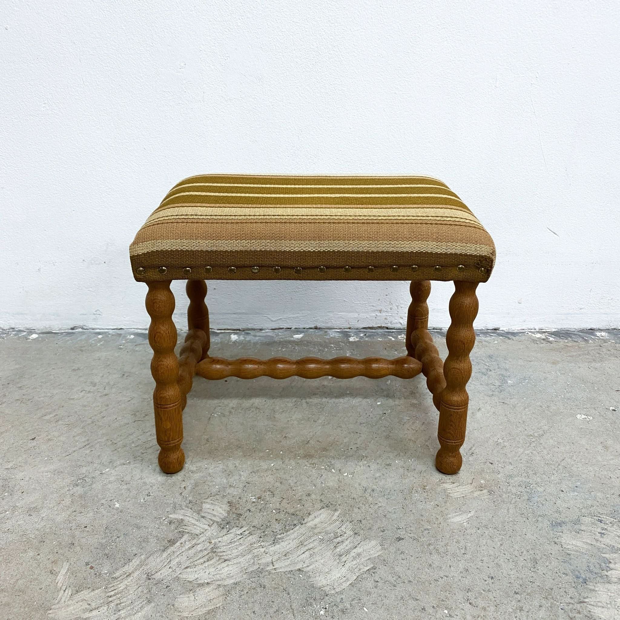 Danish mid century bobbin leg upholstered footstool. Elegant feature element of the Boddin legs reminiscent of the 17th century furniture style which was revived in the 19th century. Bobbin turning is a decorative technique where parts are lathe-turned into ornamental shapes, often resembling bobbins or spools.